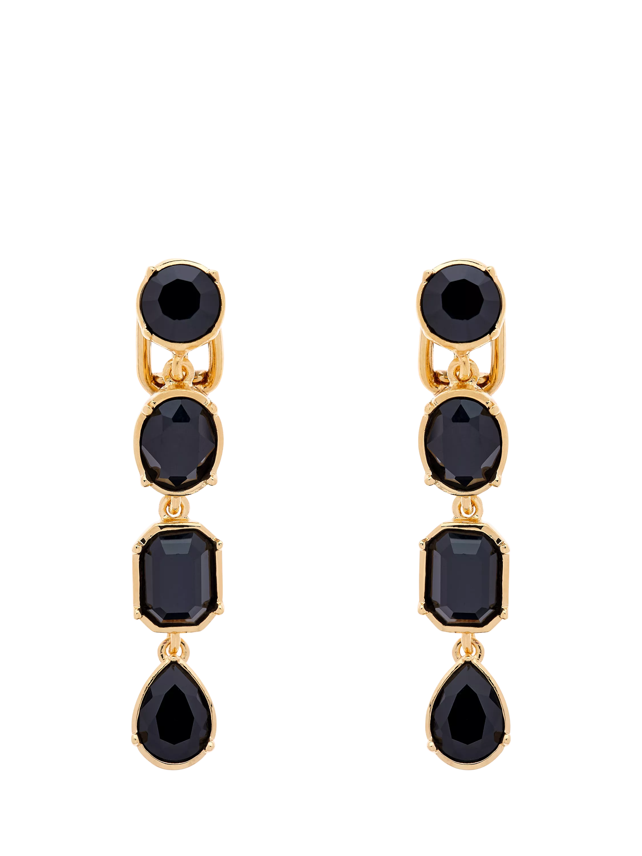 Adorned with multi-faceted jet crystals designed in a drop style, these statement earrings are crated in 24ct gold plating, and are suitable for pierced ears only.