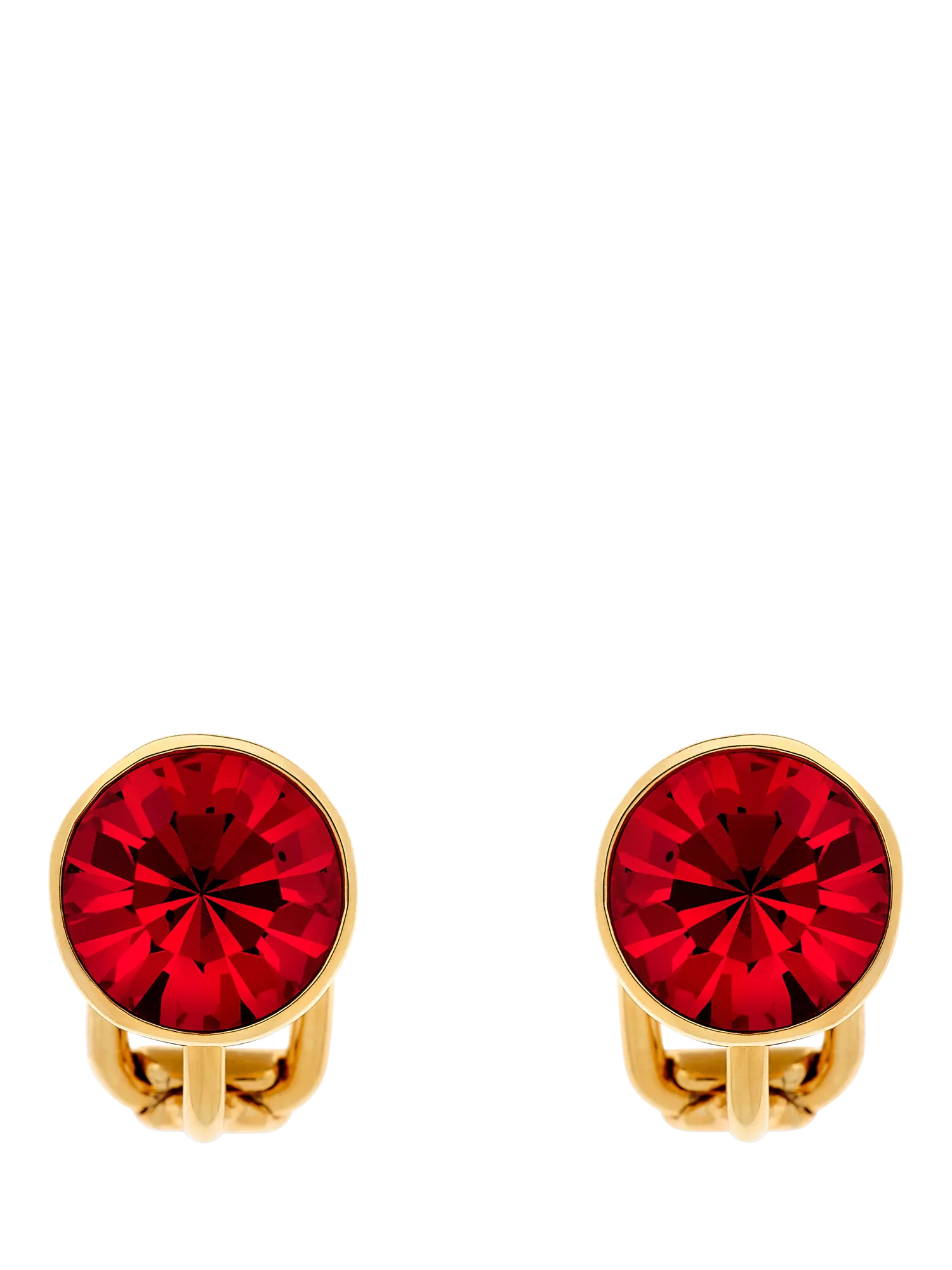Add a pretty pop of colour with these ruby red crystal stud clip on earrings. Set in polished gold plating and finished with a comfort push back fastening, these are perfect for all day or evening wear.