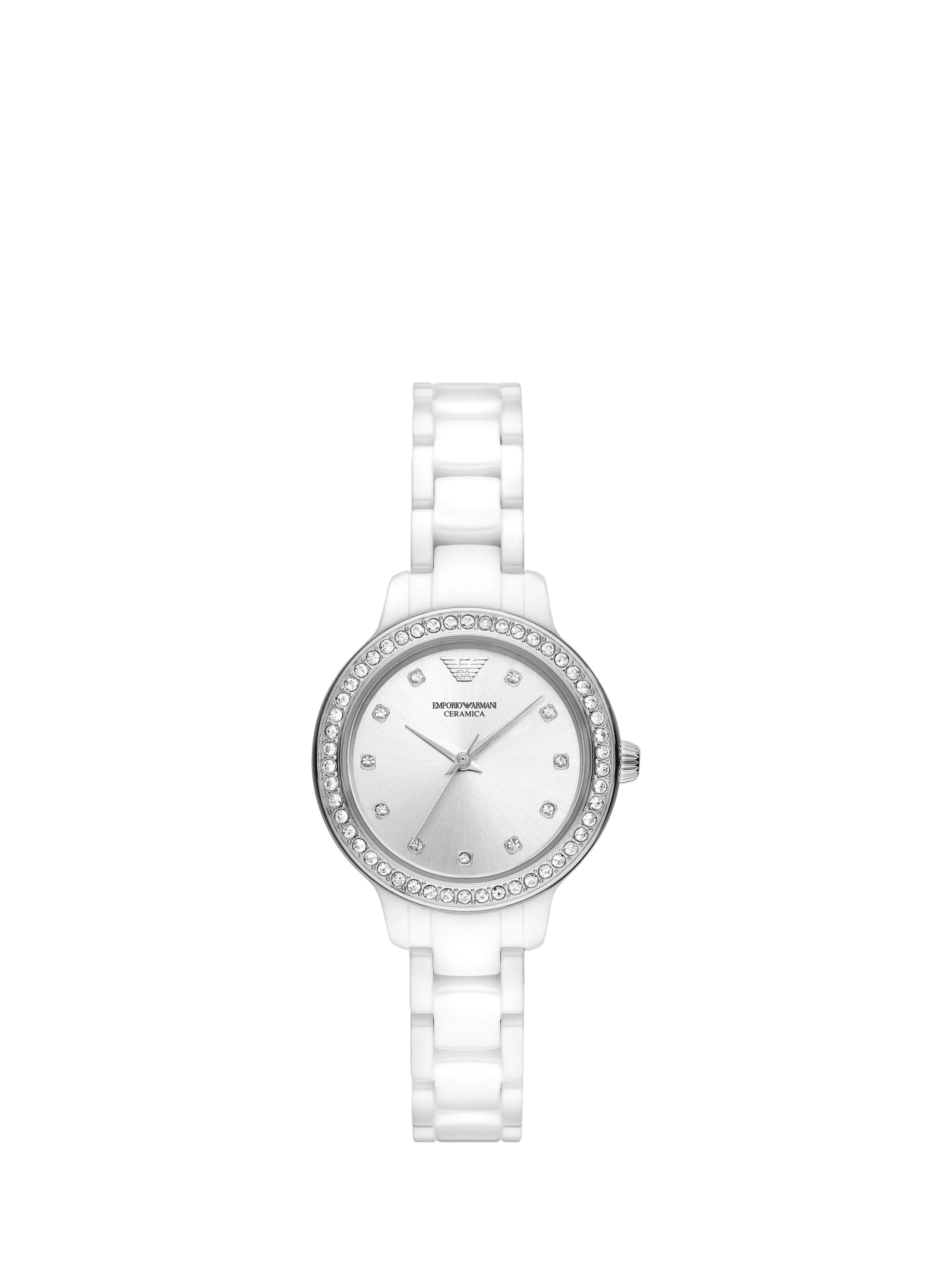 This Emporio Armani 32mm watch features a simple sunray dial adorned with cubic zirconia gemstone hour markers and bezel for a touch of sparkle. It has a three-hand movement and is secured with a ceramic bracelet strap.