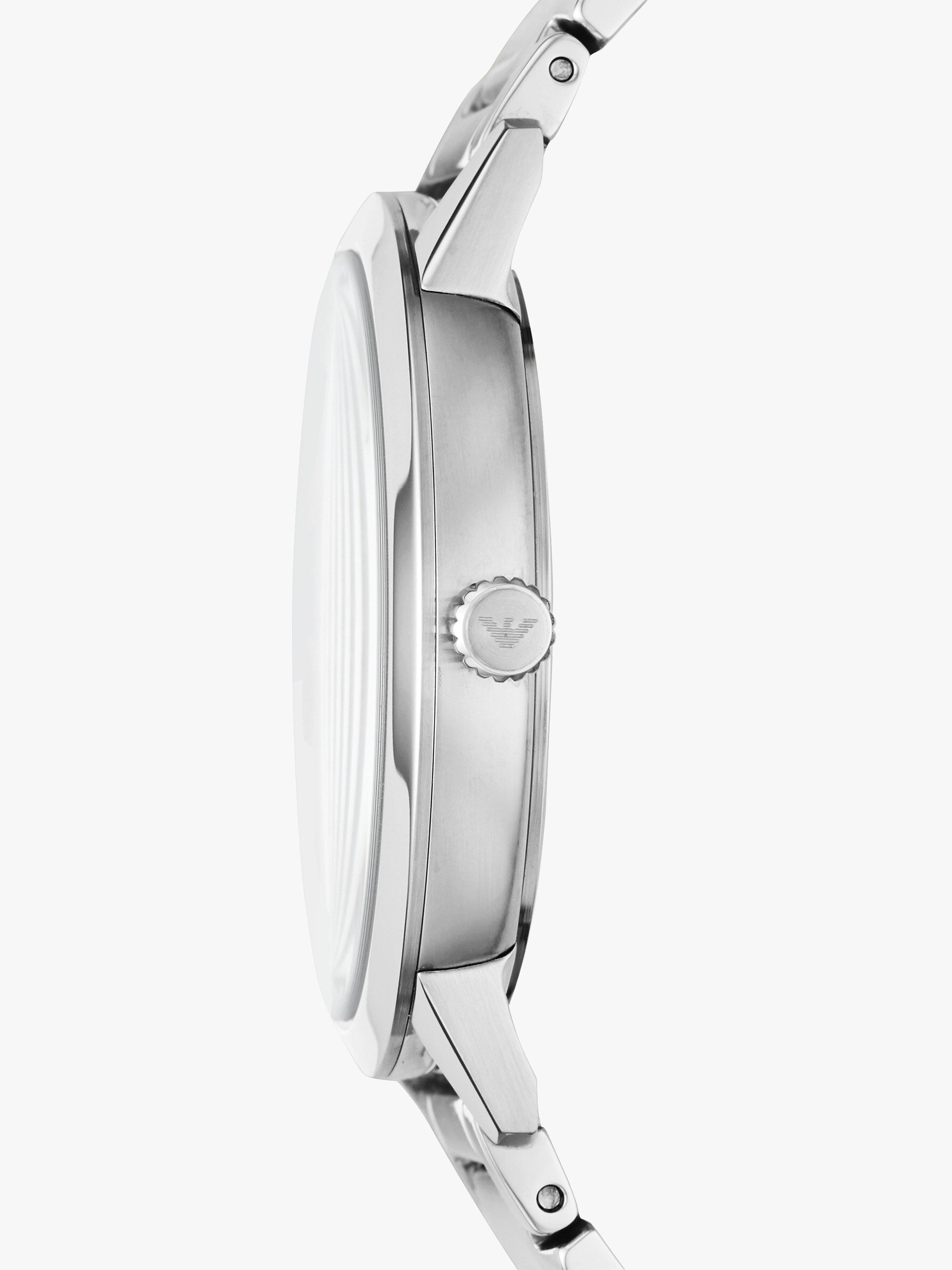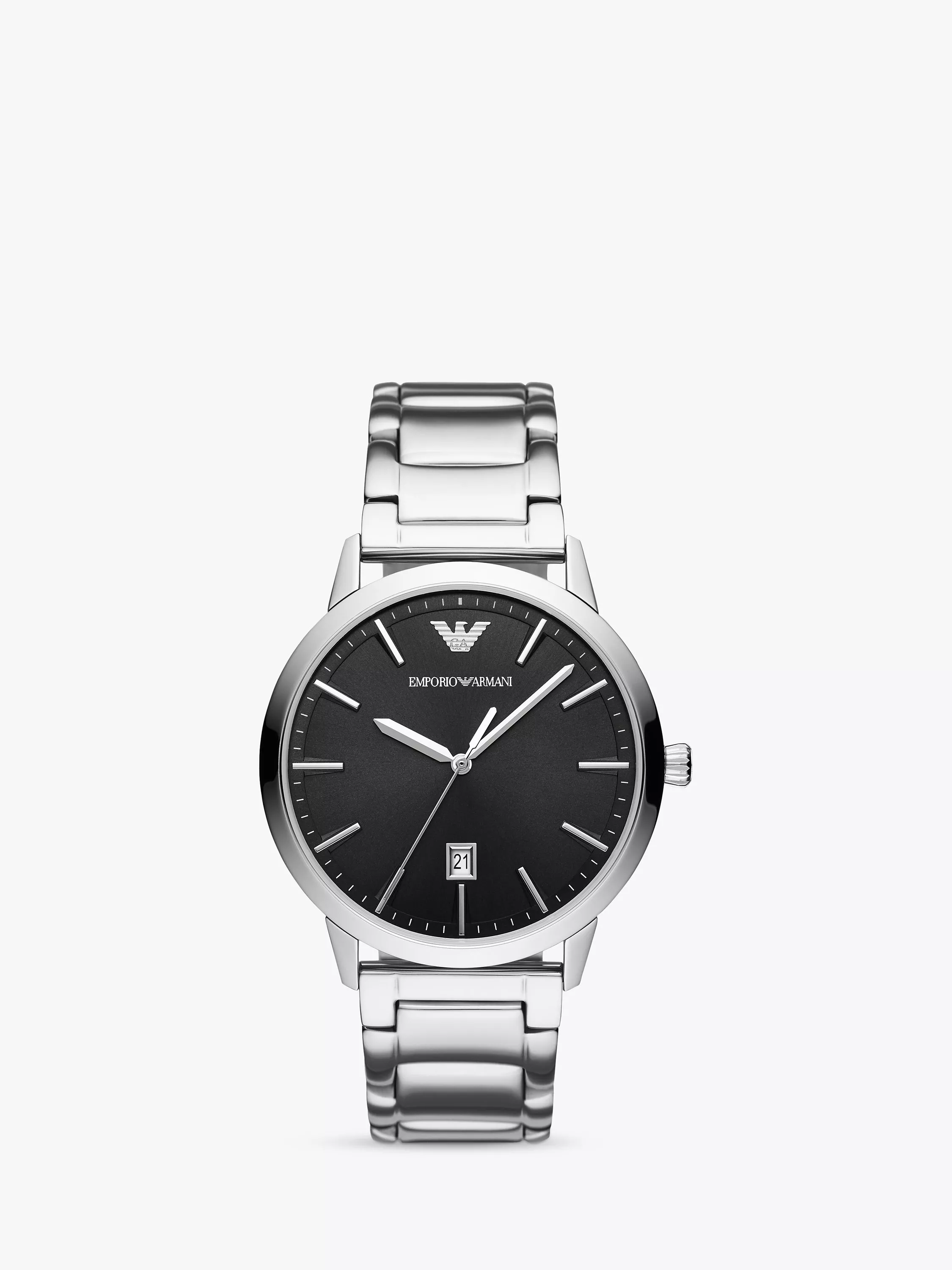 Functional and elegant, this Emporio Armani watch adds a subtle date display that complements the classic hour and minute reading. The dial is cleanly designed for easy legibility. The metal bracelet strap gives a more formal appeal to the wrist in comparison to a leather strap.