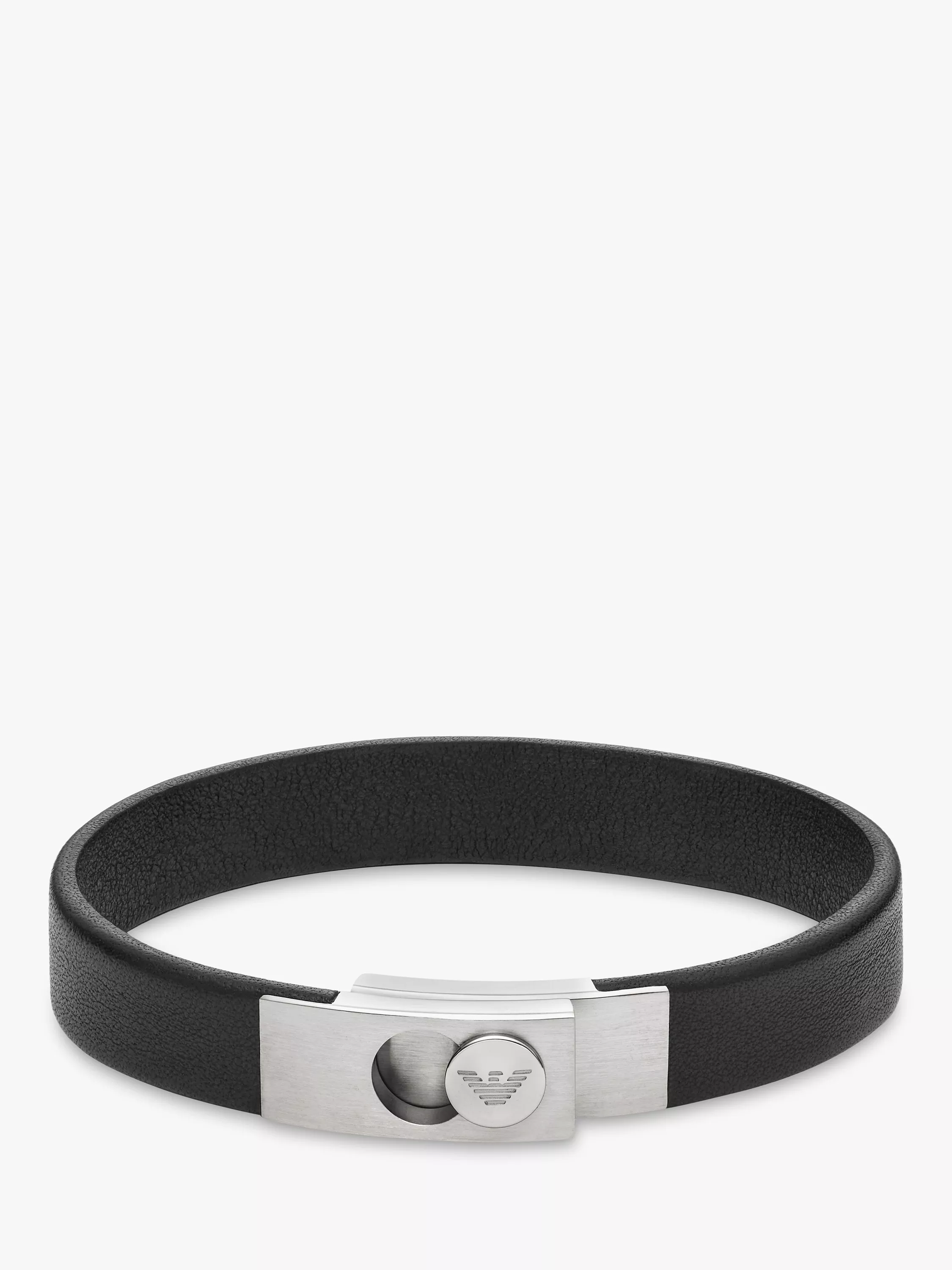 Emporio Armani's strap bracelet features black leather and stainless steel with a clip-on closure.