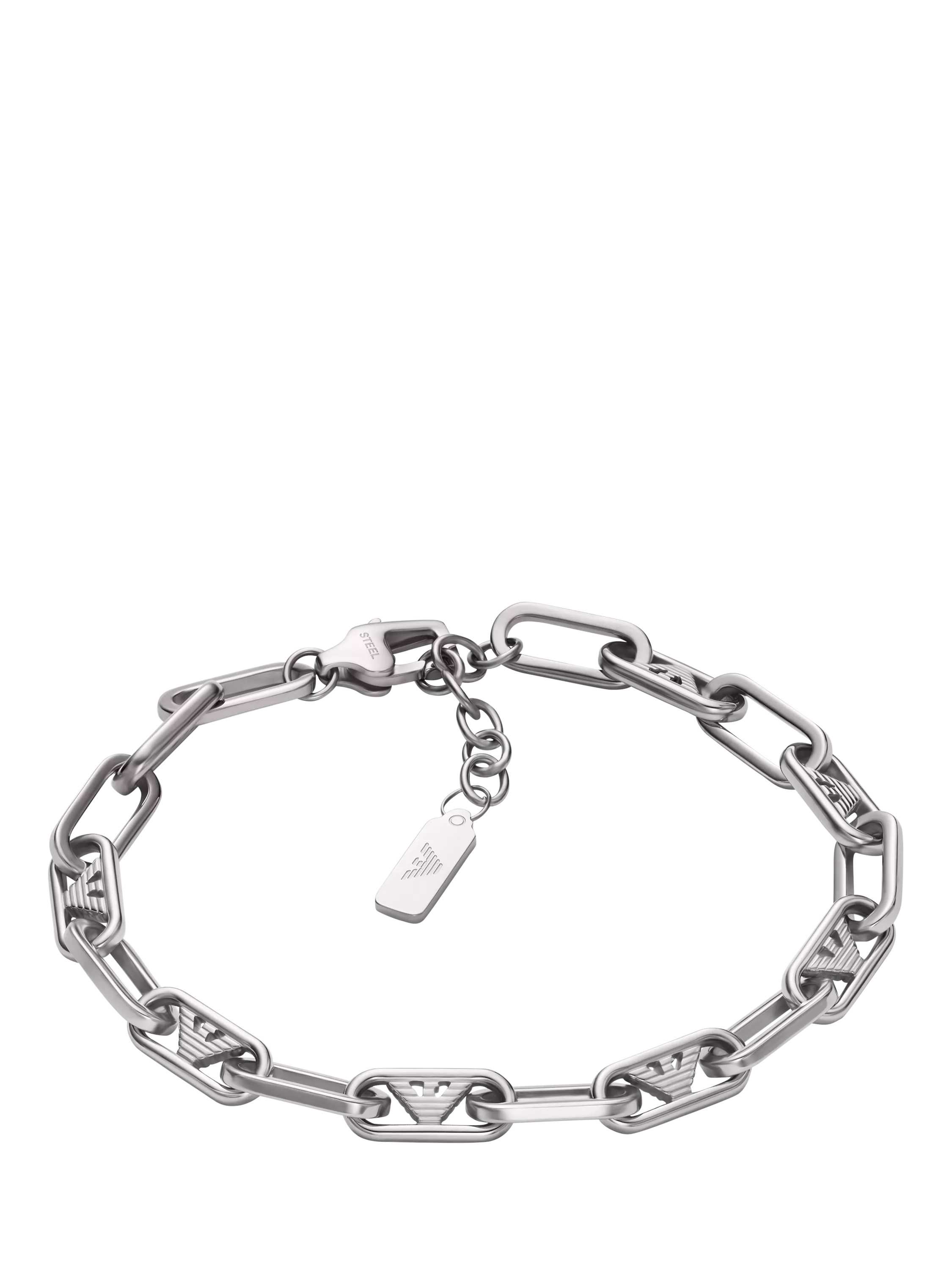 Polished stainless steel forms the foundation of this refined chain bracelet, designed with a modern twist-link silhouette. The silver-tone finish enhances its clean, contemporary appeal, while a secure lobster clasp ensures ease of wear. Thoughtfully crafted with Emporio Armani's signature precision, this understated accessory adds a sleek edge to everyday styling.