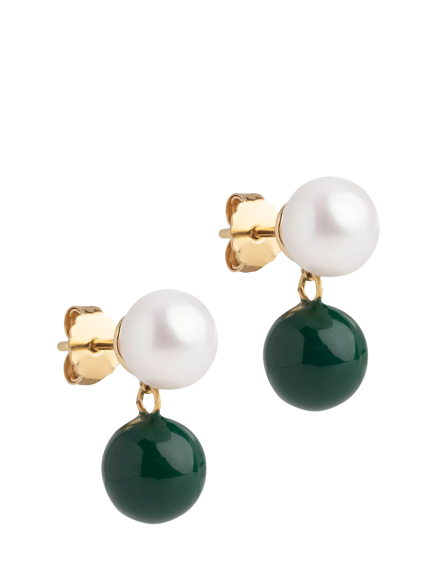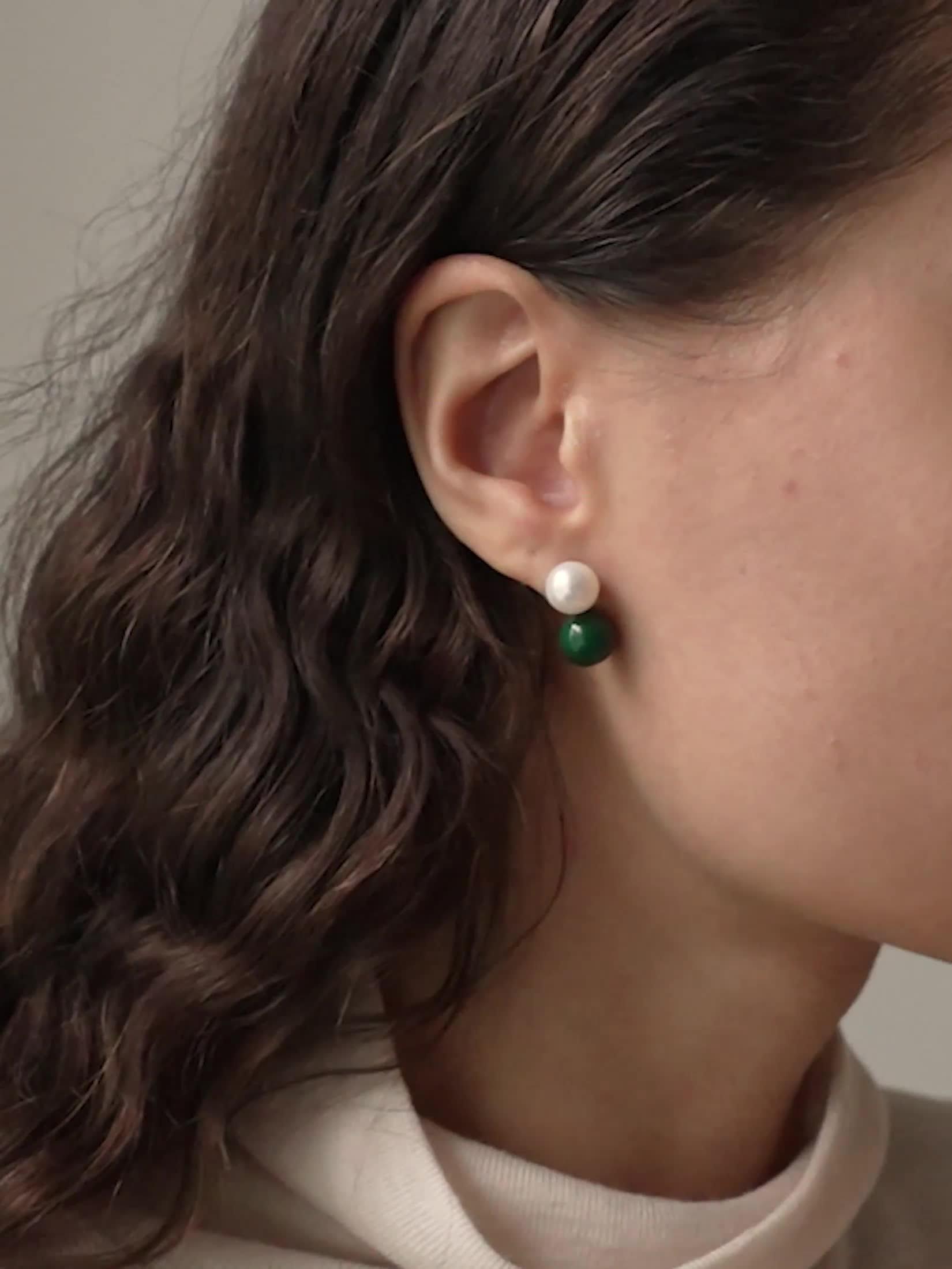 The Columba Stud is an elegant and modern interpretation of the pearl earring. A classic white freshwater pearl is positioned on the ear, while a hand-painted enamel ball hangs beautifully below. Perfect for those who love a timeless look with a twist. Suitable for pierced ears only.