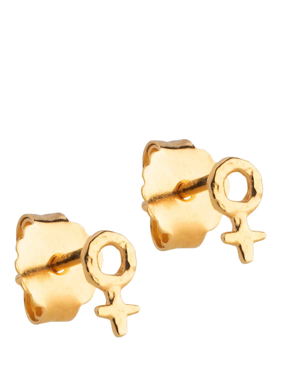 These studs represent a pair of small female symbols, discreetly celebrating women's strength, wisdom, and beauty, a celebration of feminine power that inspires and enlightens the world. The surface of the earring has a beautiful handmade texture that is diverse and organic, just like women all over the world.