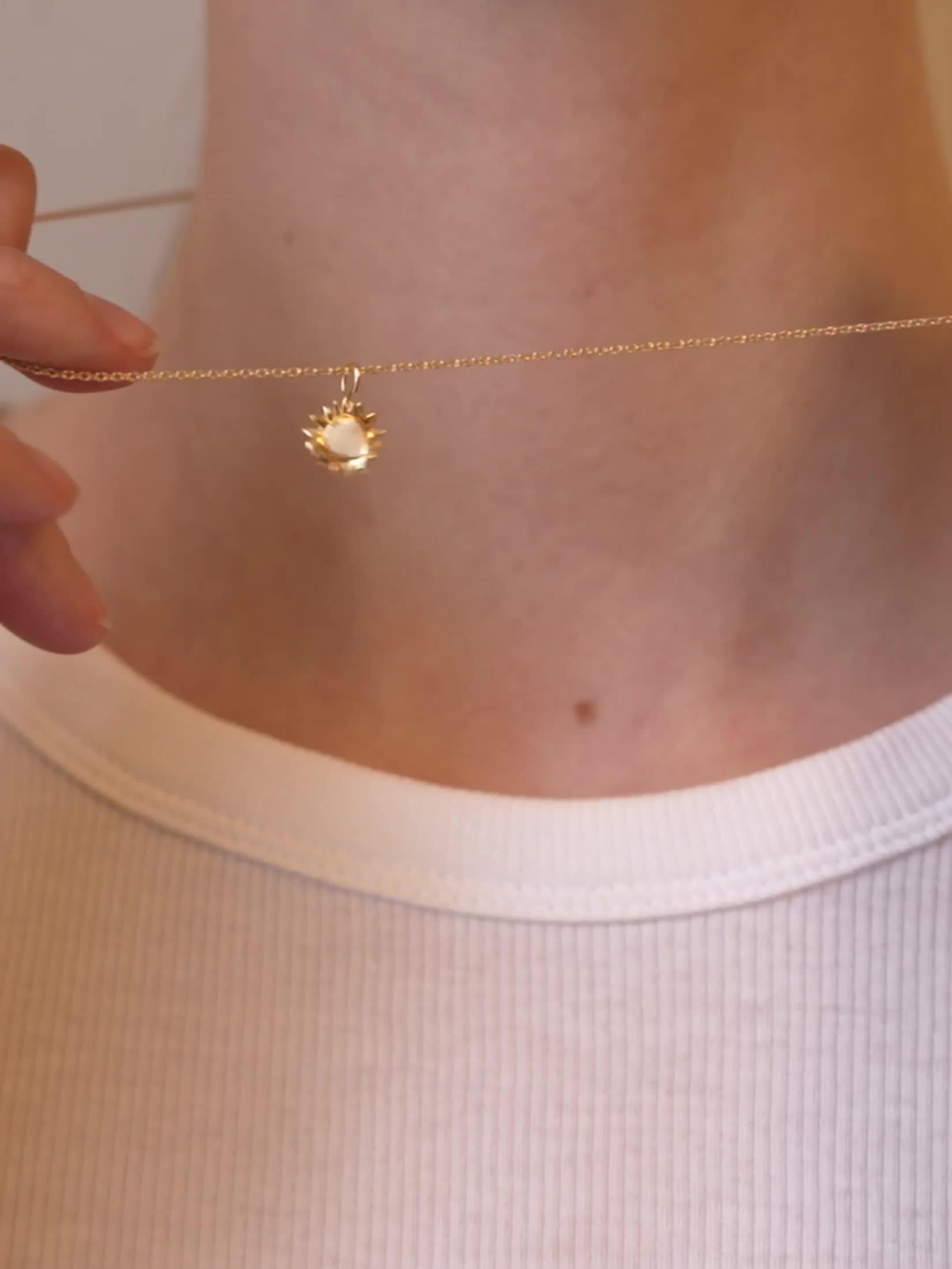 The Sunshine necklace is for the calm, sweet person who has a big heart and a loyal character. A perfect gift idea for the person who brings a smile to your face. The pendant of the necklace depicts a sun or a sunflower, depending on the eyes looking at it, and has a classic yet different expression. The design is handmade, and the enamel is applied by hand.