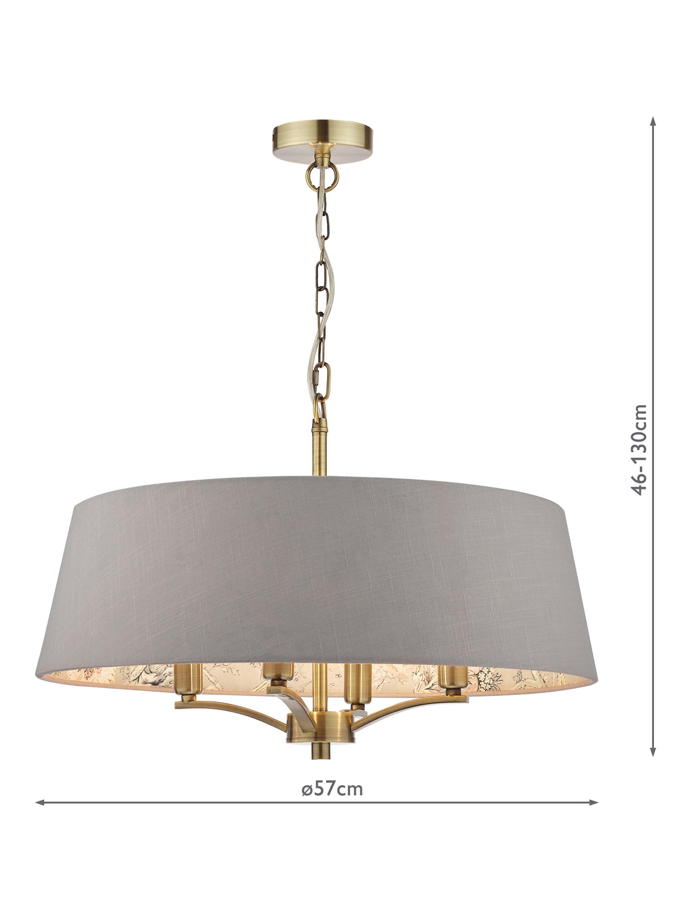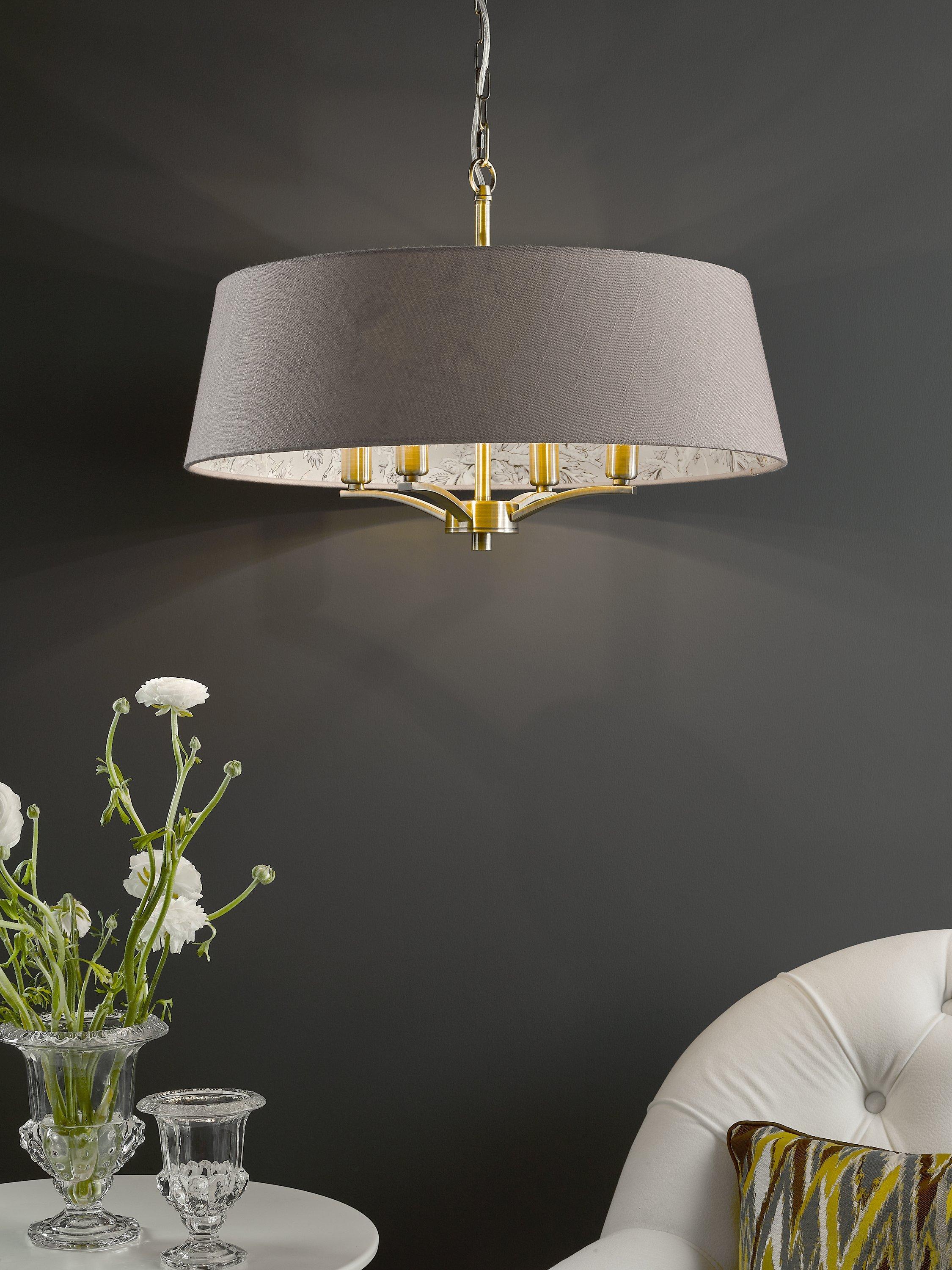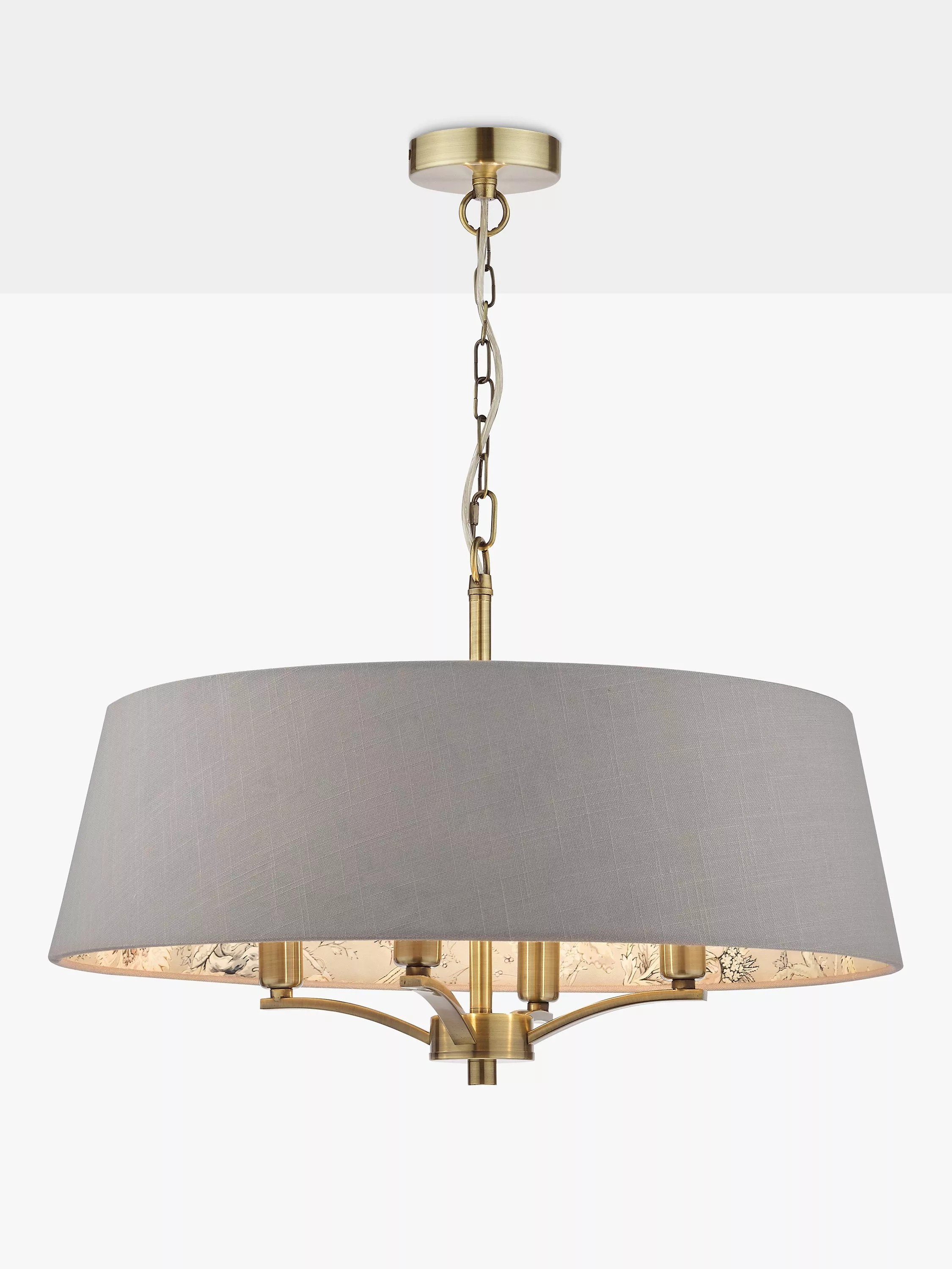 It is featured here in more earthly tones on the interior of the Birch 4-light Pendant in antique brass with a complementing taupe linen exterior. Suspended by one metre of chain, which is height adjustable on installation.