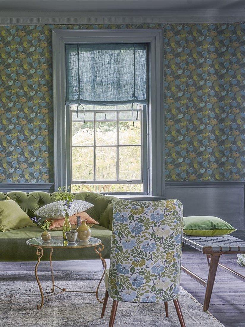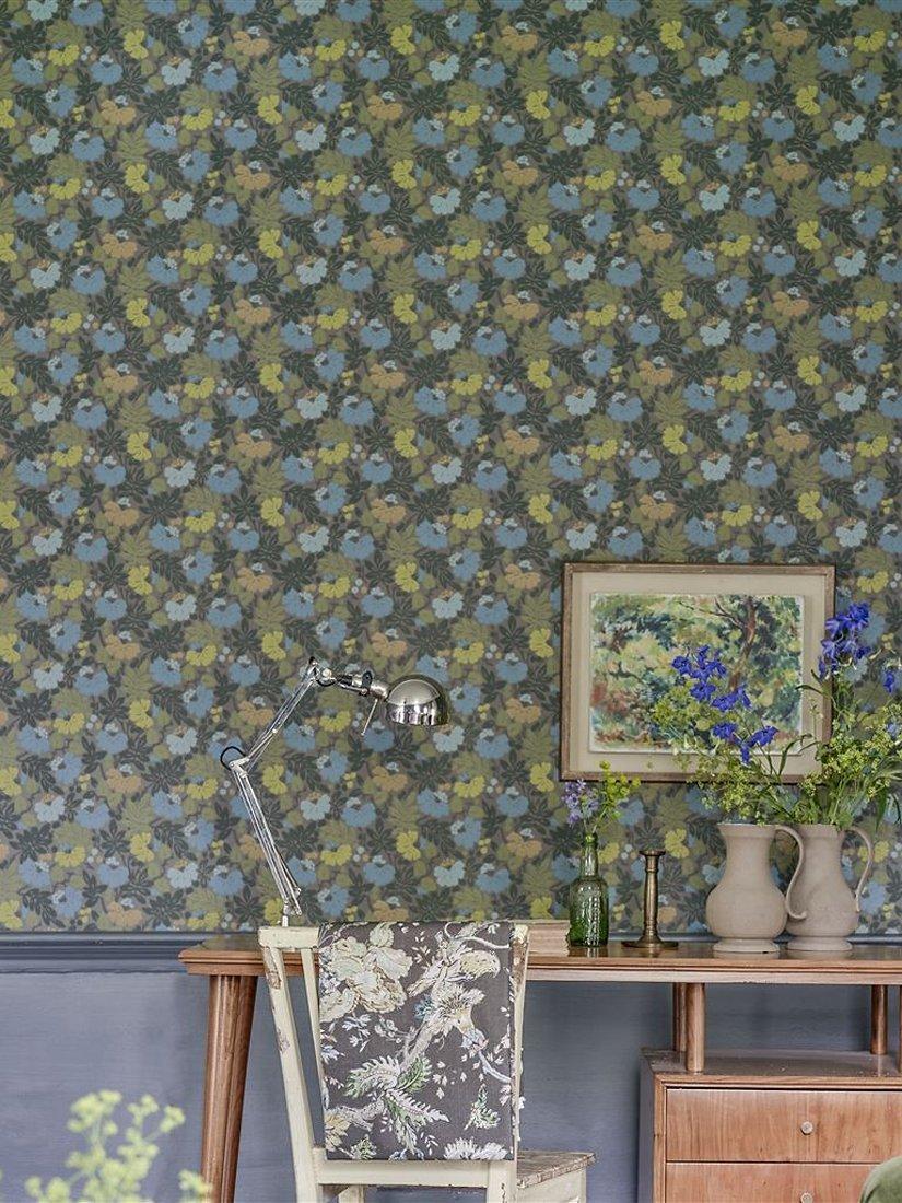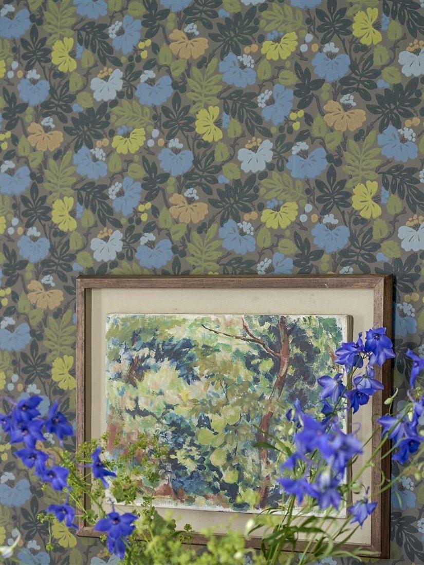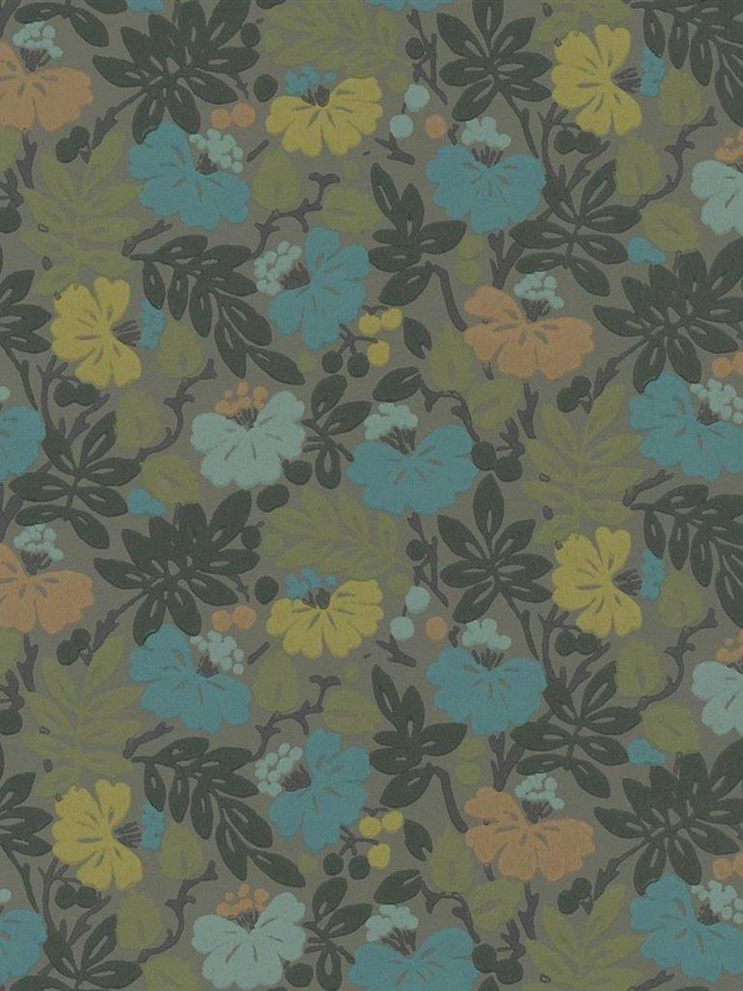 A multi-coloured block print style design, featuring flowers and leaves in all-over form. Traditionally surface printed onto a heavyweight non-woven ground for ease of hanging.