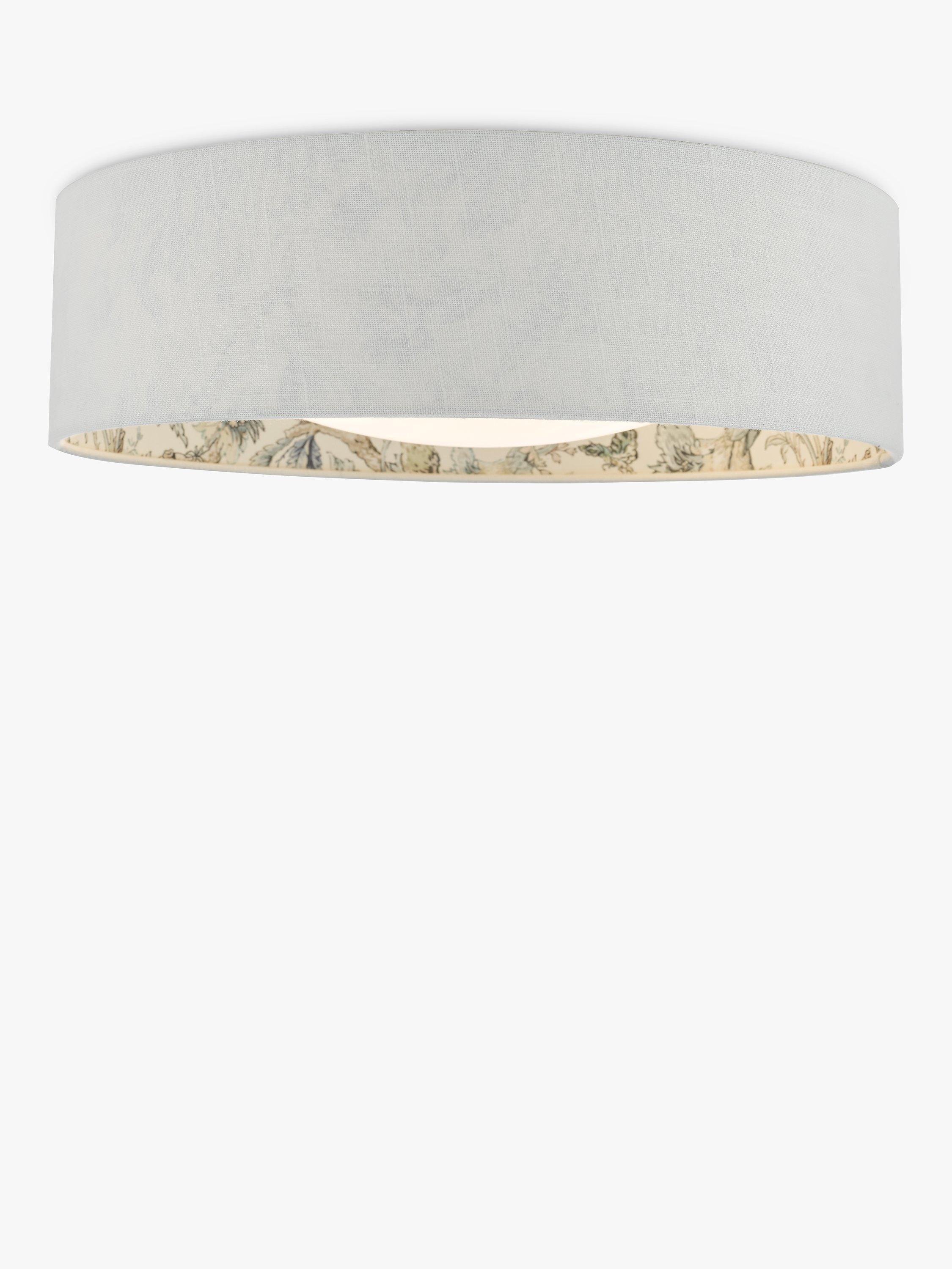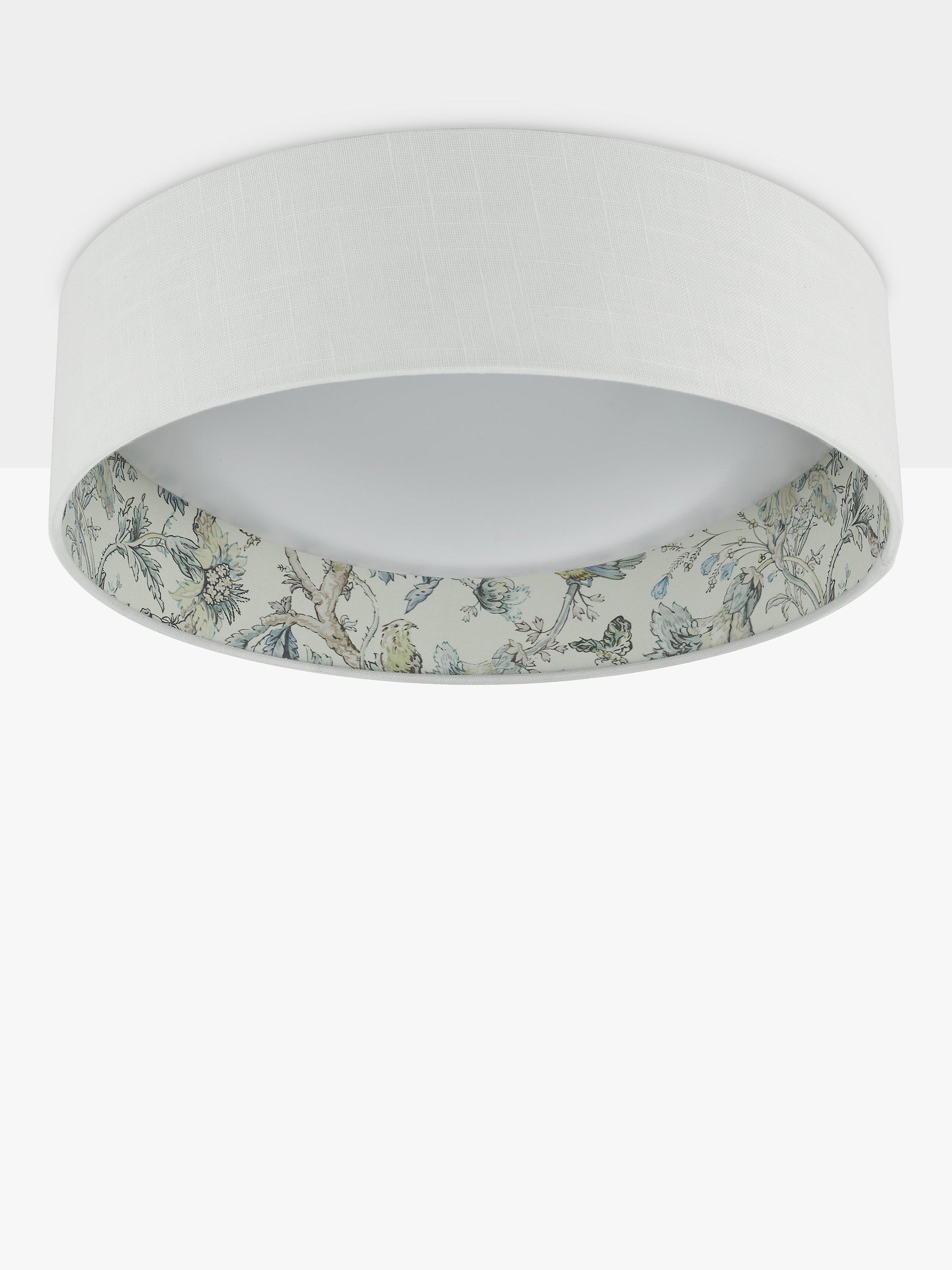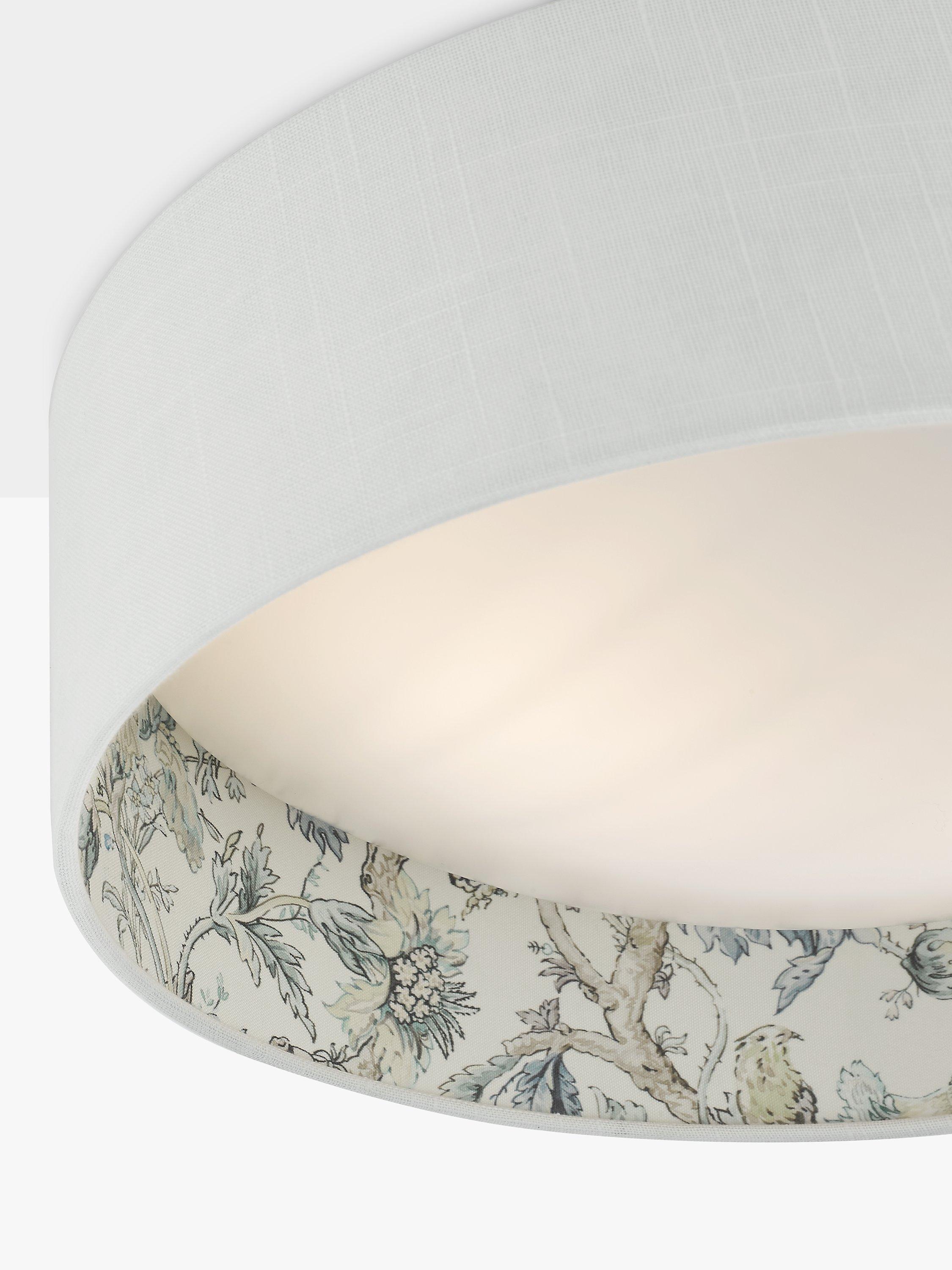 The pattern in this collection draws inspiration from wallpaper found in the entrance hall of Crowe Hall, Suffolk. With extensive archival design work done by Designers Guild, this flowing floral print has been brought back to life. It is featured here on the interior of the Delft 2-light flush ceiling light with a complementing ivory linen exterior.
