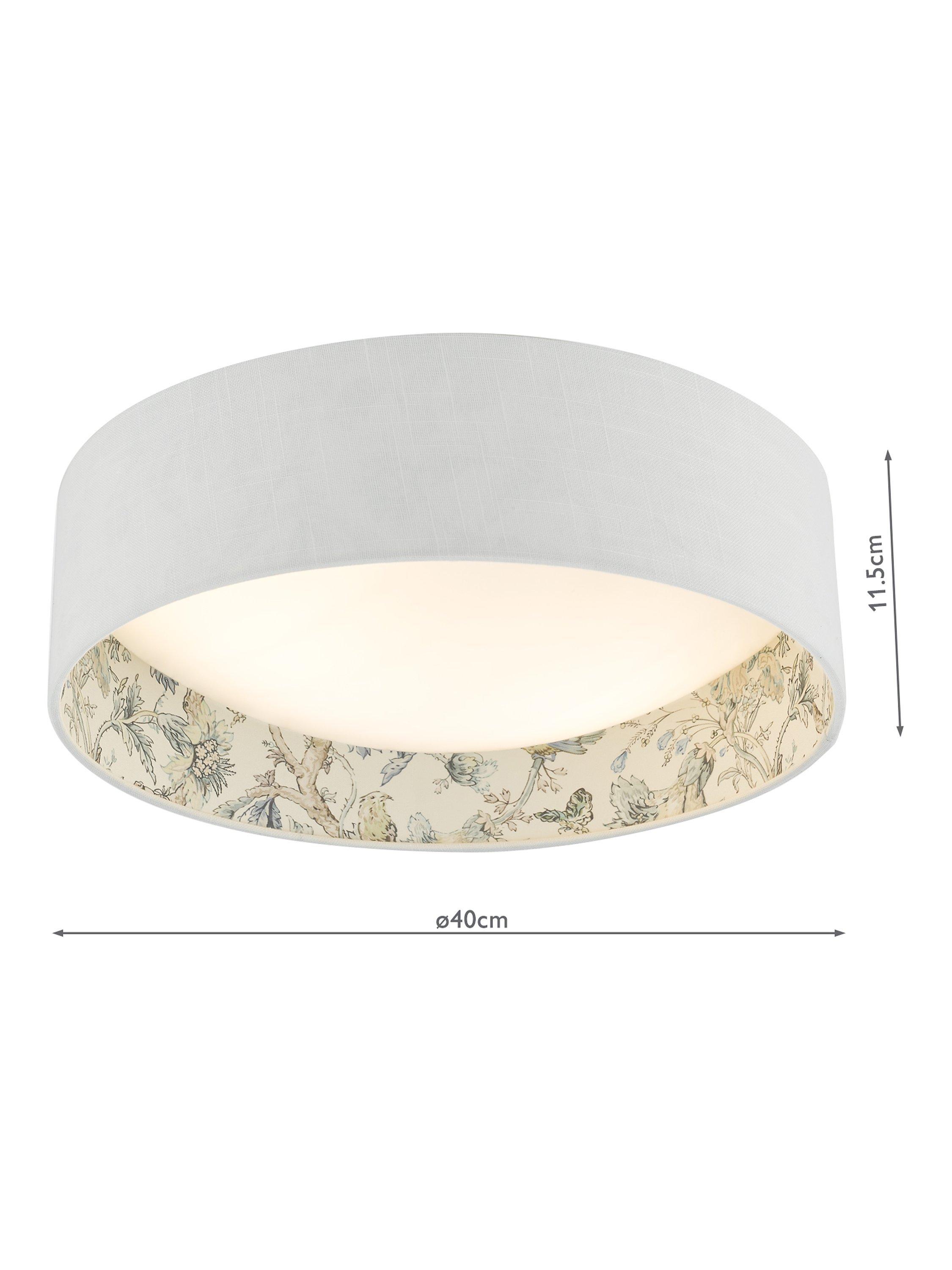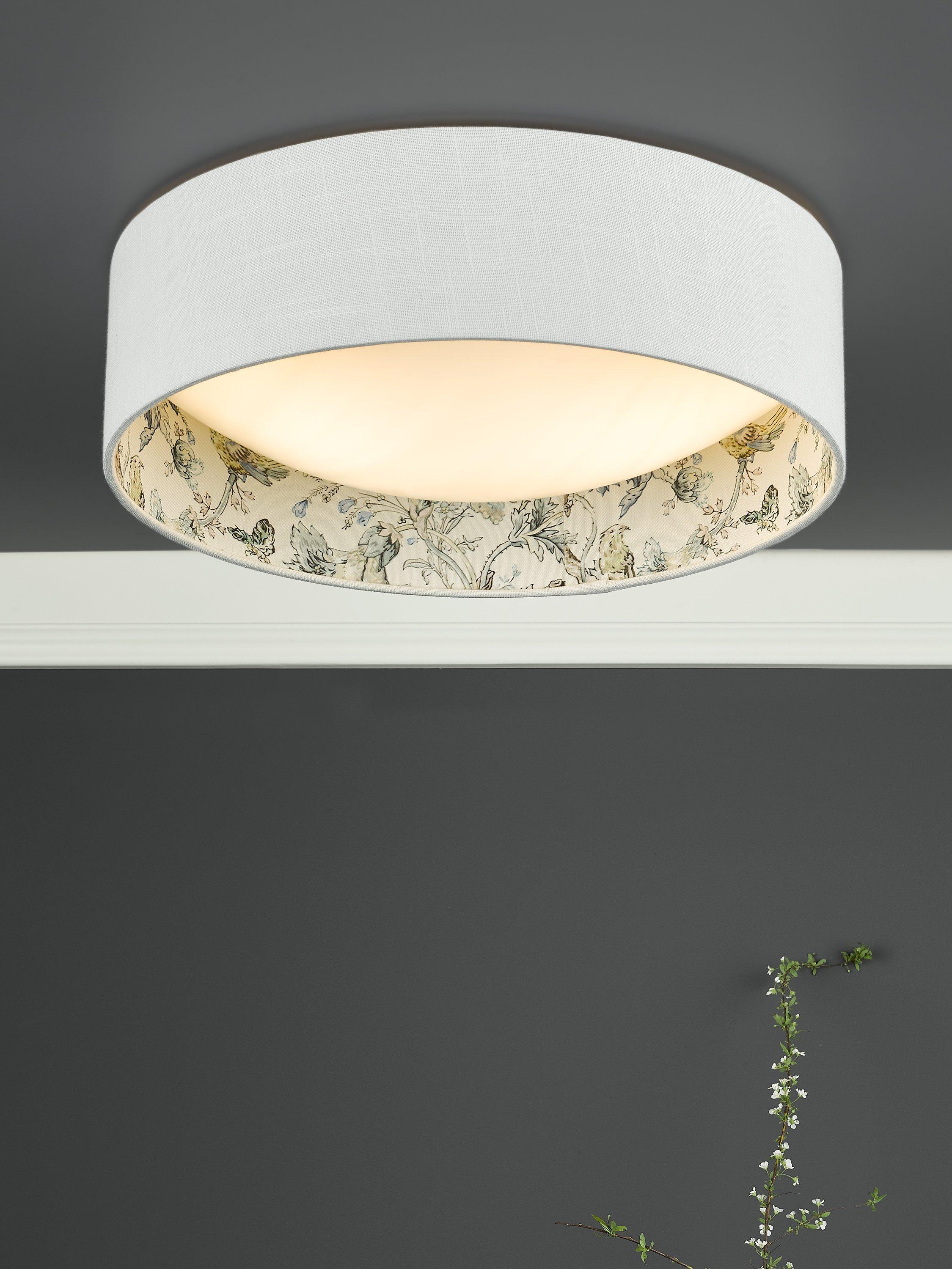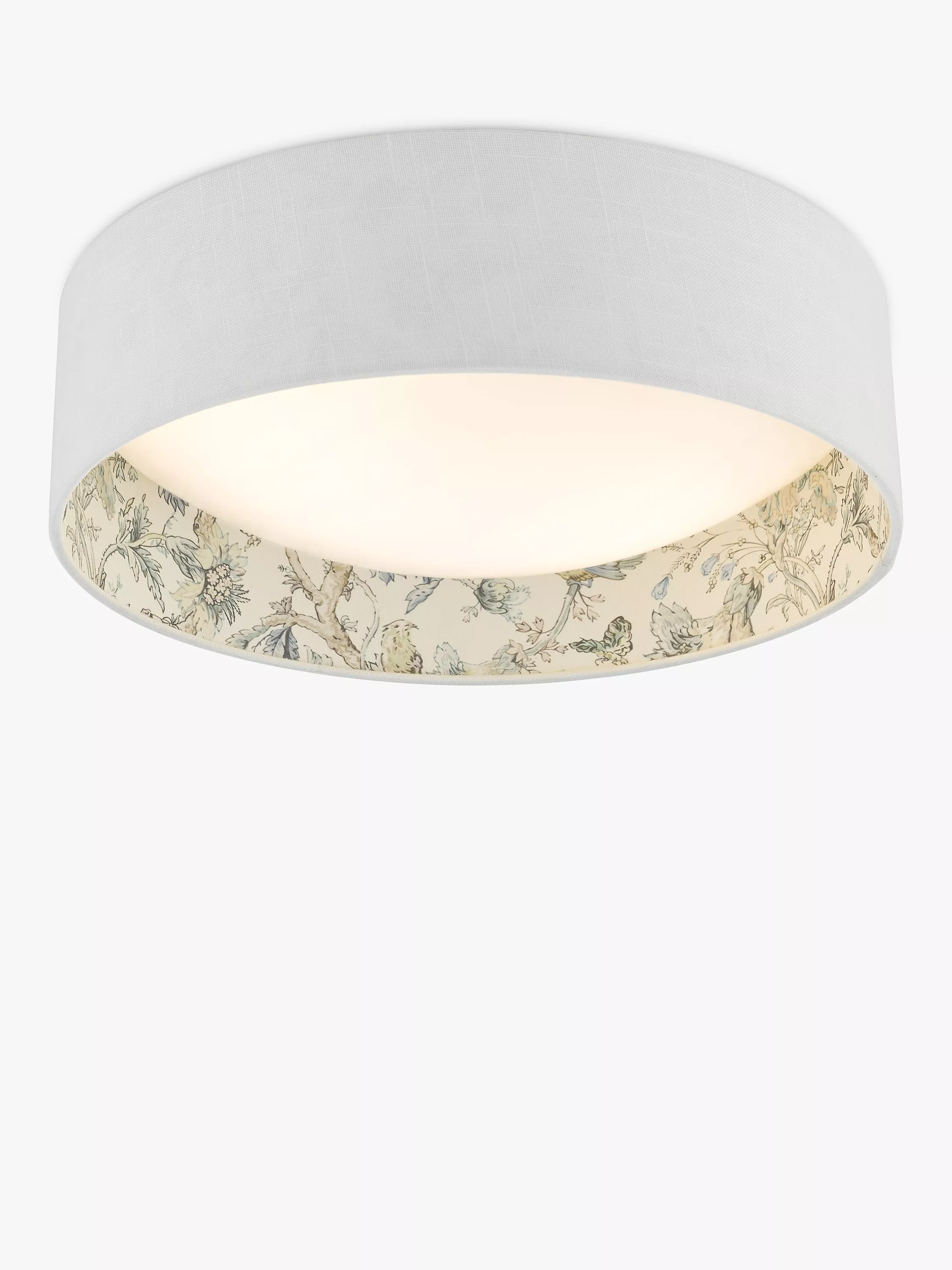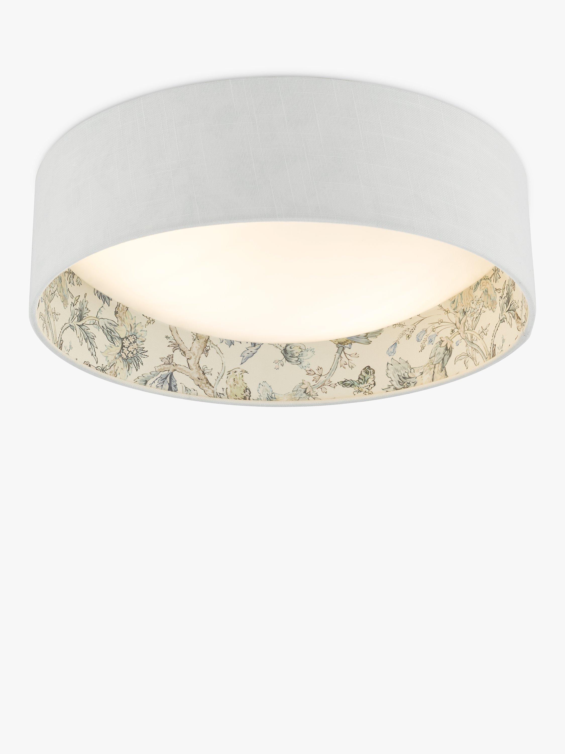 The pattern in this collection draws inspiration from wallpaper found in the entrance hall of Crowe Hall, Suffolk. With extensive archival design work done by Designers Guild, this flowing floral print has been brought back to life. It is featured here on the interior of the Delft 2-light flush ceiling light with a complementing ivory linen exterior.