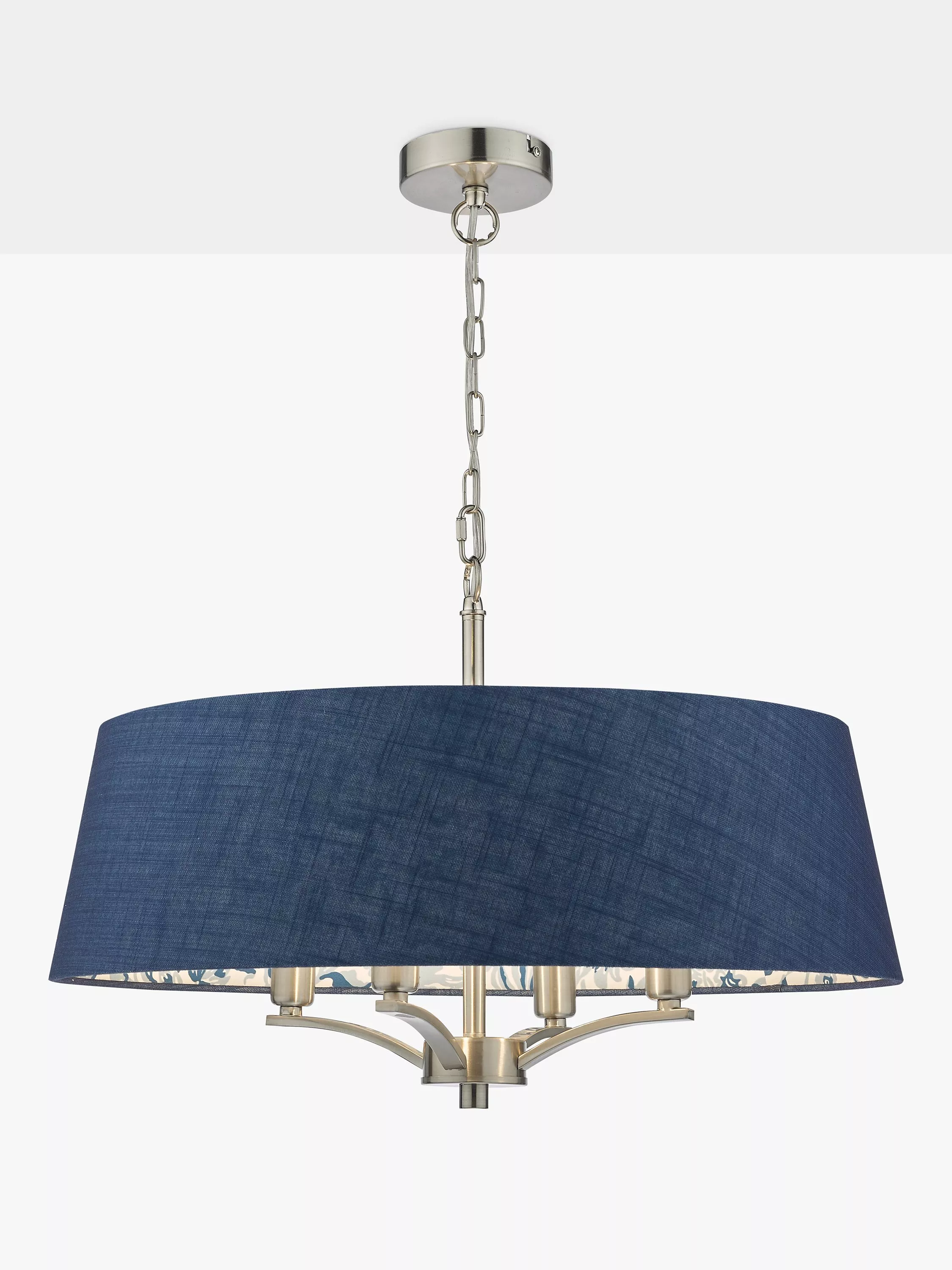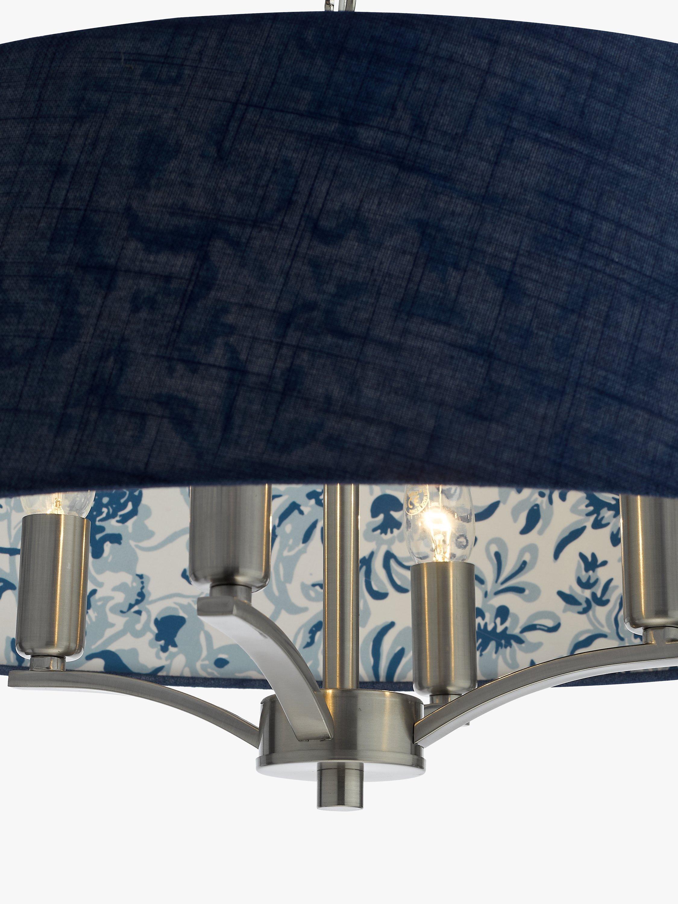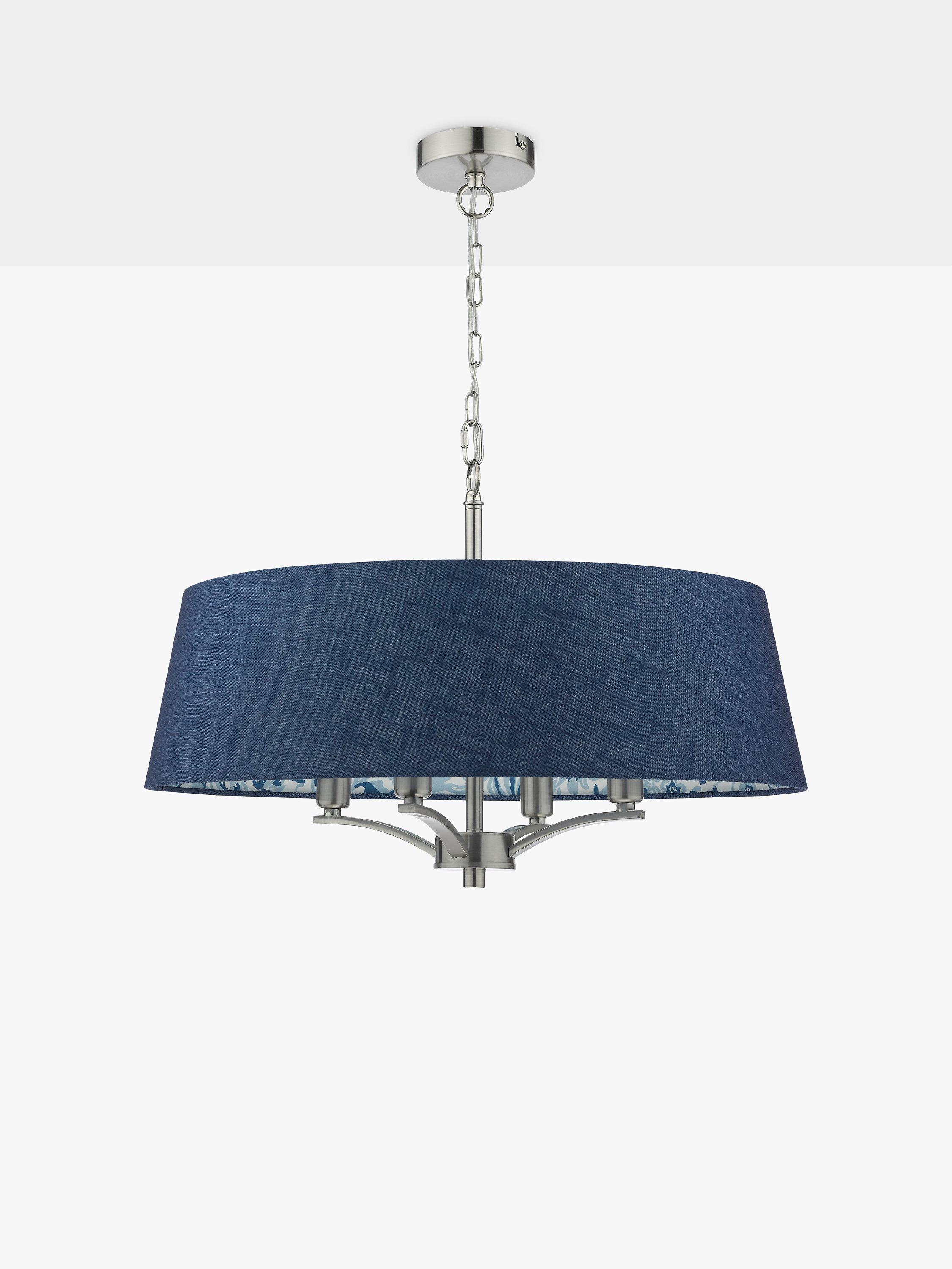 The Down House four-light Pendant in polished nickel features an Arts & Crafts style blue sprigged patterned interior with a darker complementing blue linen outer. Suspended by one metre of chain, which is height adjustable on installation.