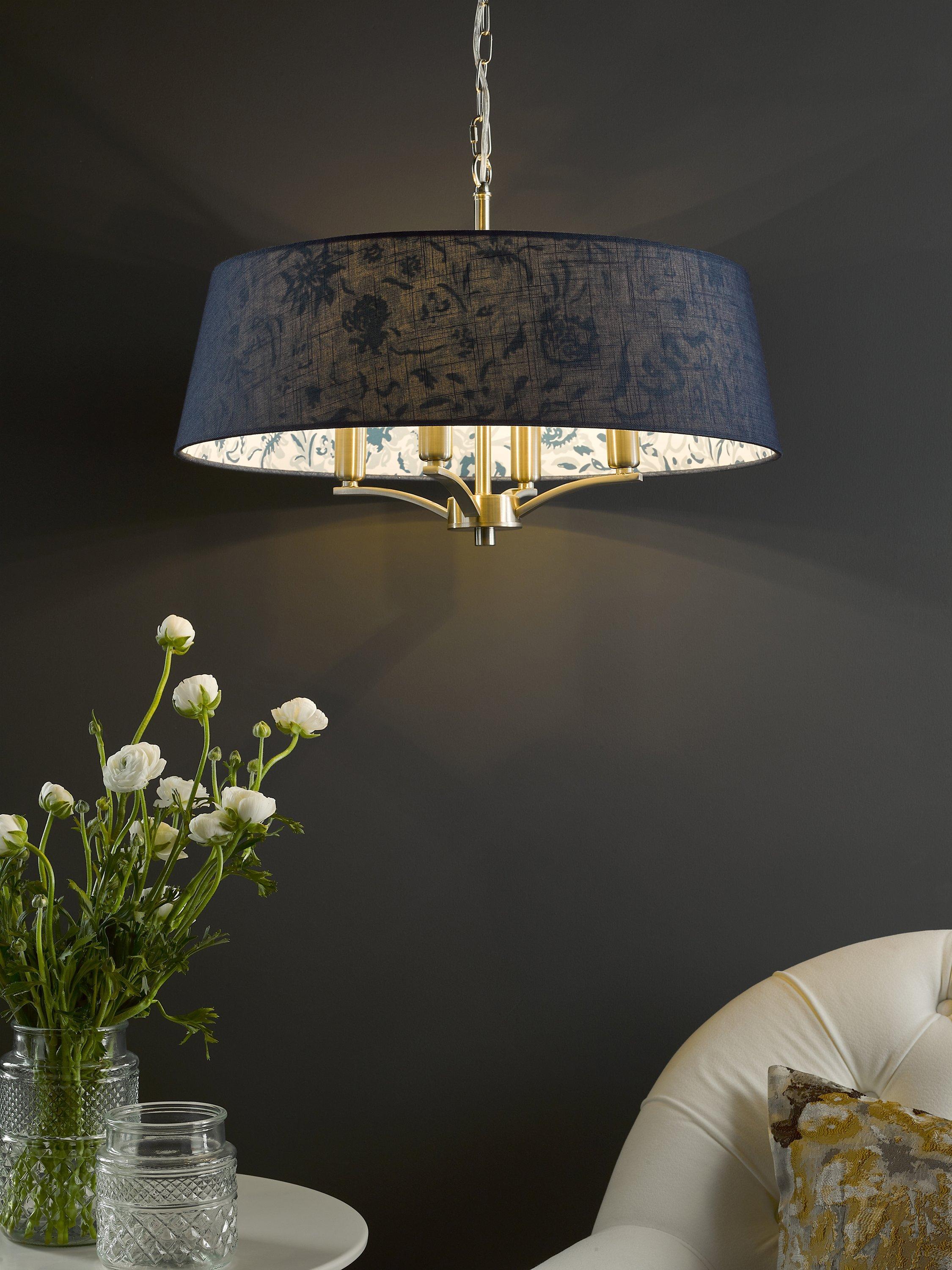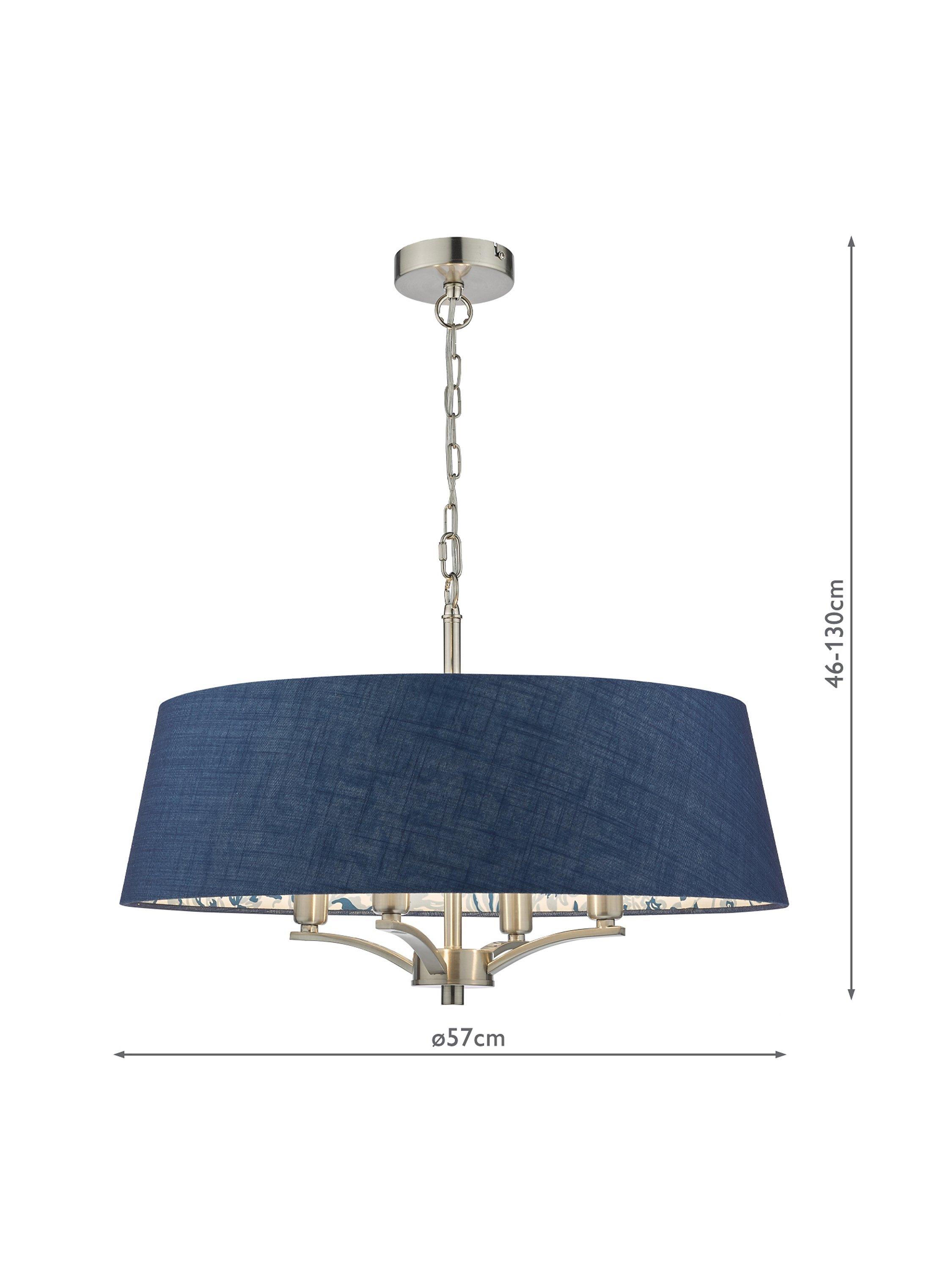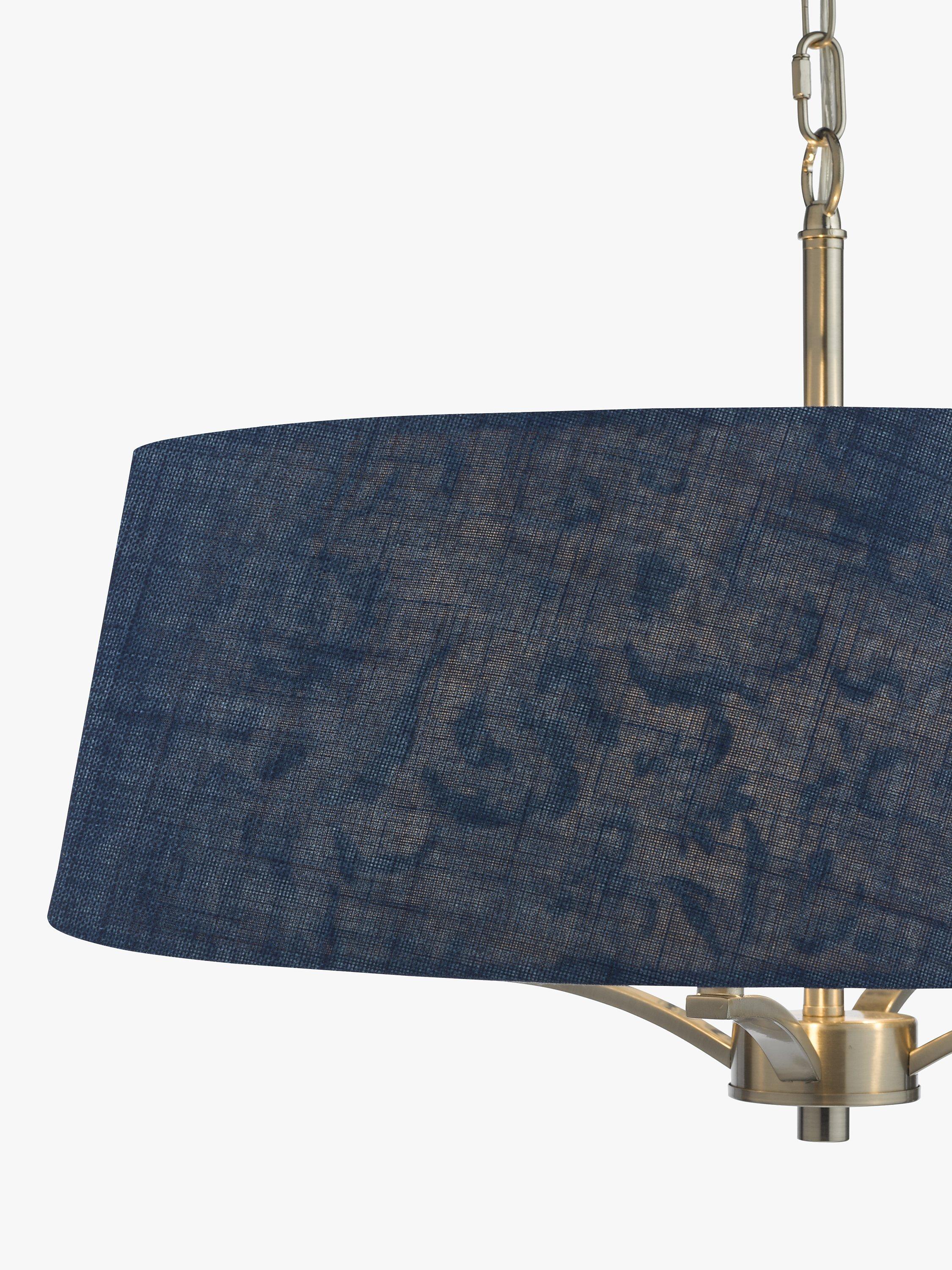 The Down House four-light Pendant in polished nickel features an Arts & Crafts style blue sprigged patterned interior with a darker complementing blue linen outer. Suspended by one metre of chain, which is height adjustable on installation.