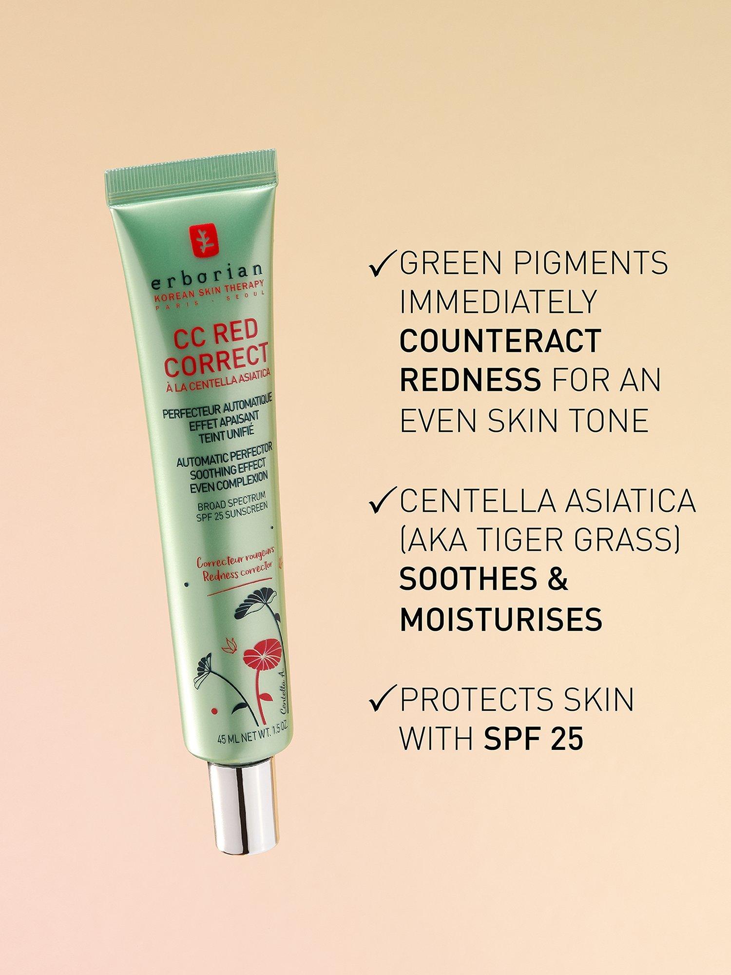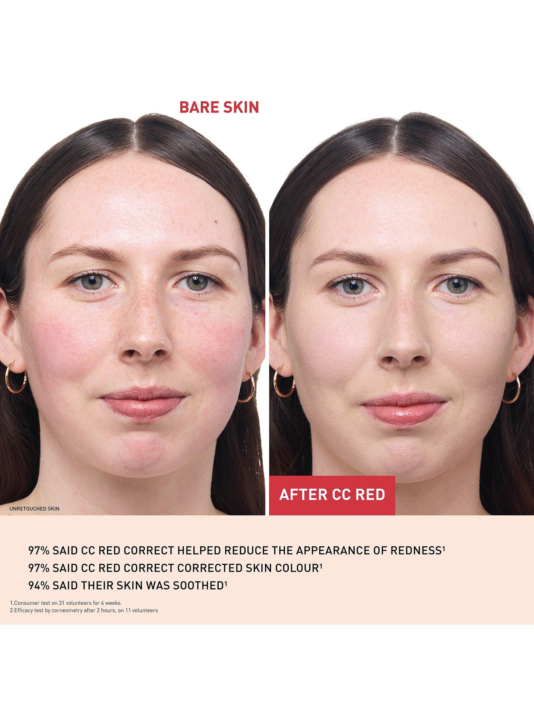 The green-tinted formula transforms on the skin, to even out skin tone, blur the complexion, and add radiance. It provides light coverage while leaving a natural-looking finish. Enriched with Centella Asiatica, CC Red Correct helps to soothe the skin.