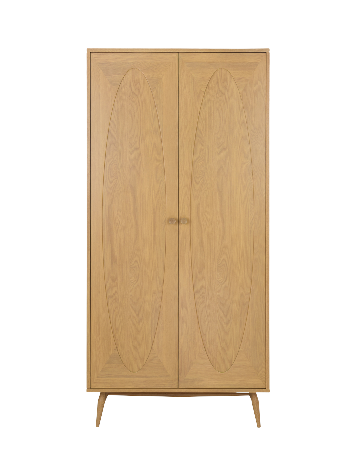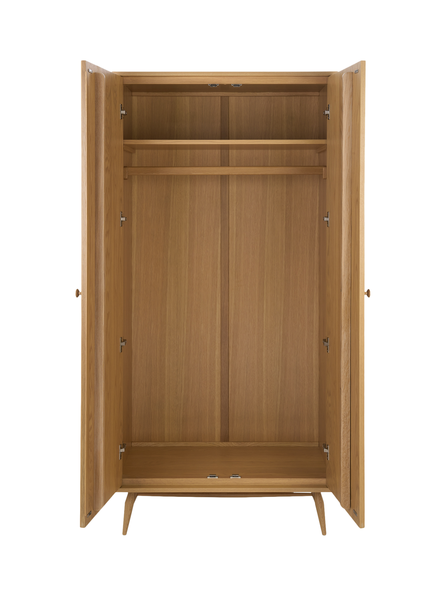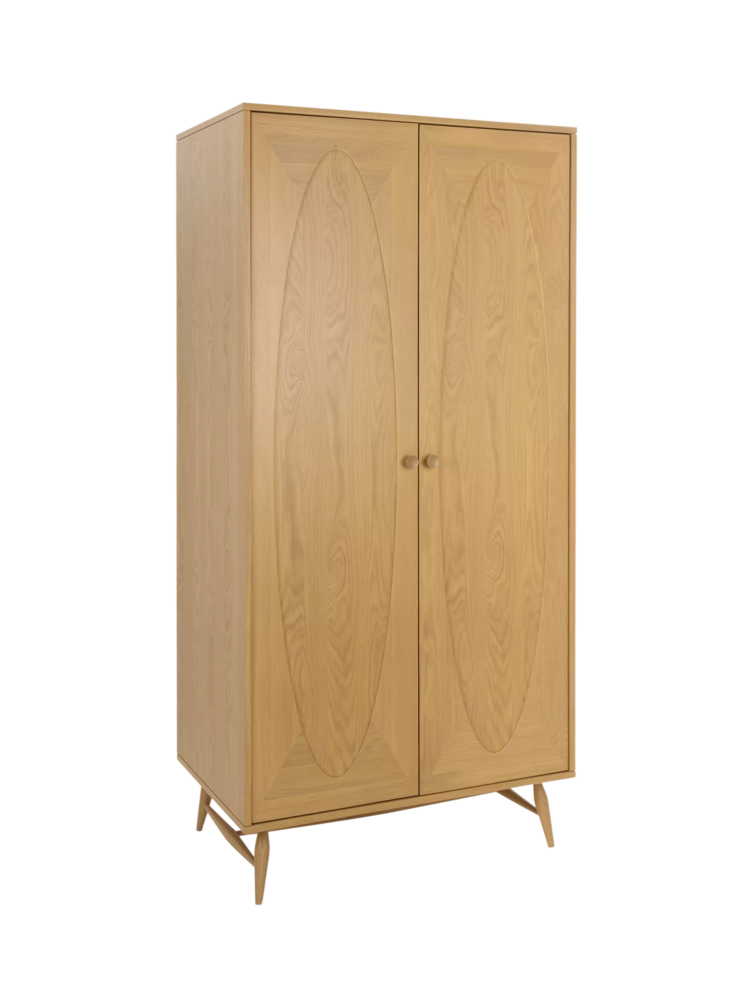 This striking wardrobe is a celebration of ercol's long heritage, with its statement doors, scalloped handles and subtle nod to Mid-century design. It's built from a combination of sturdy timbers and rests on sleek, tapered legs, and there's plenty of storage space available inside thanks to a shelf and wooden hanging rail. Finished in a protective matt lacquer that highlights the natural wood grains. Supplied flat-packed.