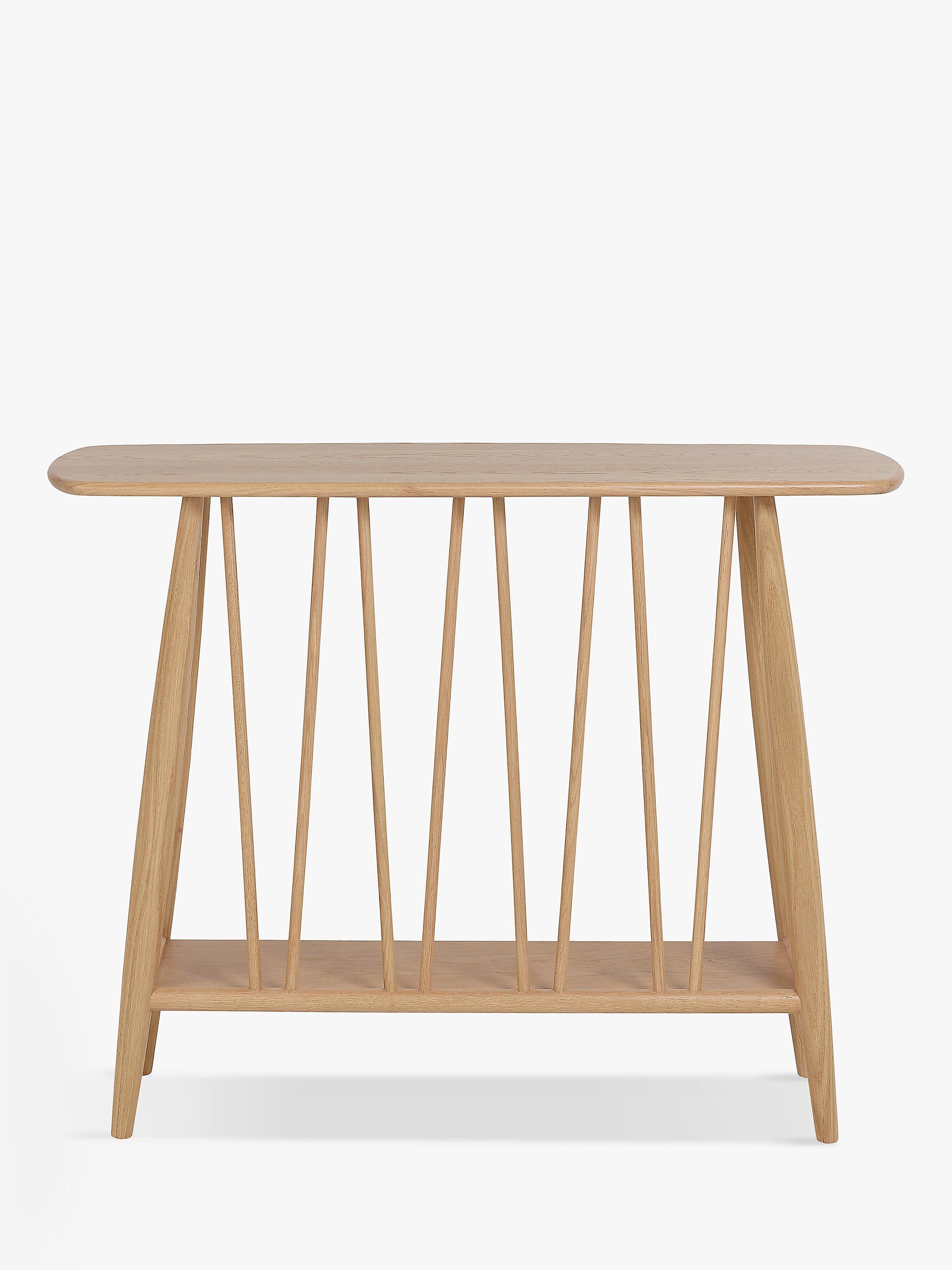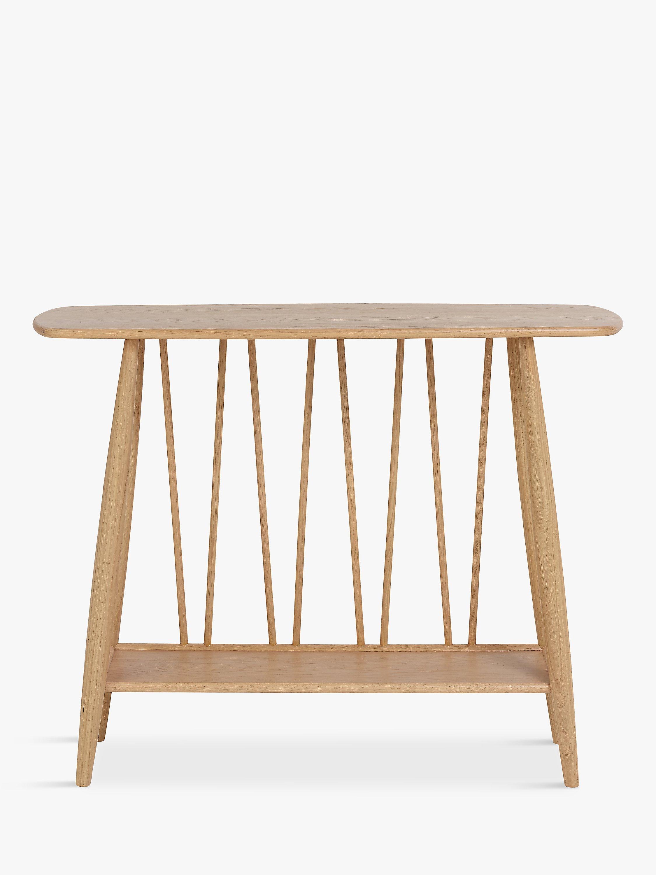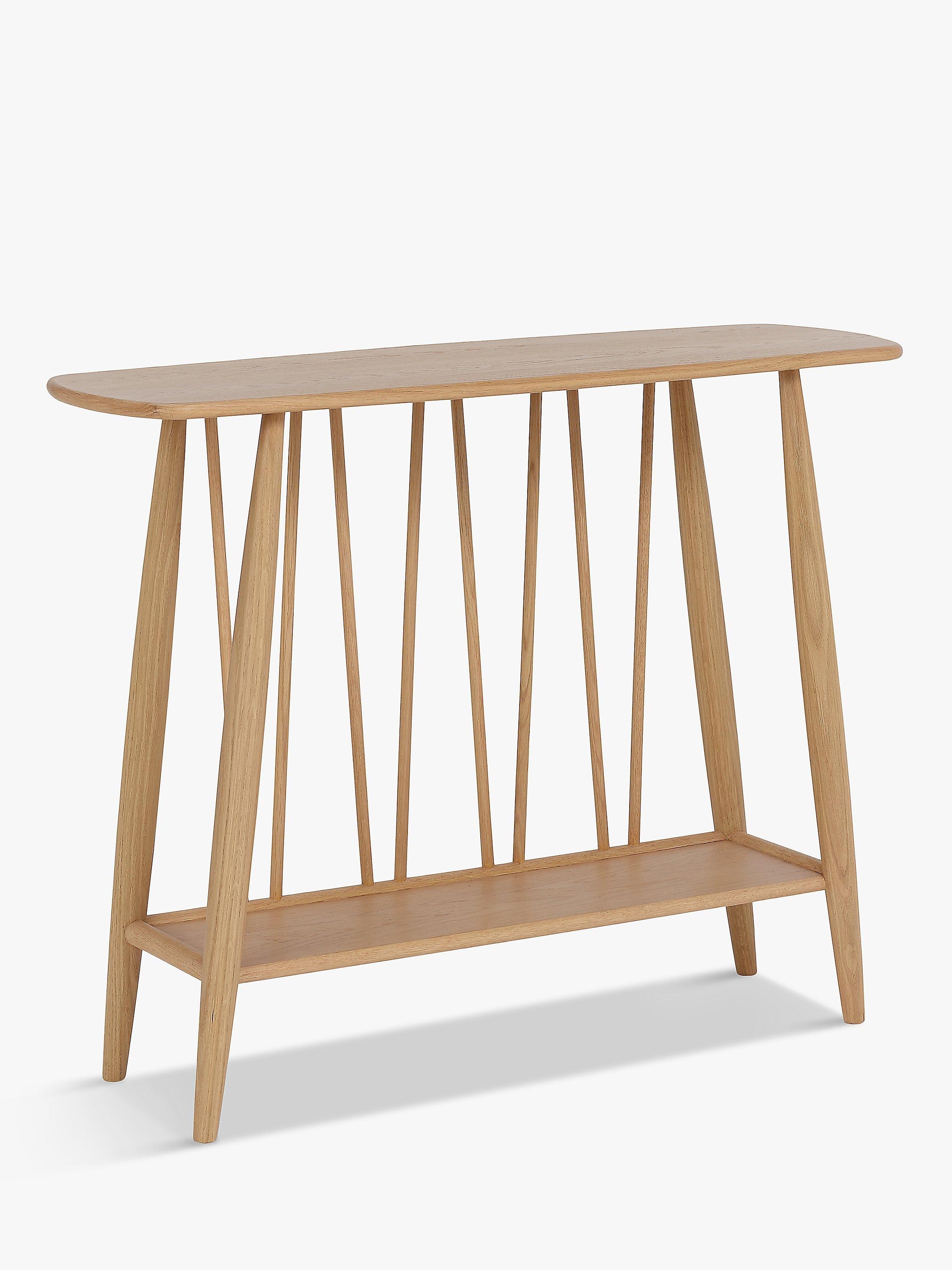 This mid-century inspired console table will become a feature piece in your hallway and provides convenient storage space thanks to the lower shelf. Its timeless design is crafted from sturdy solid oak and veneers in a contemporary matt finish, while a lacquer ensures its durability. Complete with distinctive spindle detailing to the back and carefully curved edges, this table will suit both modern and traditional interior styles.