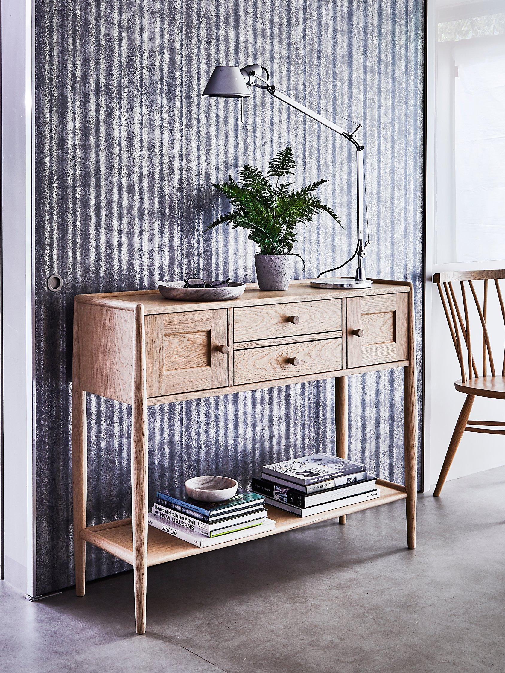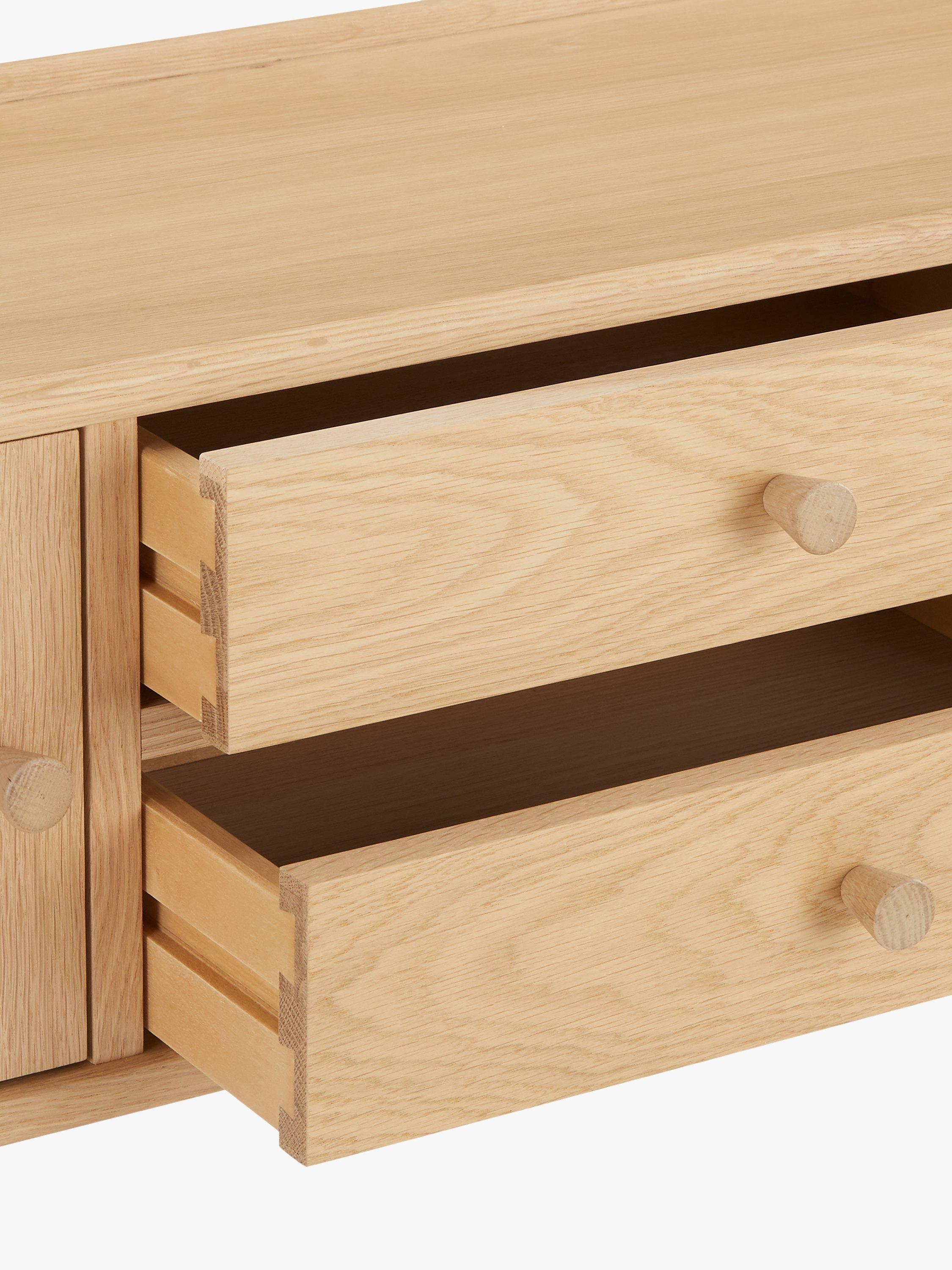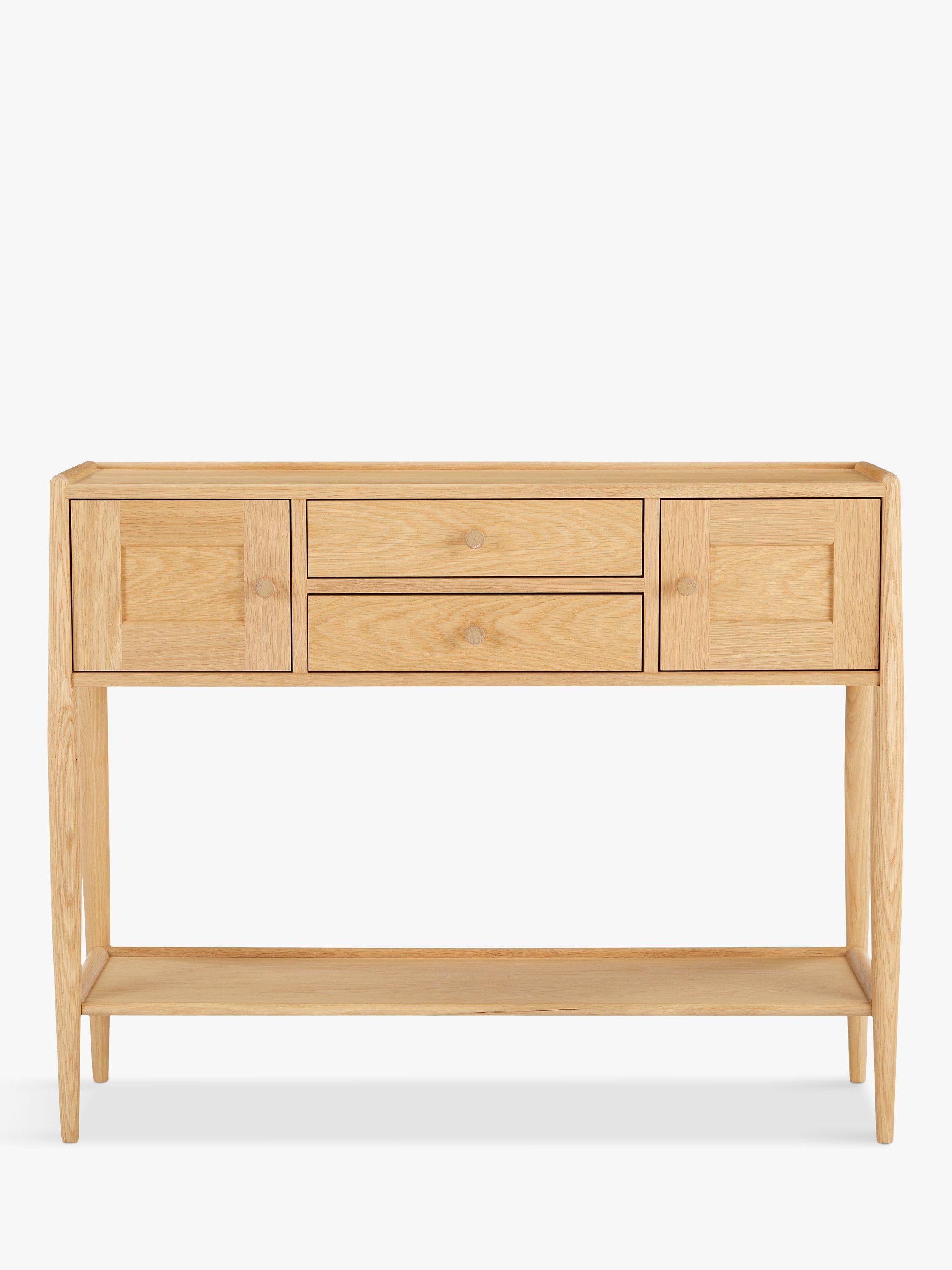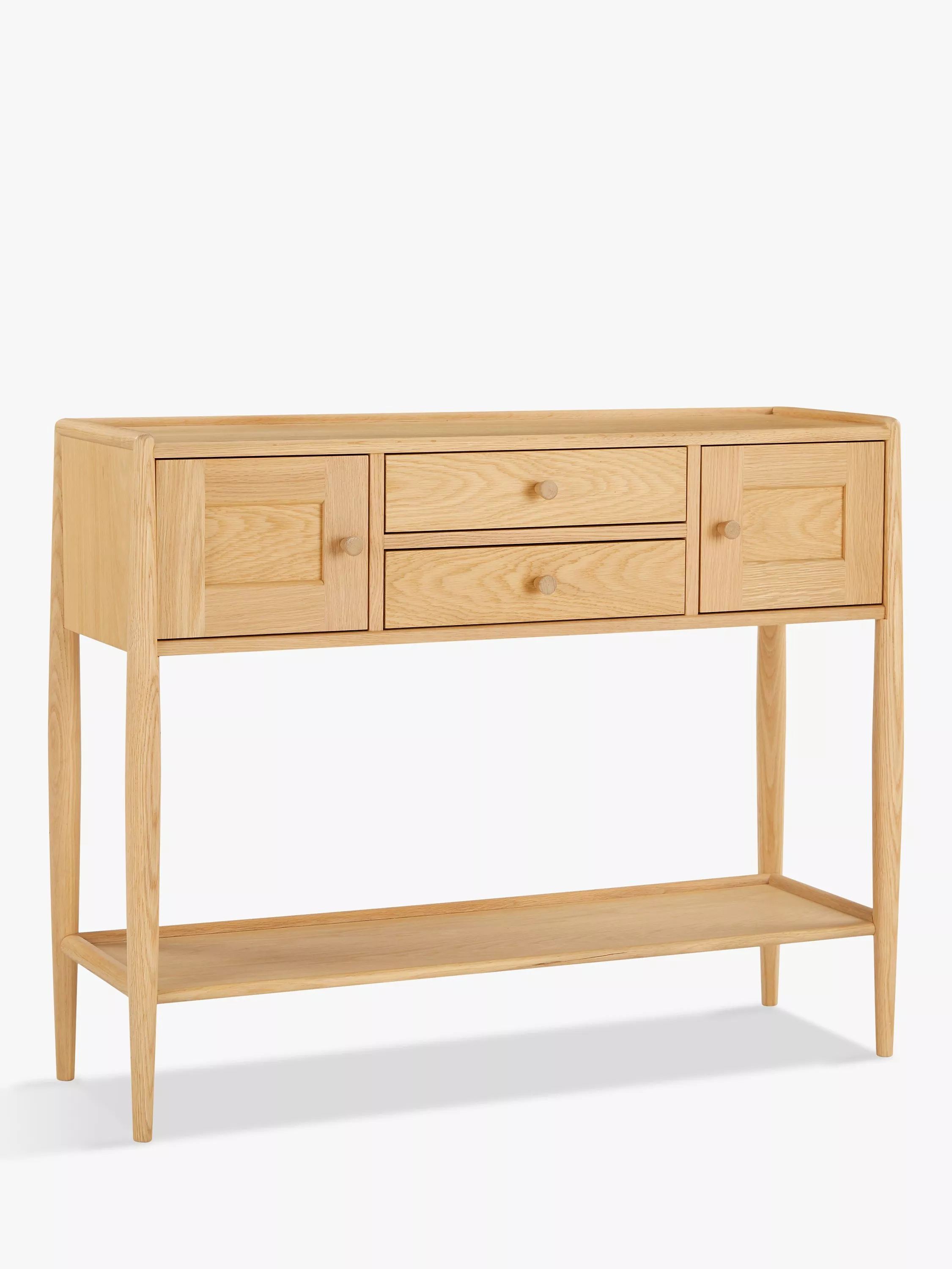 The considered design of this stylish, mid-century Scandi-inspired desk boasts a modern update thanks to its pale oak and oak veneer construction and contemporary matt finish. Its neat profile features ample storage space, with two drawers and two petite cupboards and an additional shelf that sits underneath. Ideal for hallways and other compact spaces, its elegant design and smooth rounded edges will take pride of place in your home.