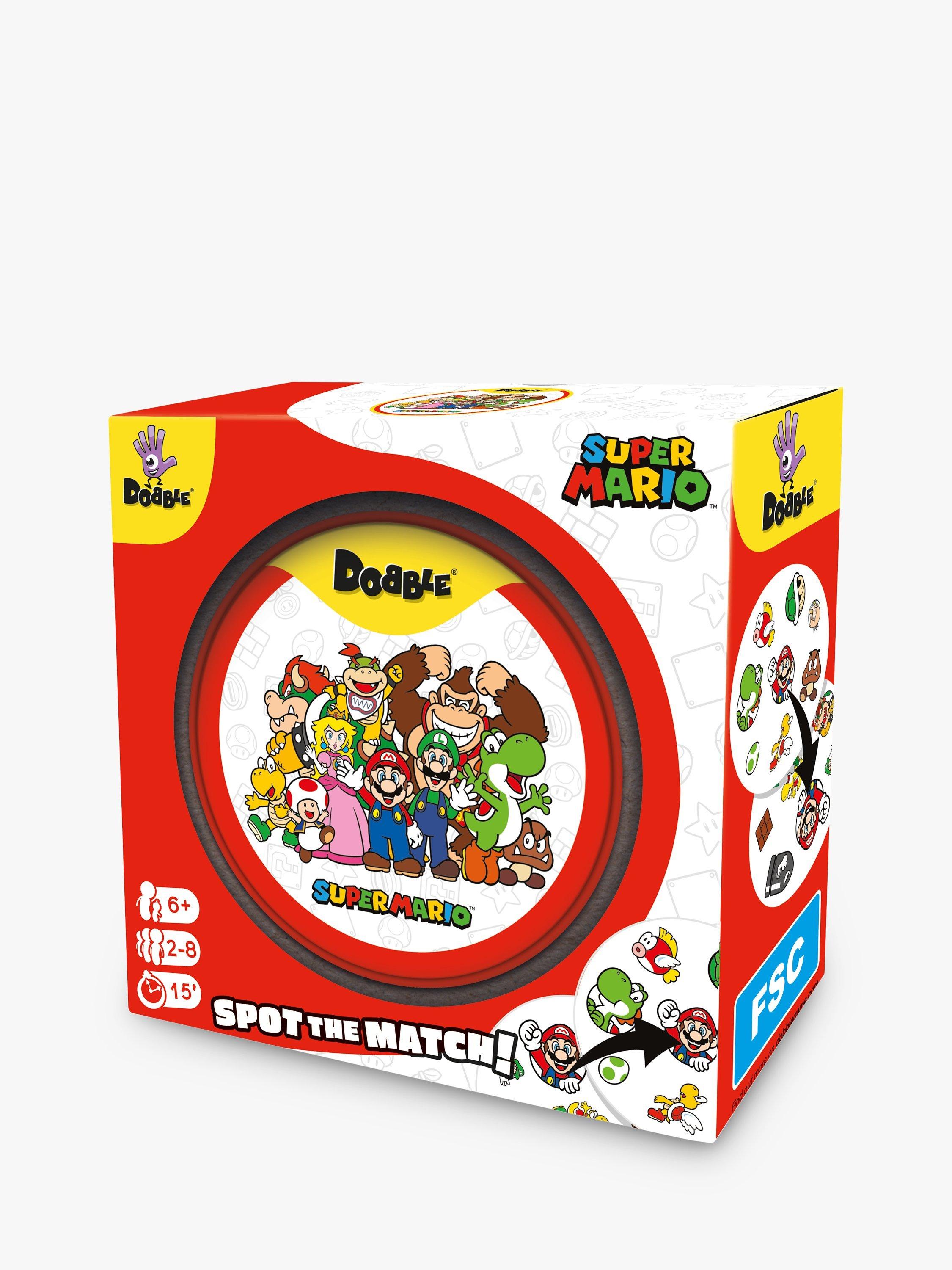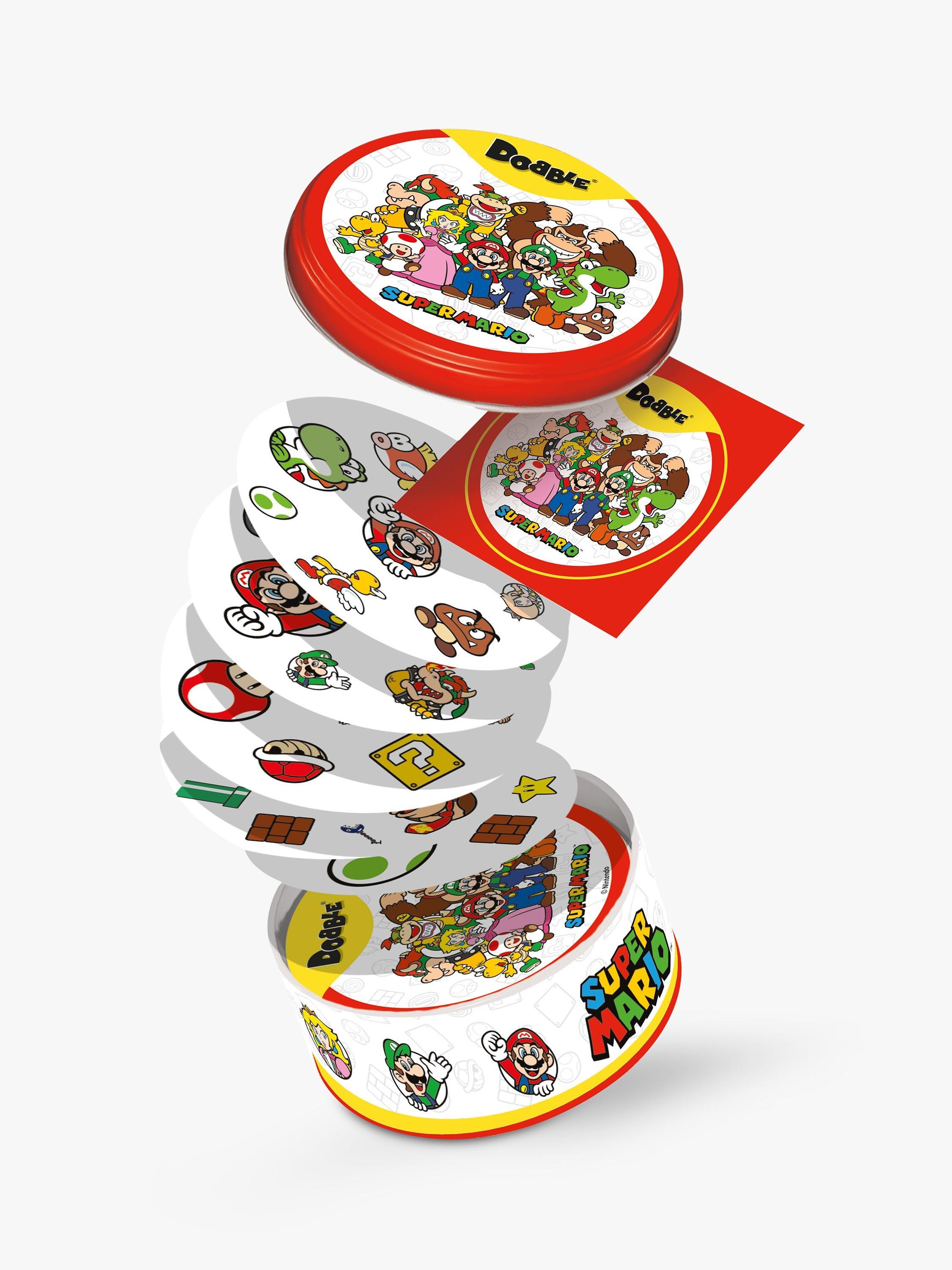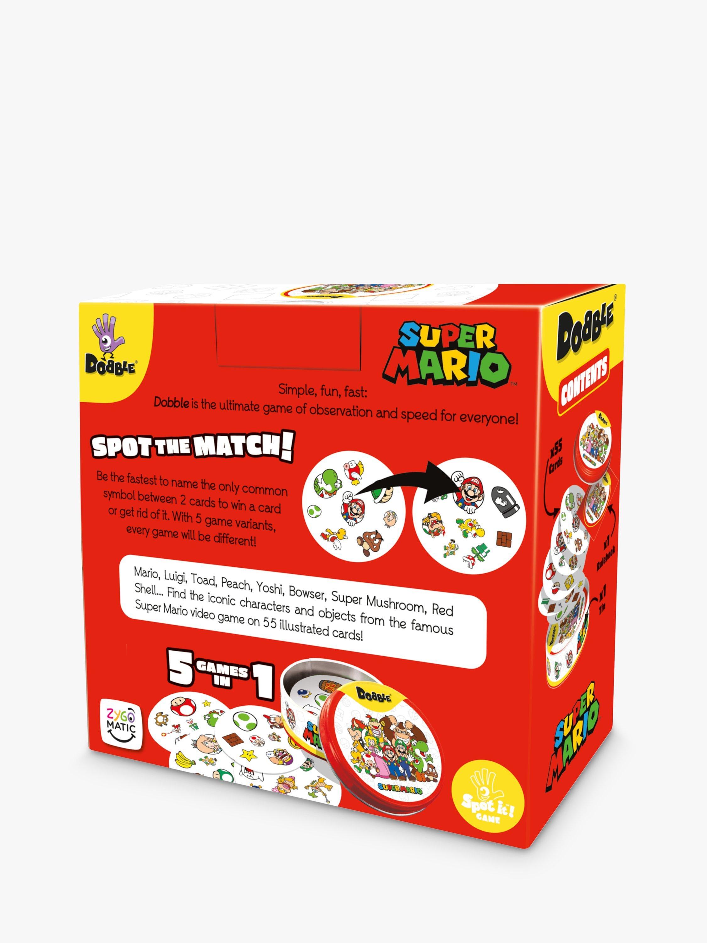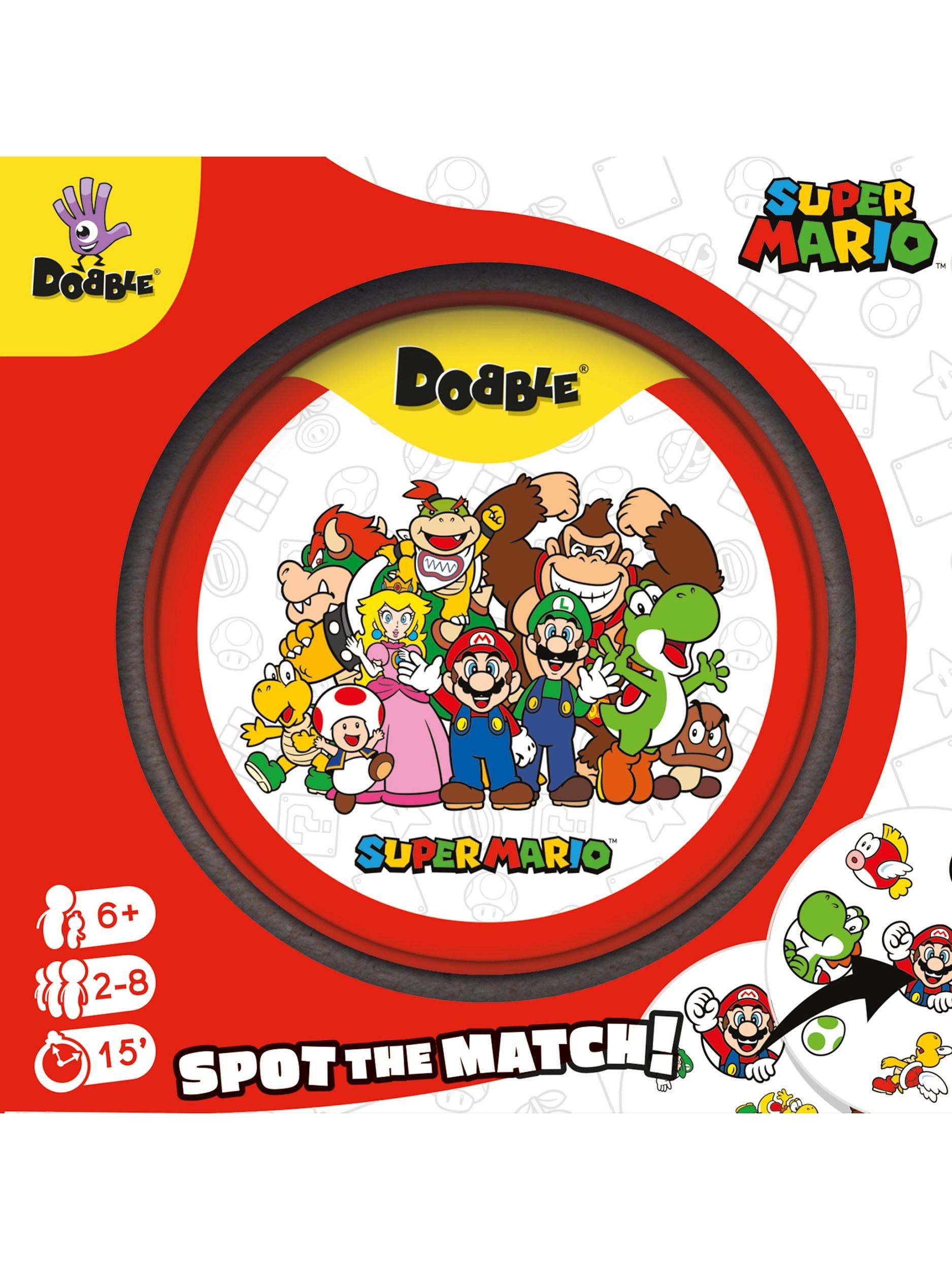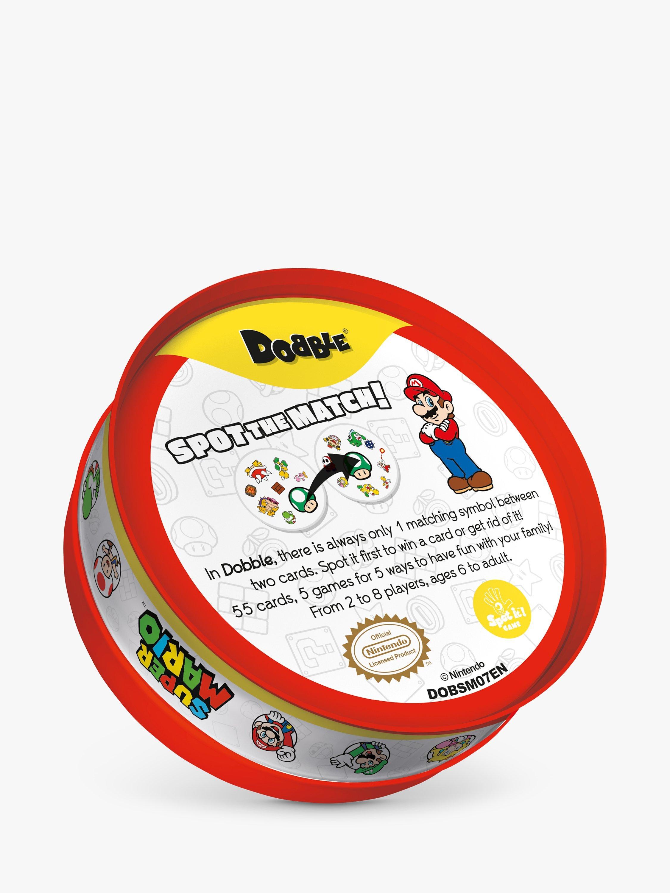 In Dobble, there is only one common symbol between two cards. Be the first to spot the match to win! This Super Mario" edition of Dobble includes many symbols from the iconic Super Mario video games The small tin box makes it the perfect game to bring along and play anywhere.