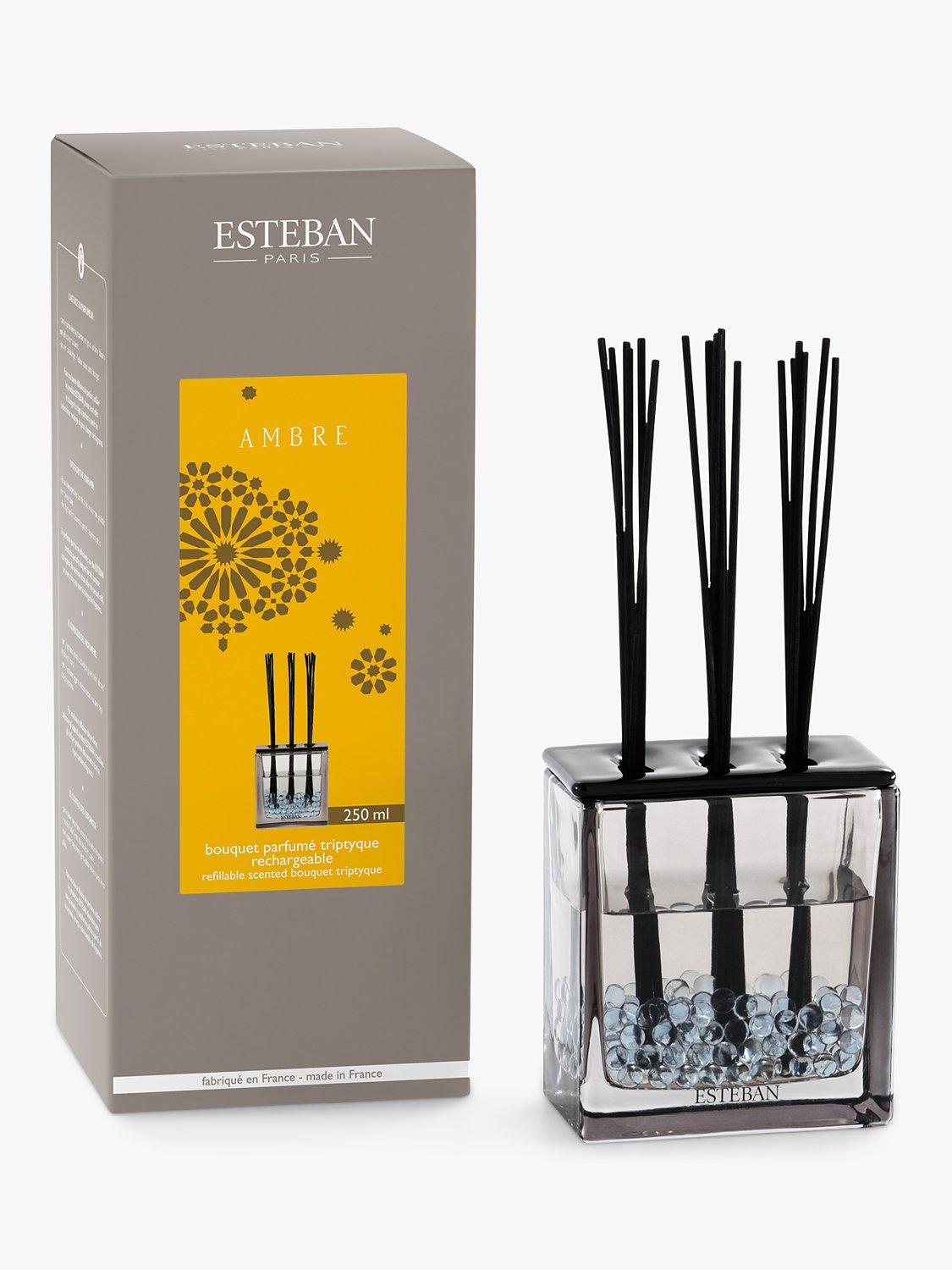 Reed diffuser trio in one. Contemporary triptyque holder with amber-citrus perfume sticks and a 250ml bottle, refillable to infinity. The diffuser sticks are from sustainably managed forests and the perfume is made with organic and vegetable alcohol. Fully recyclable packaging.