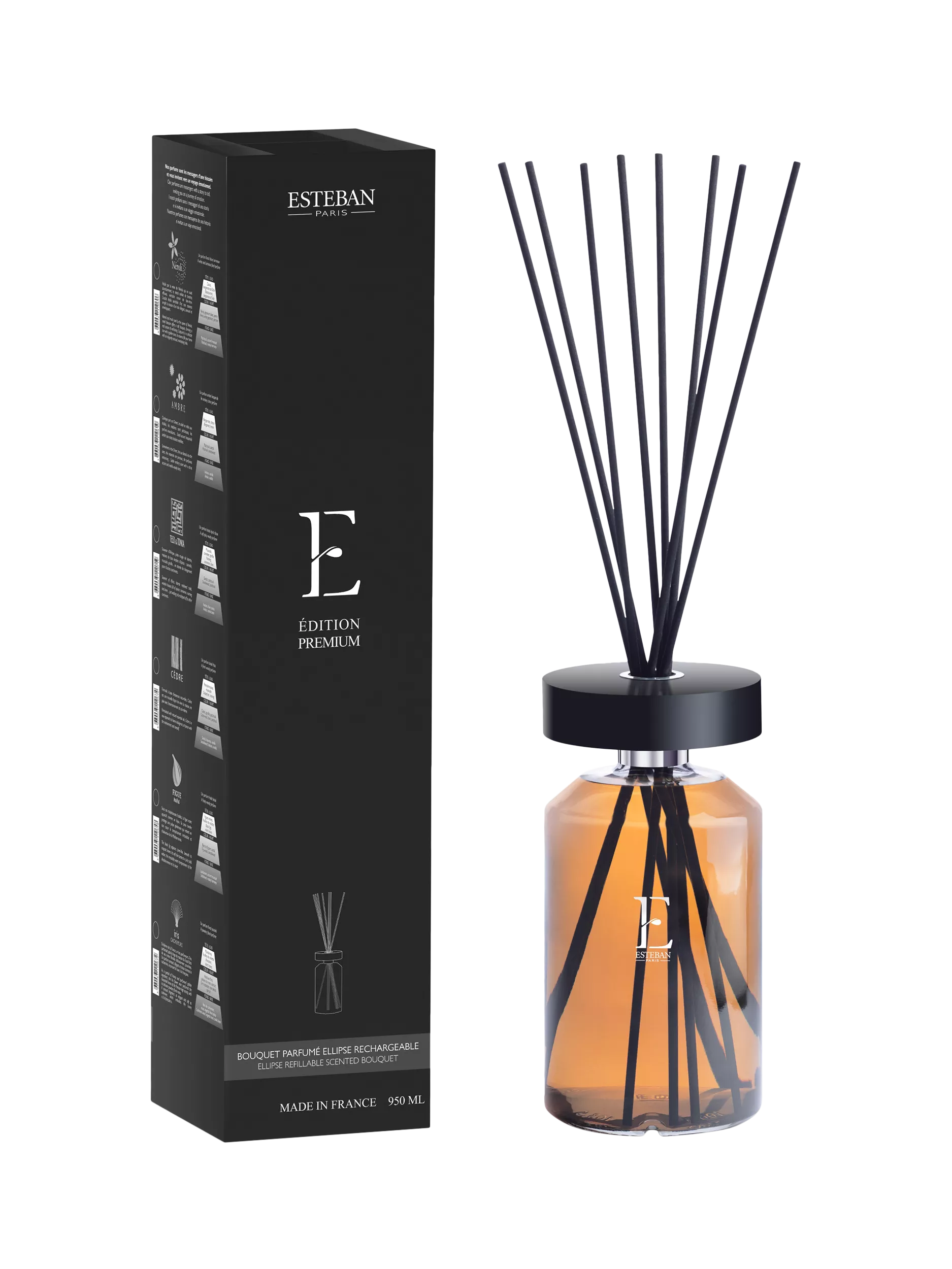 A timeless and distinctive scented bouquet, defined by its generous 950 ml size and elegant elliptical design. Combining noble materials with soft, rounded lines, it becomes a refined decorative object. A new monogram marks this Ellipse Premium collection: at the heart of the “E” emerges a drop of fragrance—an encounter between nature and Estéban’s craftsmanship, expressed with precision and expertise. Infinitely refillable (sticks and fragrances), the bouquet provides continuous diffusion through capillarity, delivering a delightful scent for six months or more. The bouquet comes pre-filled.