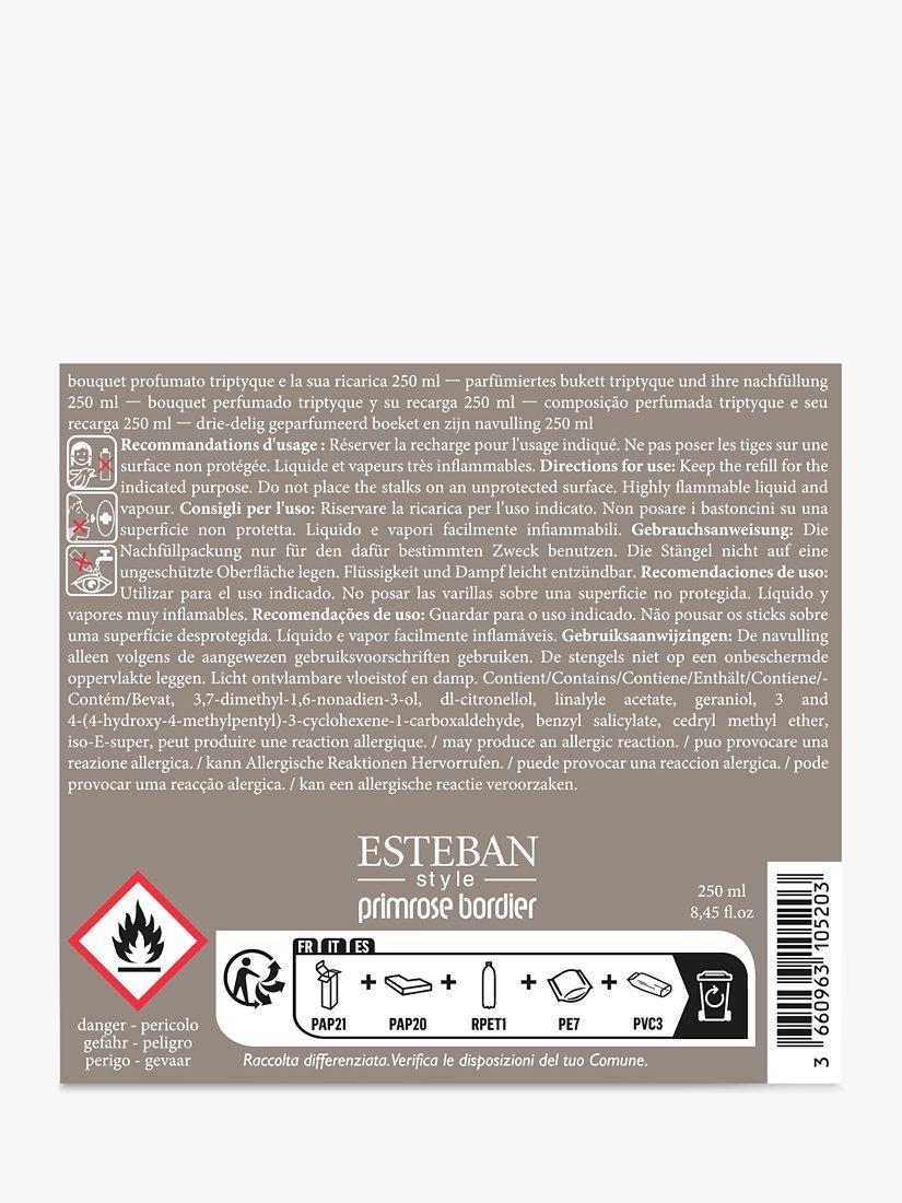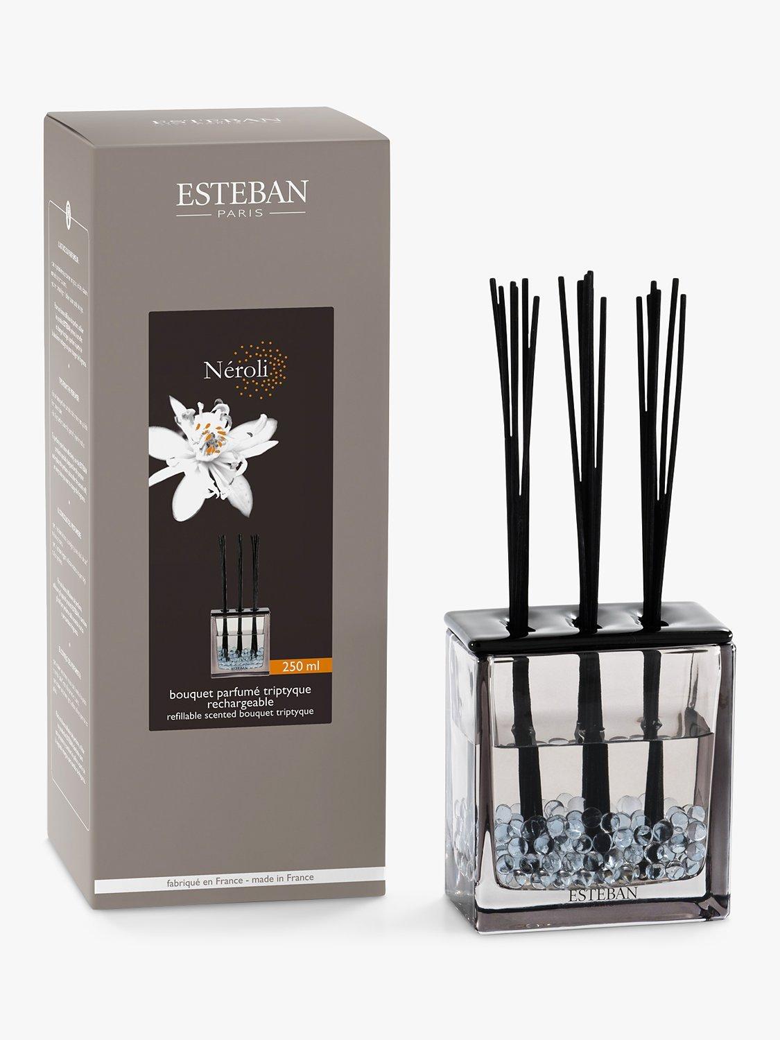 Reed diffuser trio in one. Contemporary triptyque holder with citrus floral perfume sticks and a 250ml bottle, refillable to infinity. The diffuser sticks are from sustainably managed forests and the perfume is made with organic and vegetable alcohol. Fully recyclable packaging.