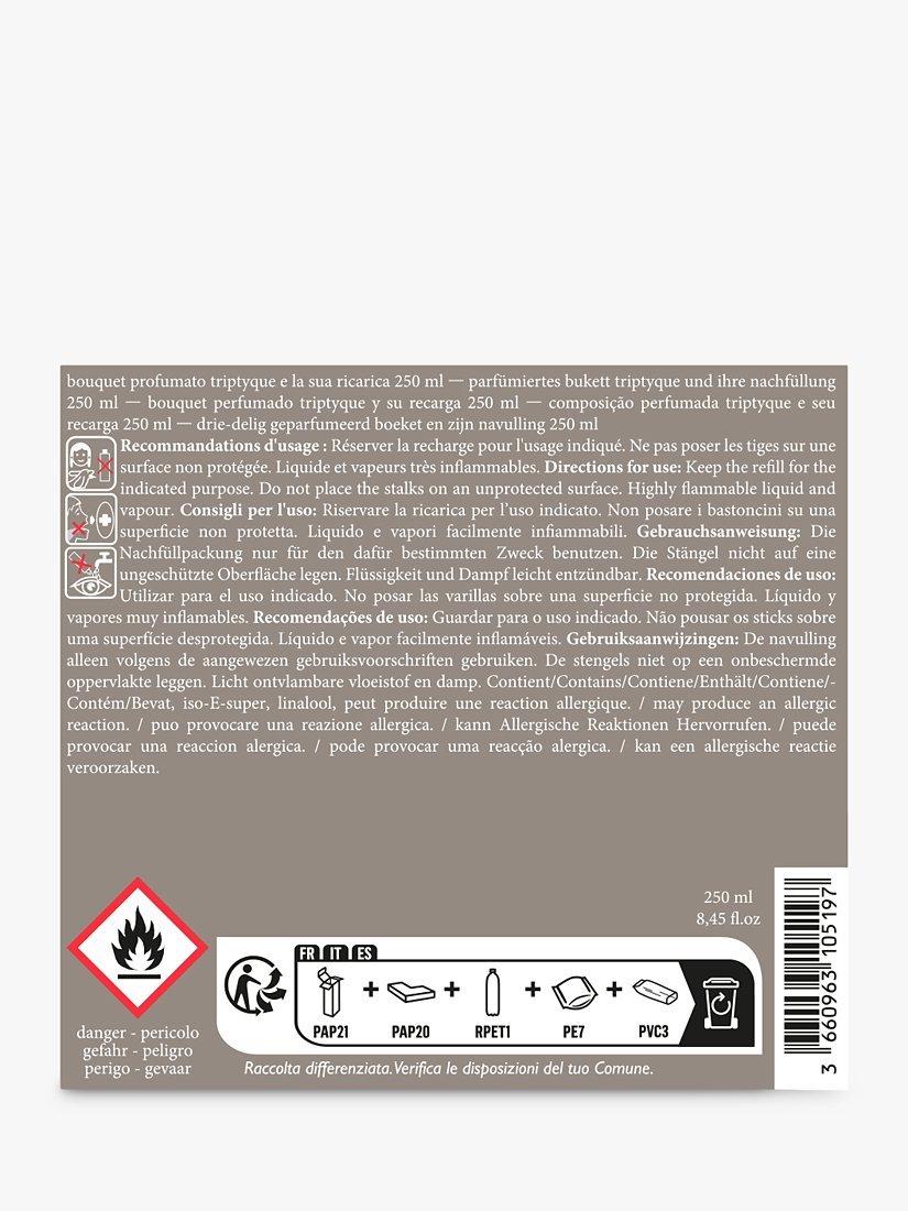 Reed diffuser trio in one. Contemporary triptyque holder with musky fresh floral perfume sticks and a 250ml bottle, refillable to infinity. The diffuser sticks are from sustainably managed forests and the perfume is made with organic and vegetable alcohol, composed of up to 99% natural origin ingredients.