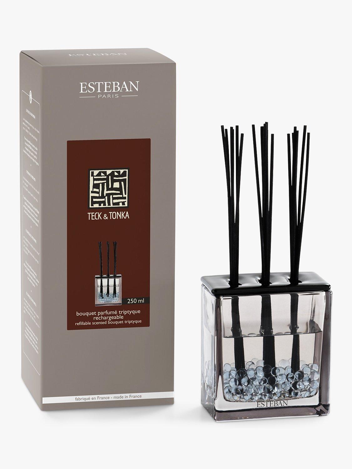 Reed diffuser trio in one. Contemporary triptyque holder with soft, spicy woody perfume sticks and a 250ml bottle, refillable to infinity. The diffuser sticks are from sustainably managed forests and the perfume is made with organic and vegetable alcohol. Fully recyclable packaging.