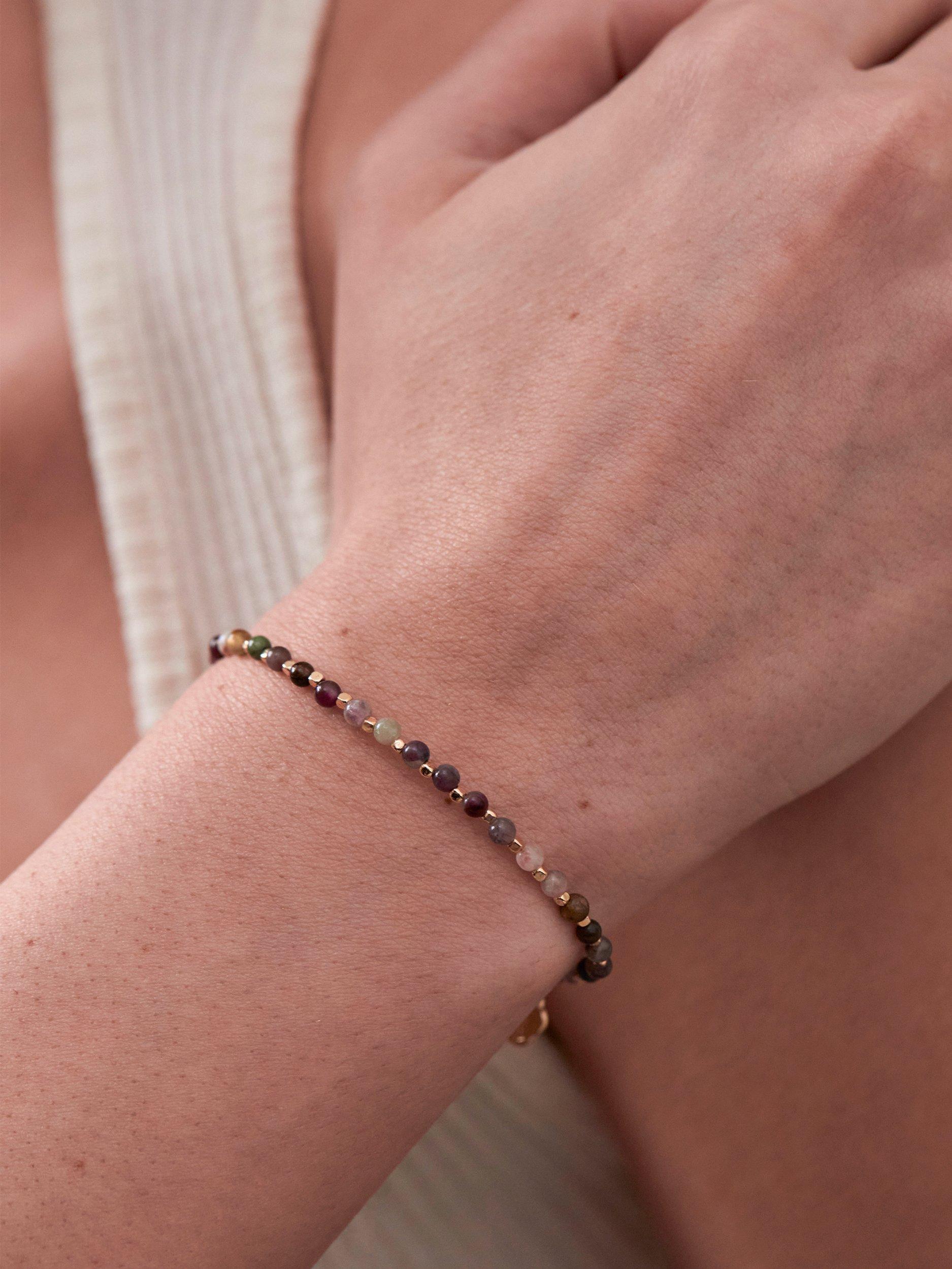 With an adjustable chain and a bead clasp, the bracelet offers an eclectic mix of small round beads in various natural-looking hues. The beads are separated by small polished faceted spacers.