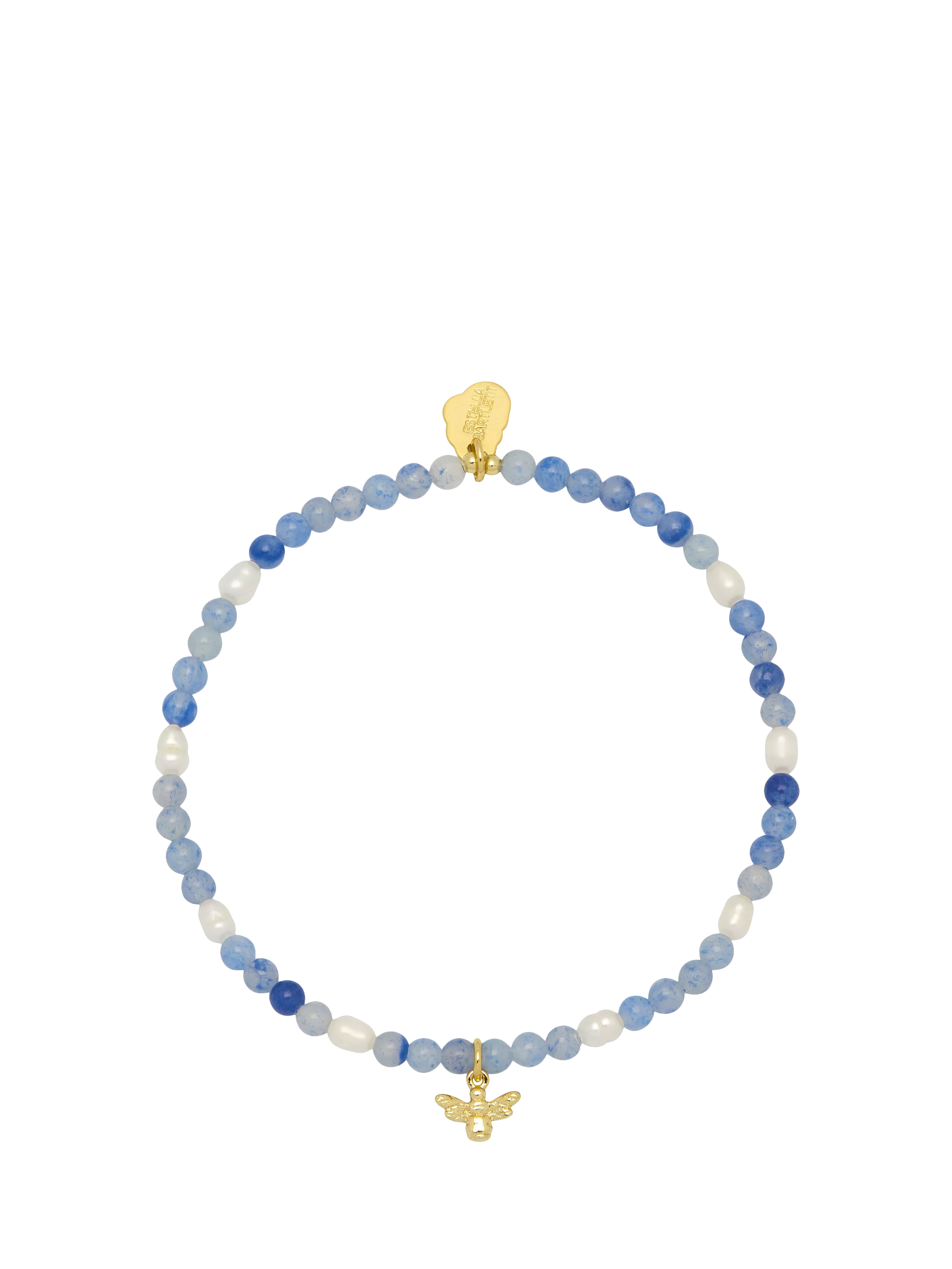Strung with beads, this stretch bracelet is presented with semi-precious blue agate stones and a bee charm.