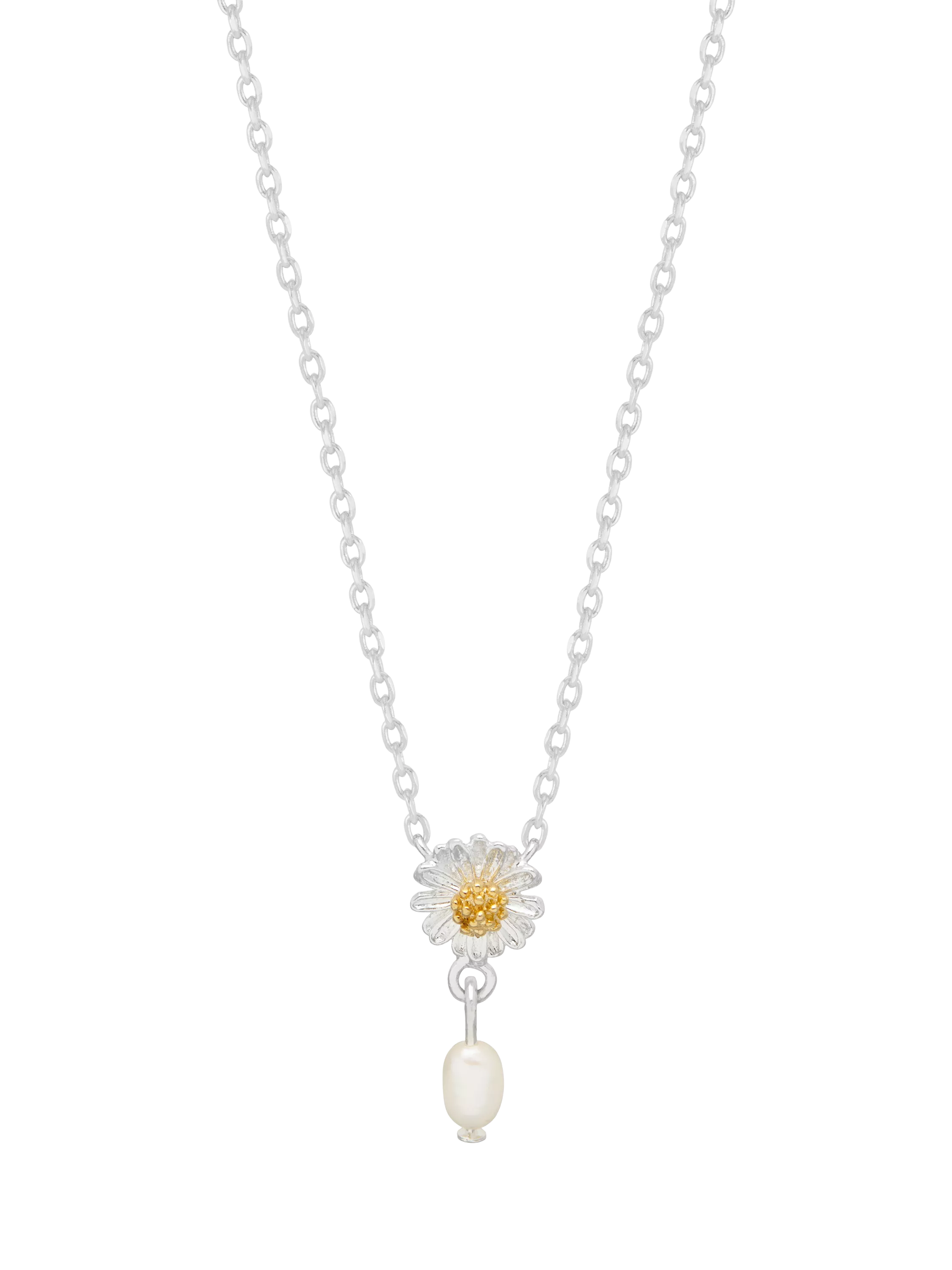 This chain necklace features a dainty flower charm from which an elegant freshwater pearl is suspended.