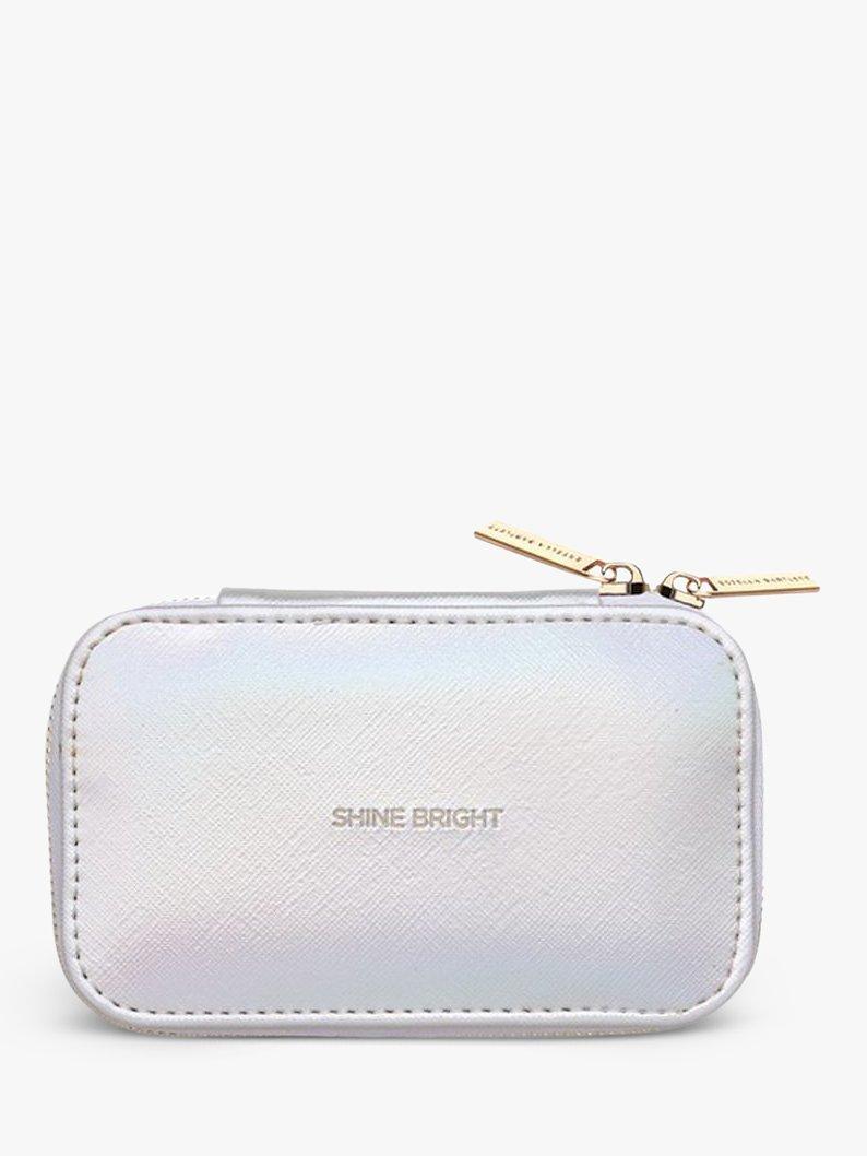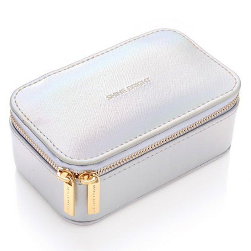 The box comes in a faux leather design with a cross-hatch texture. It features a double zip and a Shine Bright inscription.
