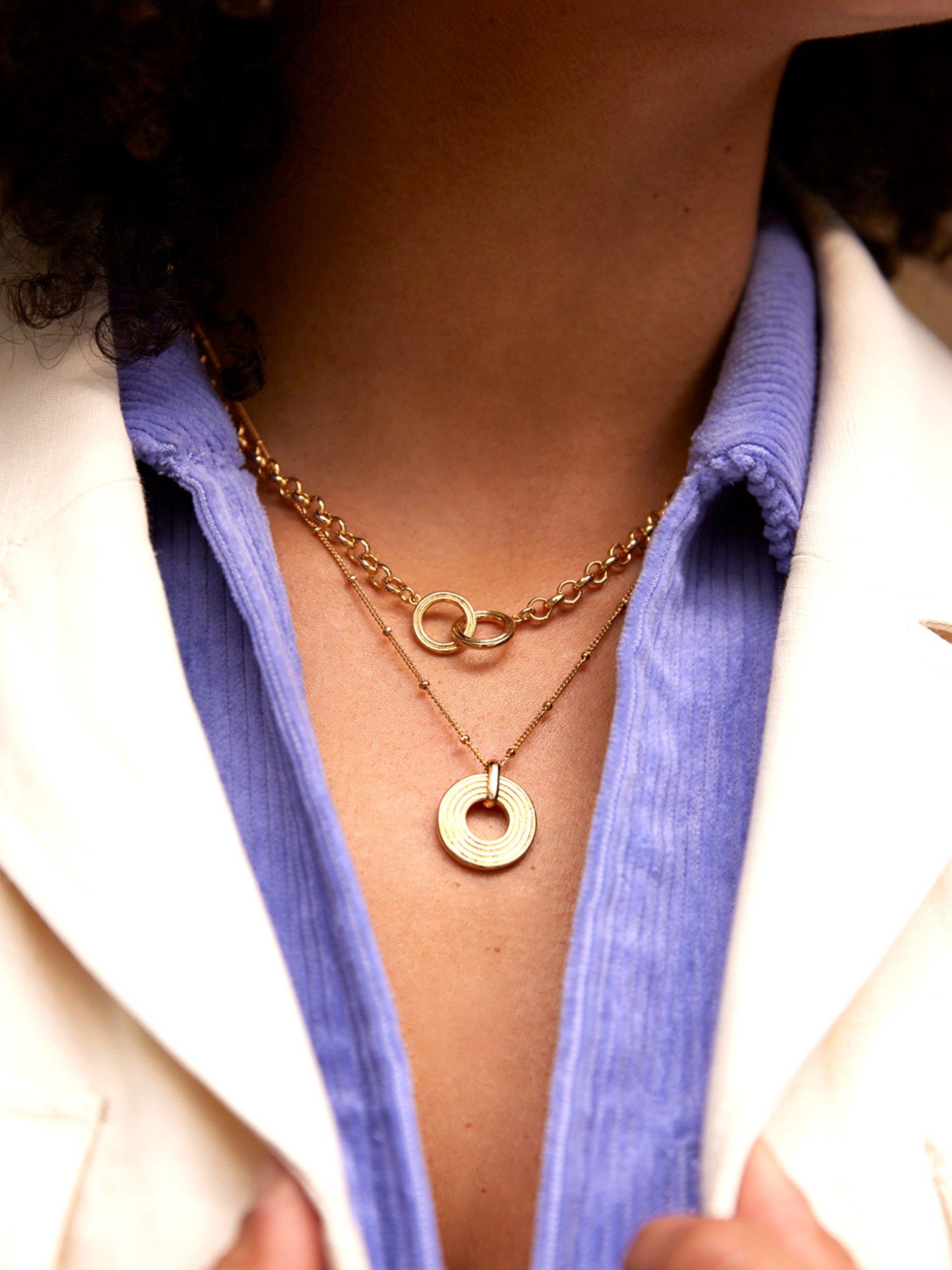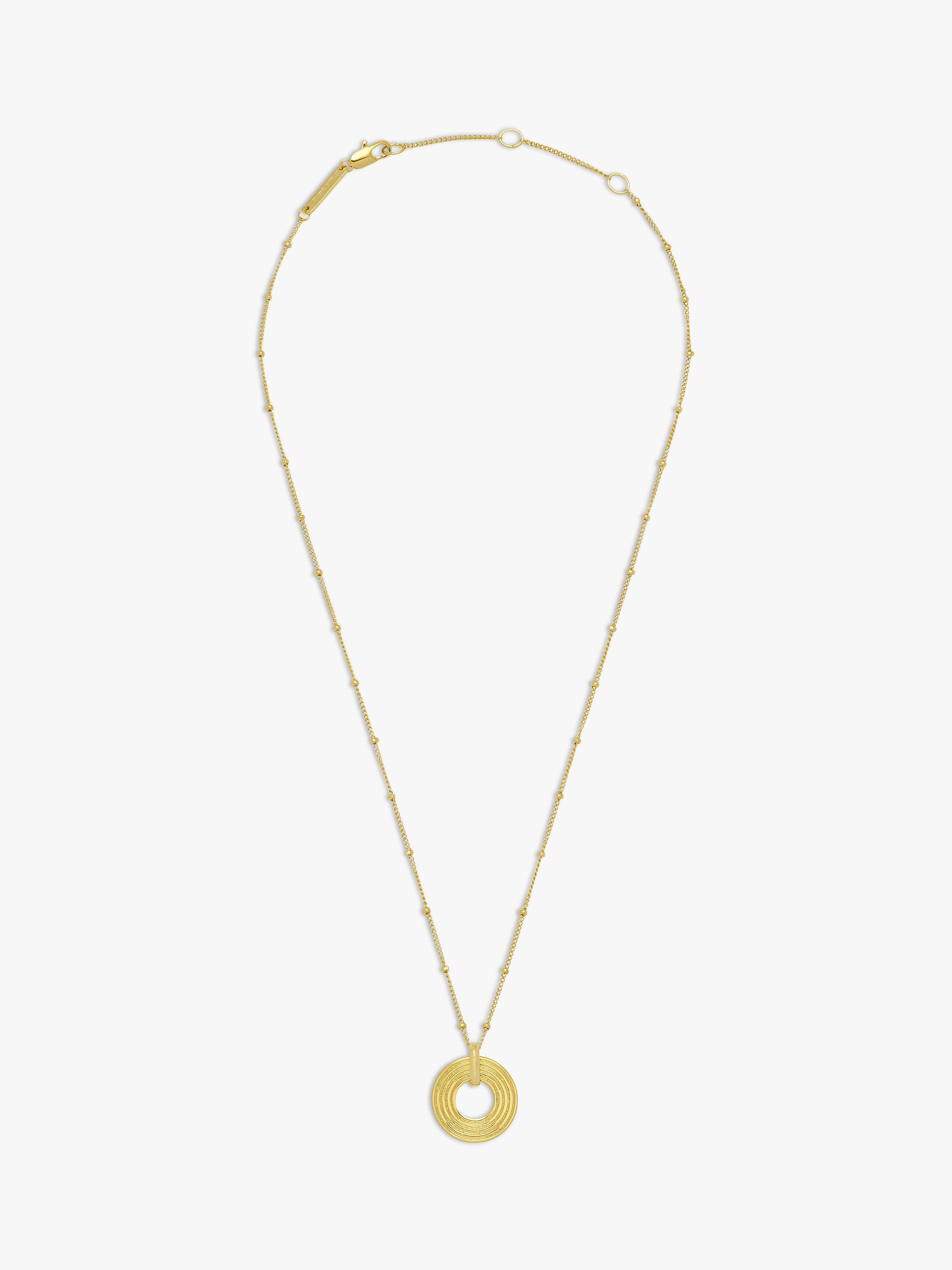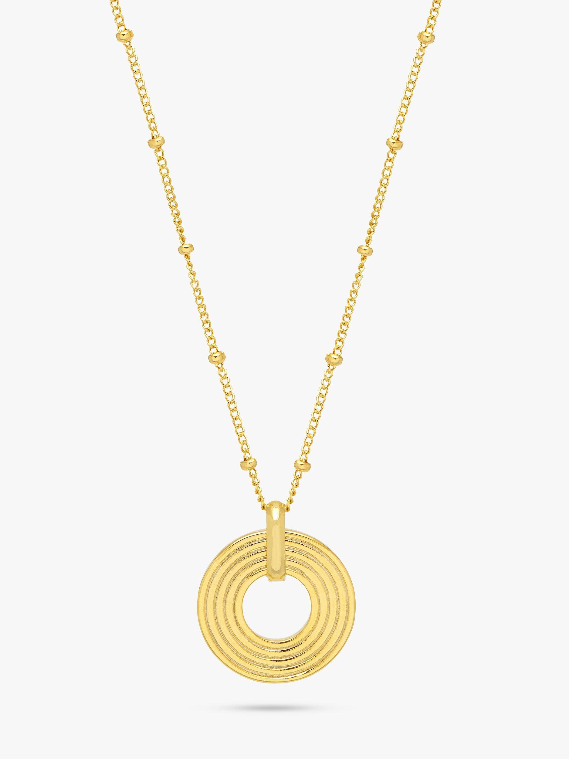 With a simple but attractive linear texture, this circle pendant necklace makes a great addition to any look. The pendant hangs from a beaded chain that further complements the style and is adjustable in length for the perfect fit.