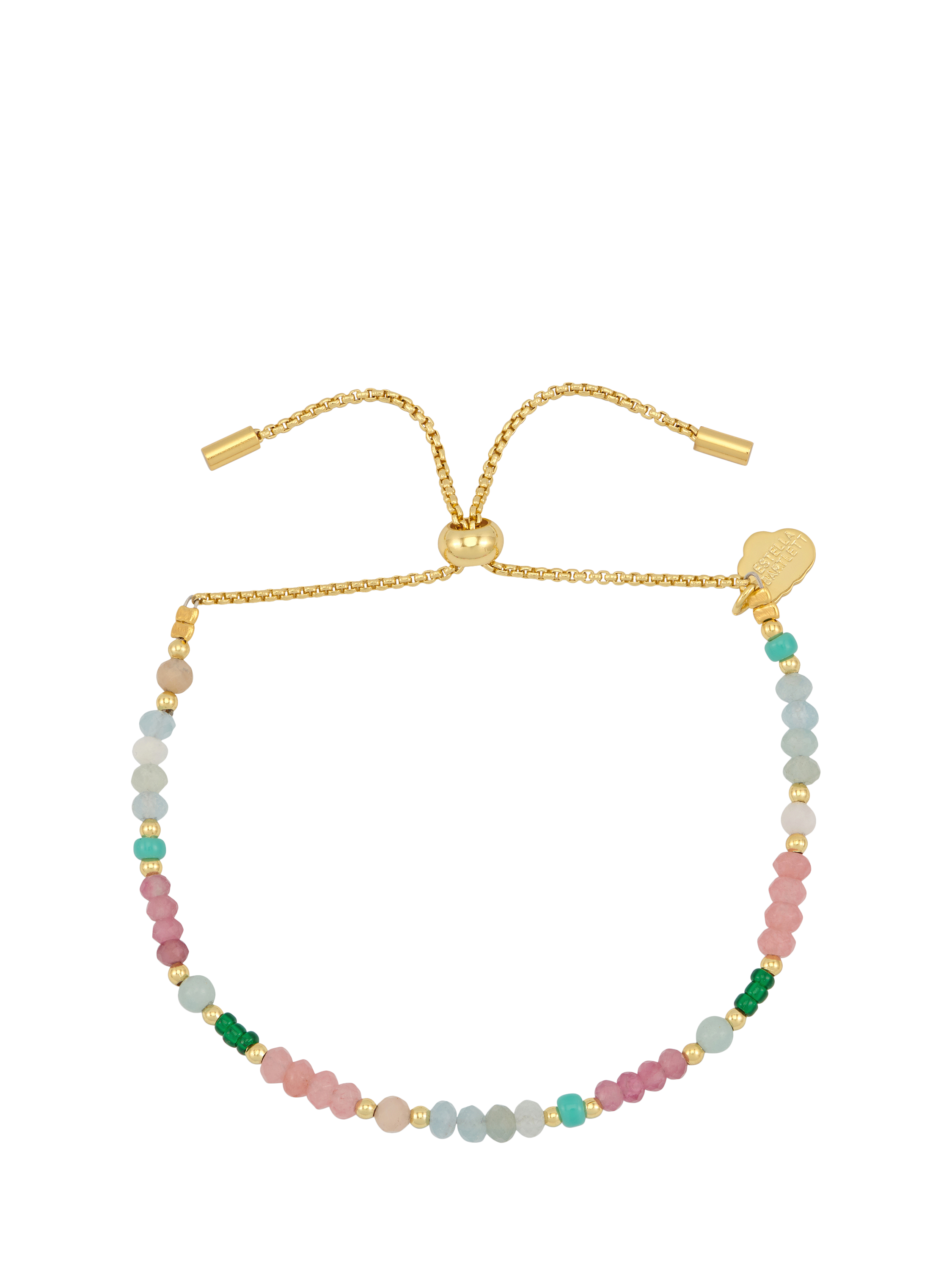 This colourful bracelet is made with an array of semi-precious stones, including opal, aquamarine, and tourmaline. The bracelet can be adjusted in length thanks to the slider closure. Presented on a gift card with the wording LOVE.