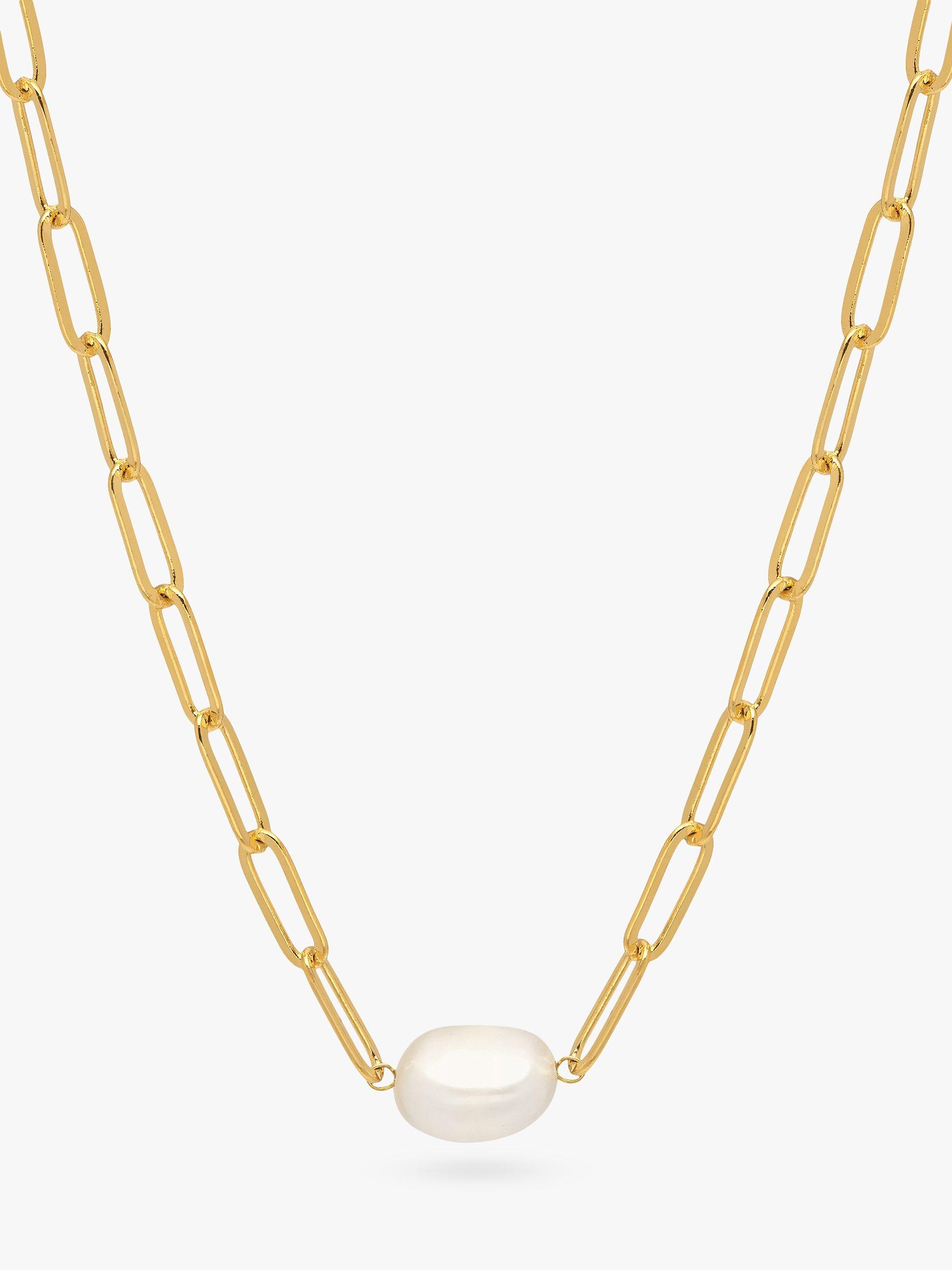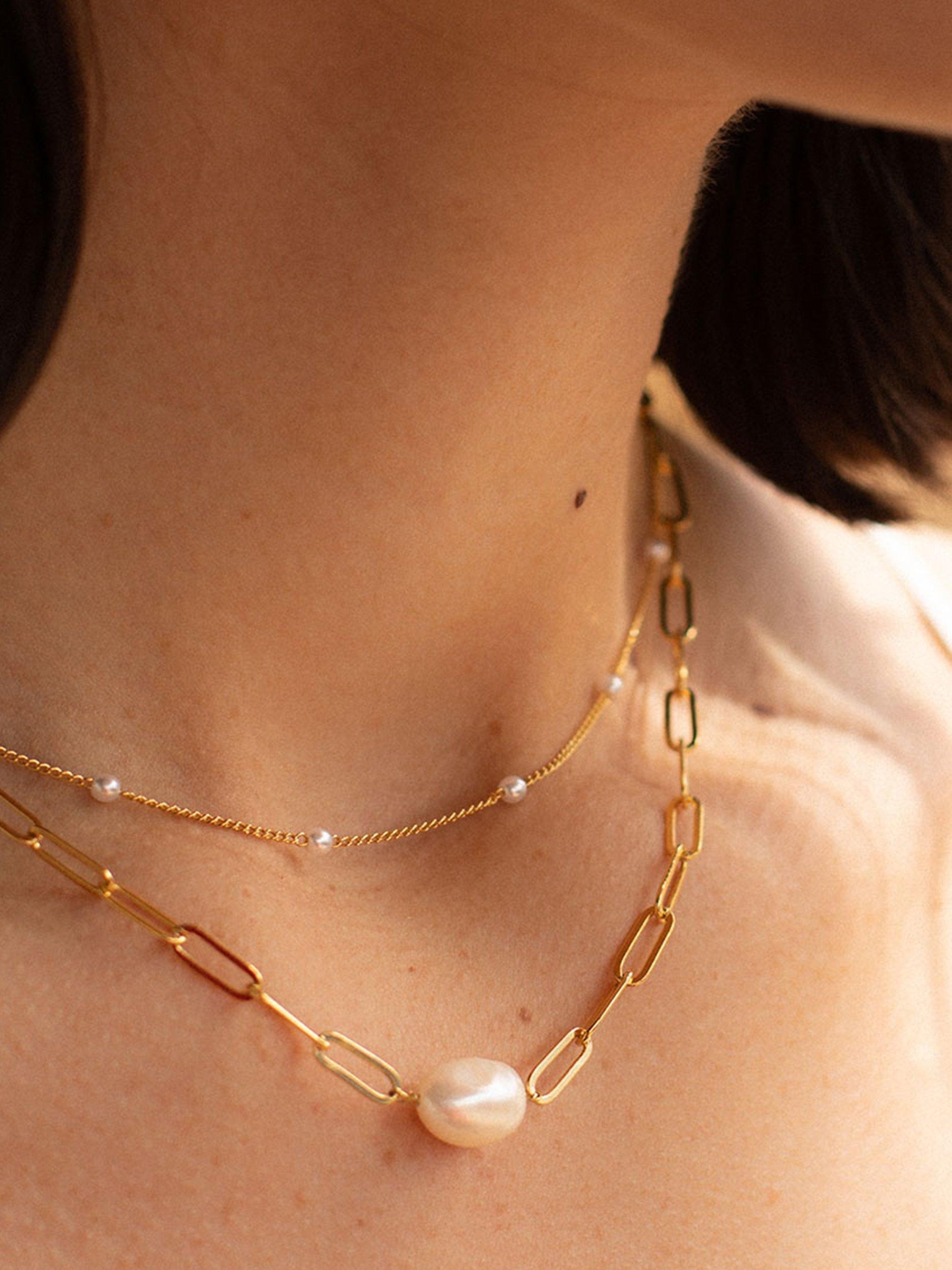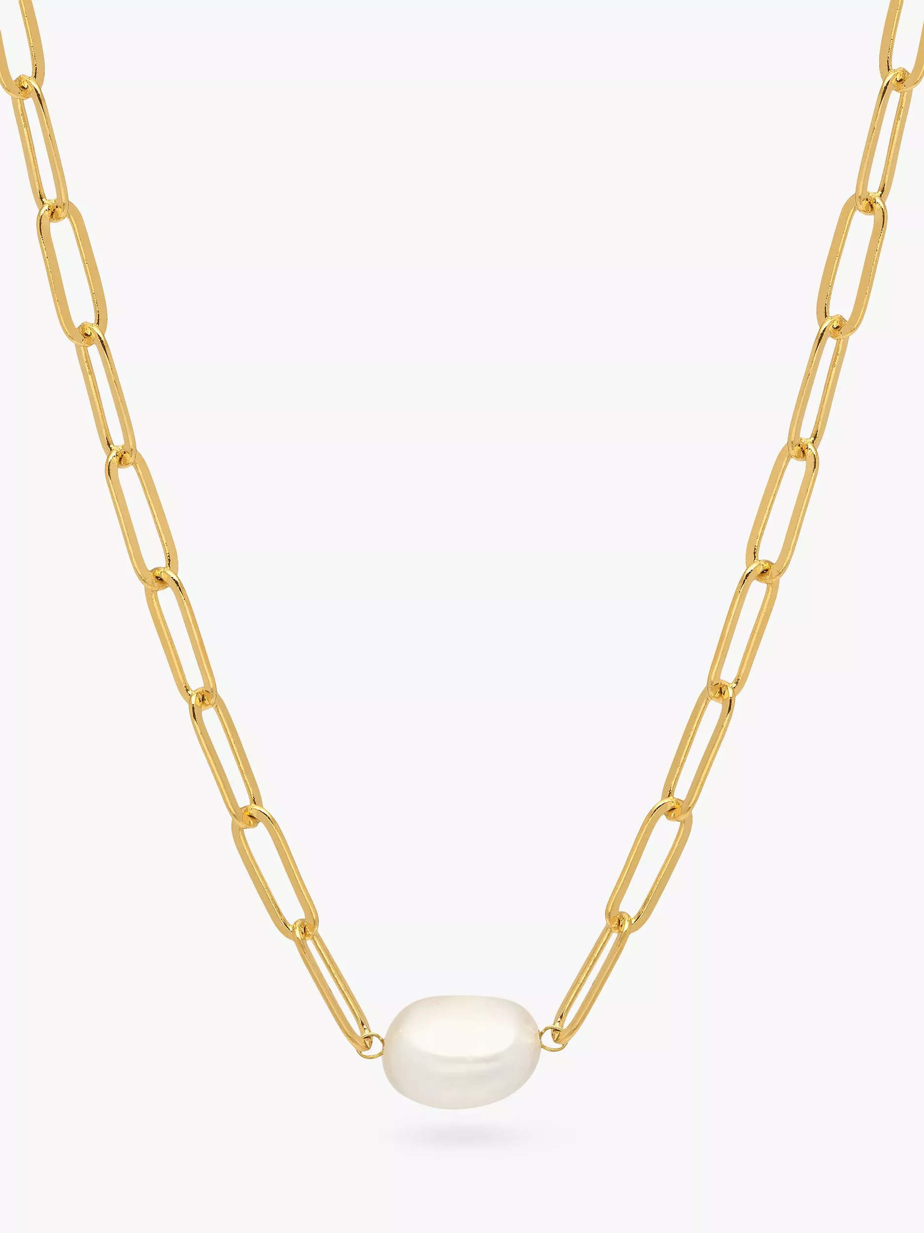 This modern twist on a classic design unites two of our styles staples. The soft textures of the natural pearl perfectly complement the geometric lines of the long link chain for a match made in heaven. Style solo or layer with minimalist gold chains
