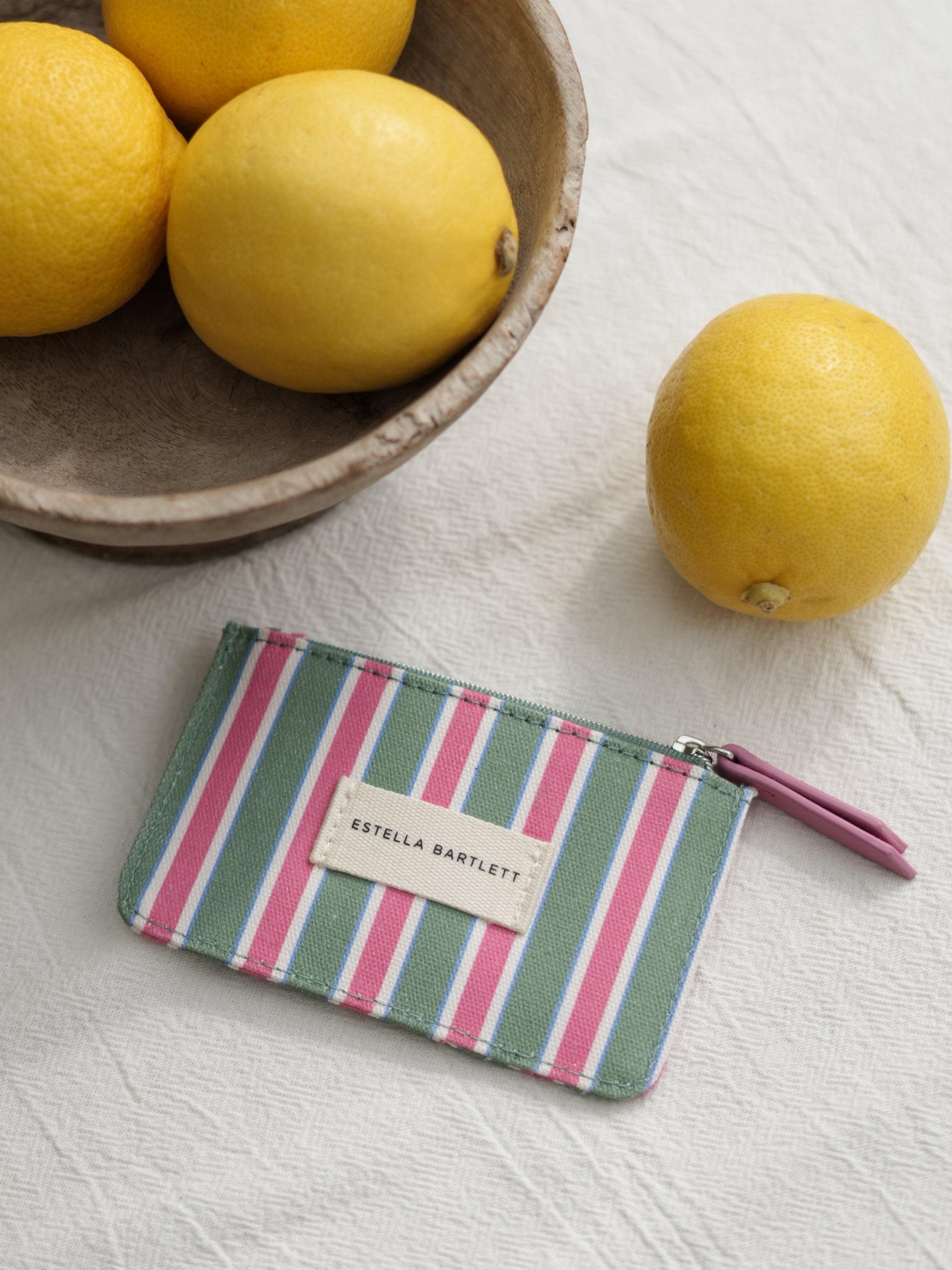 Keep your cards safe in the Green Stripe Card Purse. Featuring a playful striped print exterior in green, pink, blue, and cream, this practical purse has room for 4 cards, as well as a zipped section for coins, and will easily fit into your bag.