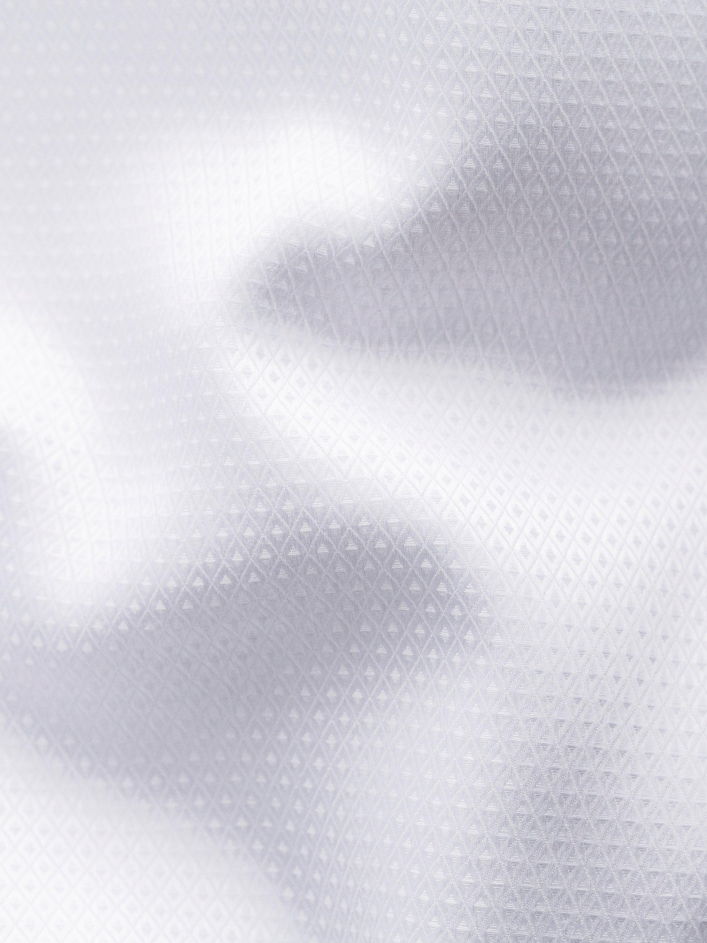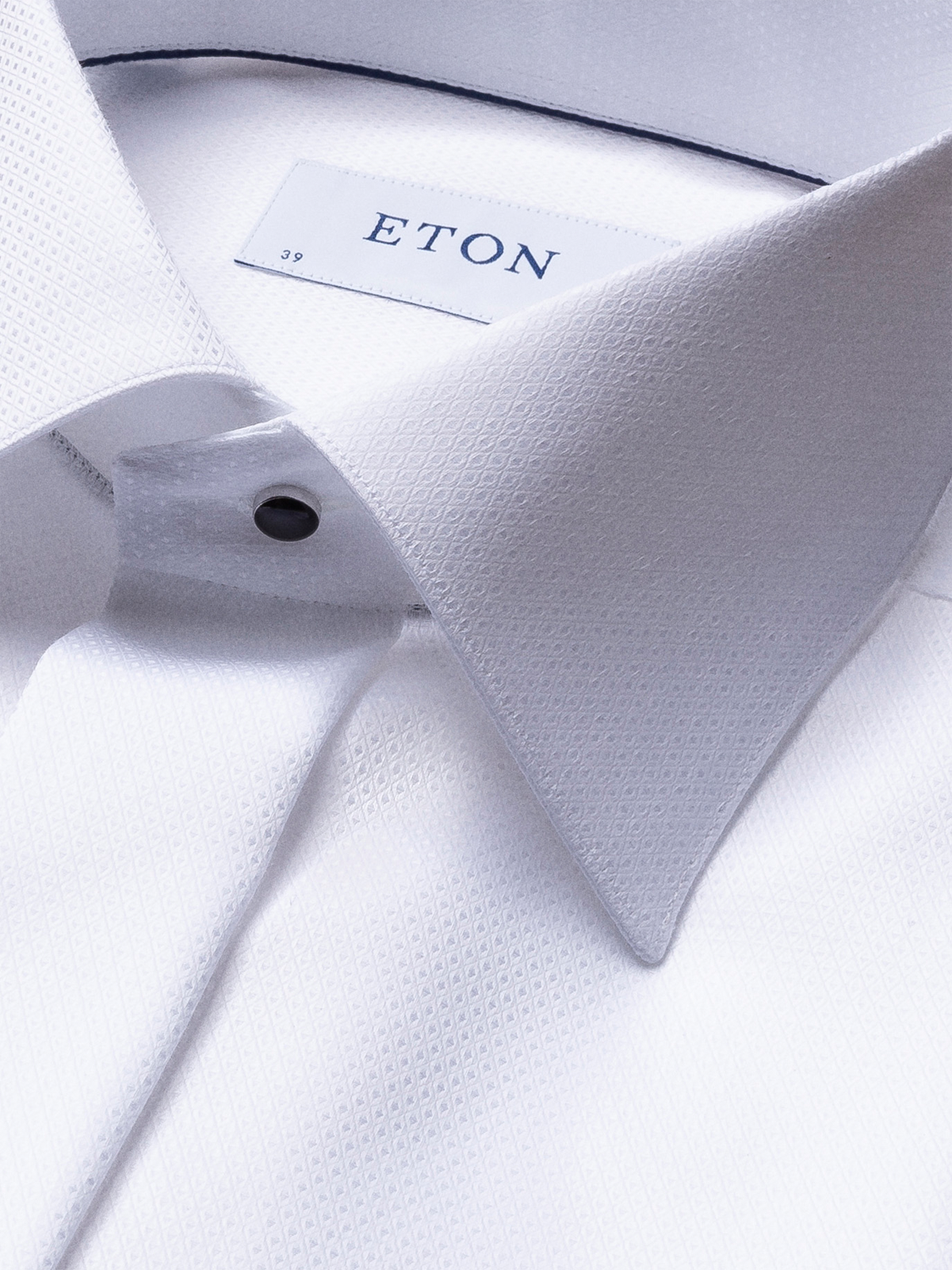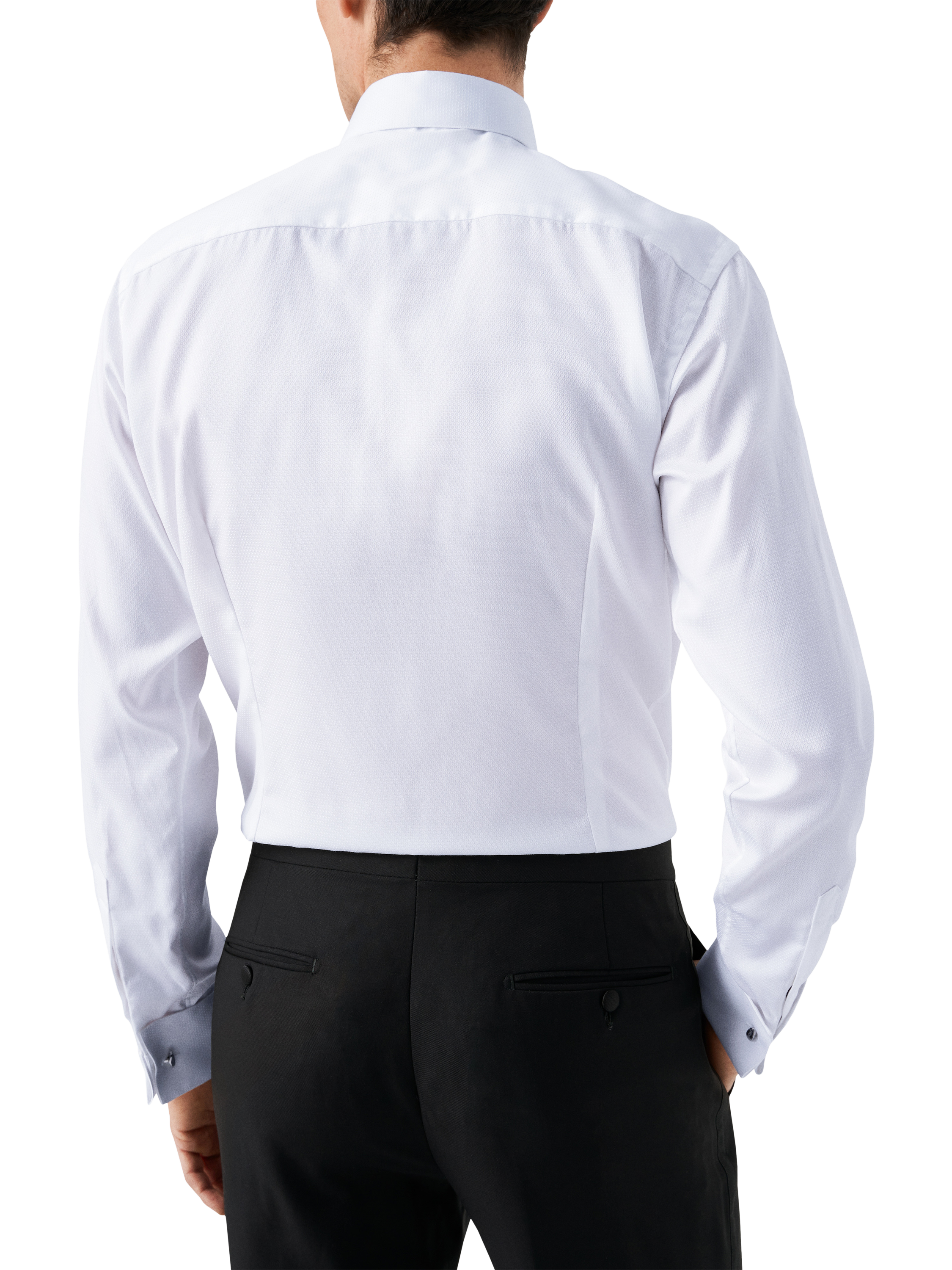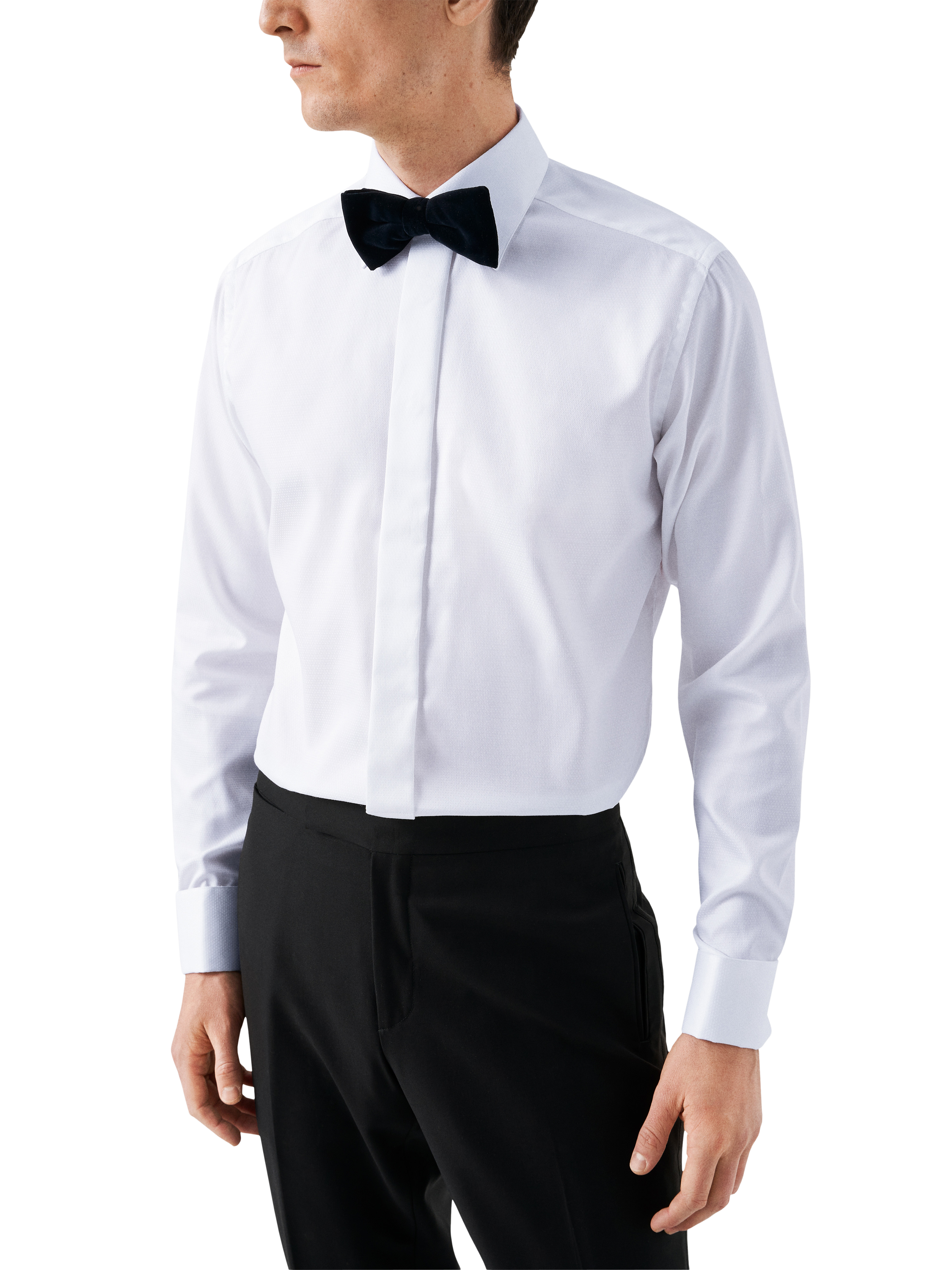 An elegant evening shirt, designed for black-tie events. The dobby fabric feels luxurious, and the weave adds a subtle geometric texture that elevates it further and adds additional luster. Made to be worn together with a tuxedo and a bow tie. Details such as a cut away collar, French cuffs, and hidden button placket creates the ultimate sophisticated look.