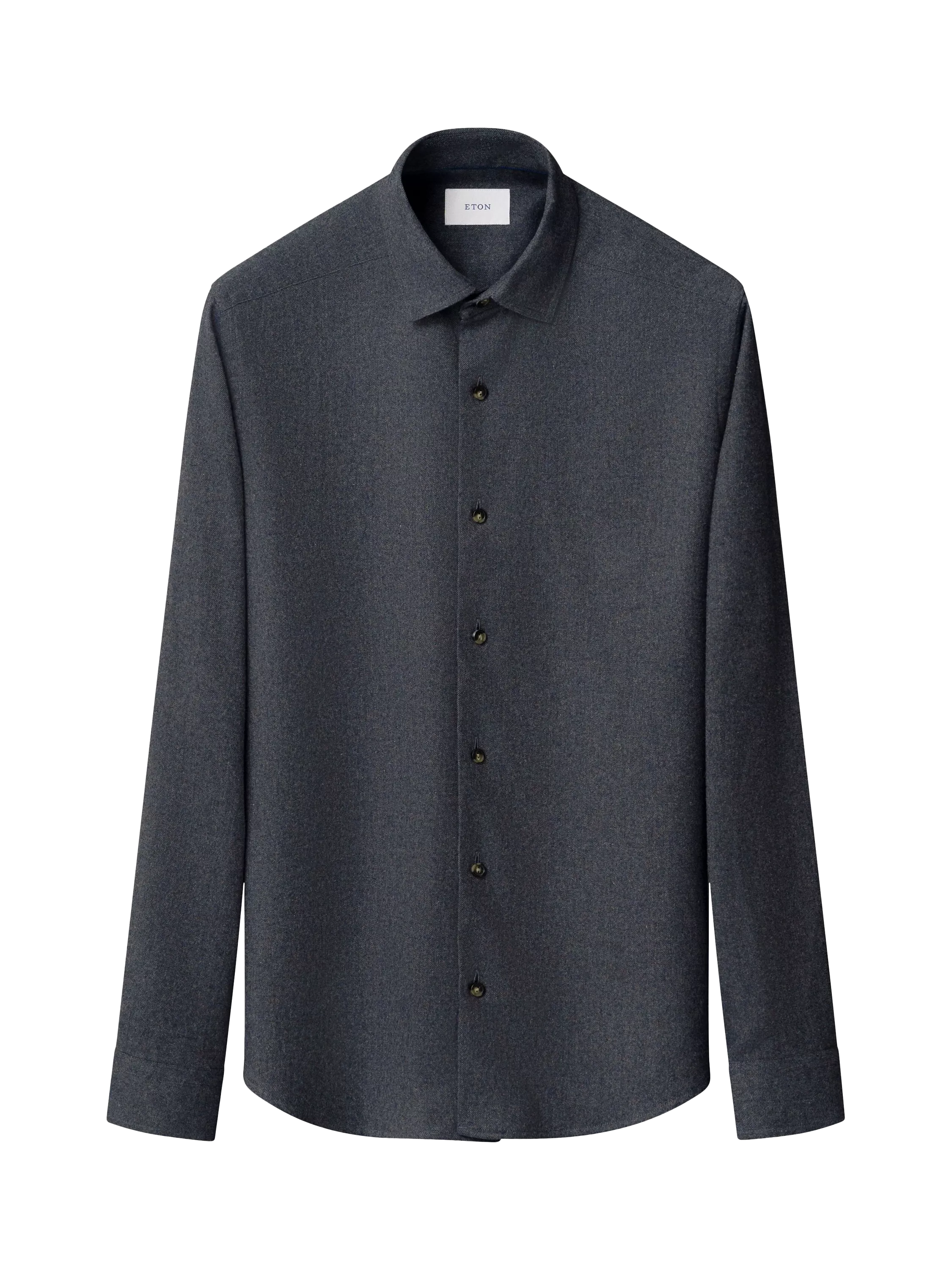 Made from a beautifully soft 100% cotton flannel fabric from Italian weaver Canclini, this stylish shirt is woven with a solid color design that enhances the smart twill structure and is perfect with knitwear or a soft jacket. The shirt is enhanced with horn-color buttons that are engraved with Eton 1928. The new casual fit has no darts at the back and the curved hem creates a versatile shirt that can be worn untucked or tucked in.