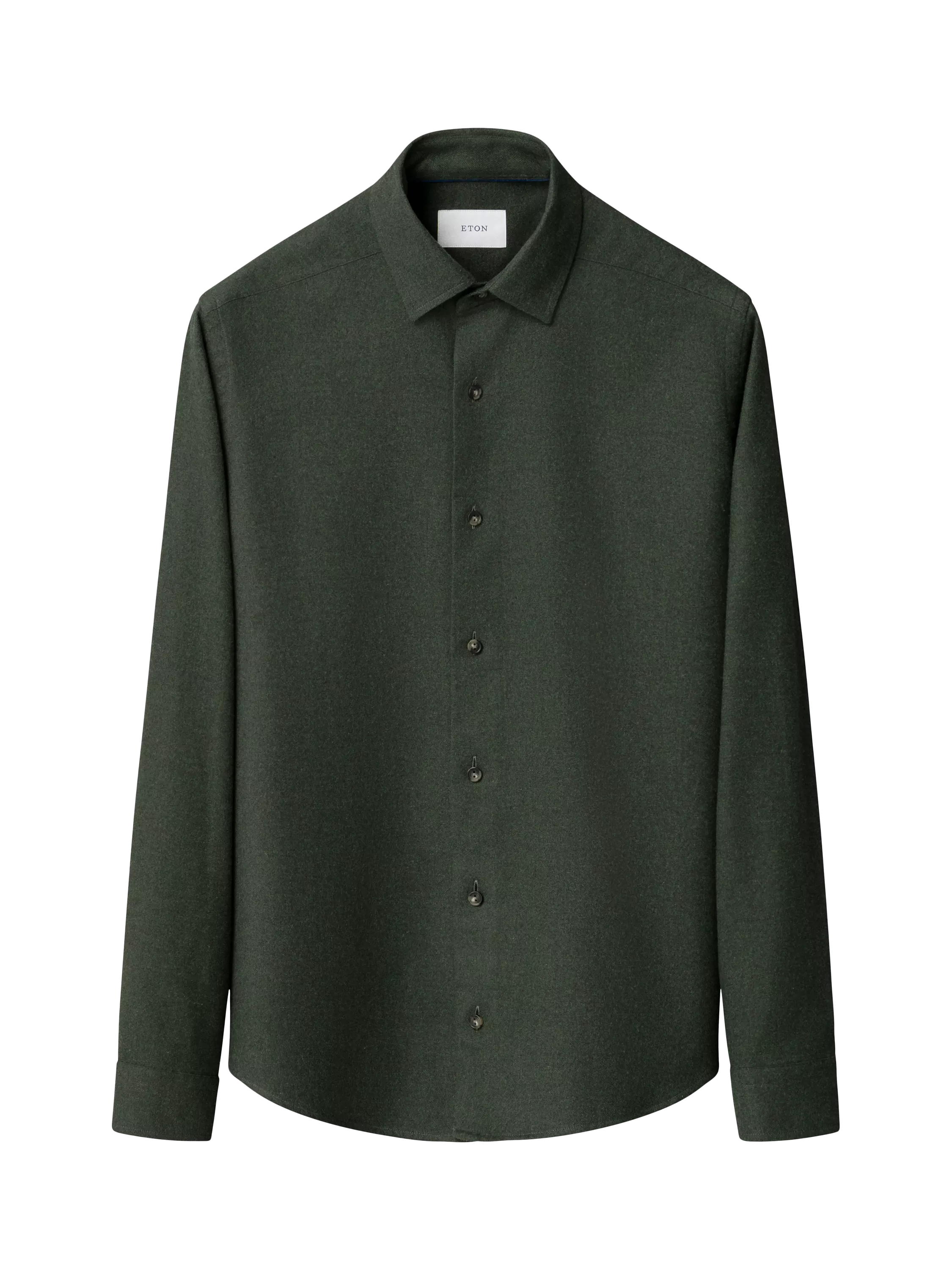 Made from a beautifully soft 100% cotton flannel fabric from Italian weaver Canclini, this stylish shirt is woven with a solid color design that enhances the smart twill structure and is perfect with knitwear or a soft jacket. The shirt is enhanced with horn-color buttons that are engraved with Eton 1928. The new casual fit has no darts at the back and the curved hem creates a versatile shirt that can be worn untucked or tucked in.