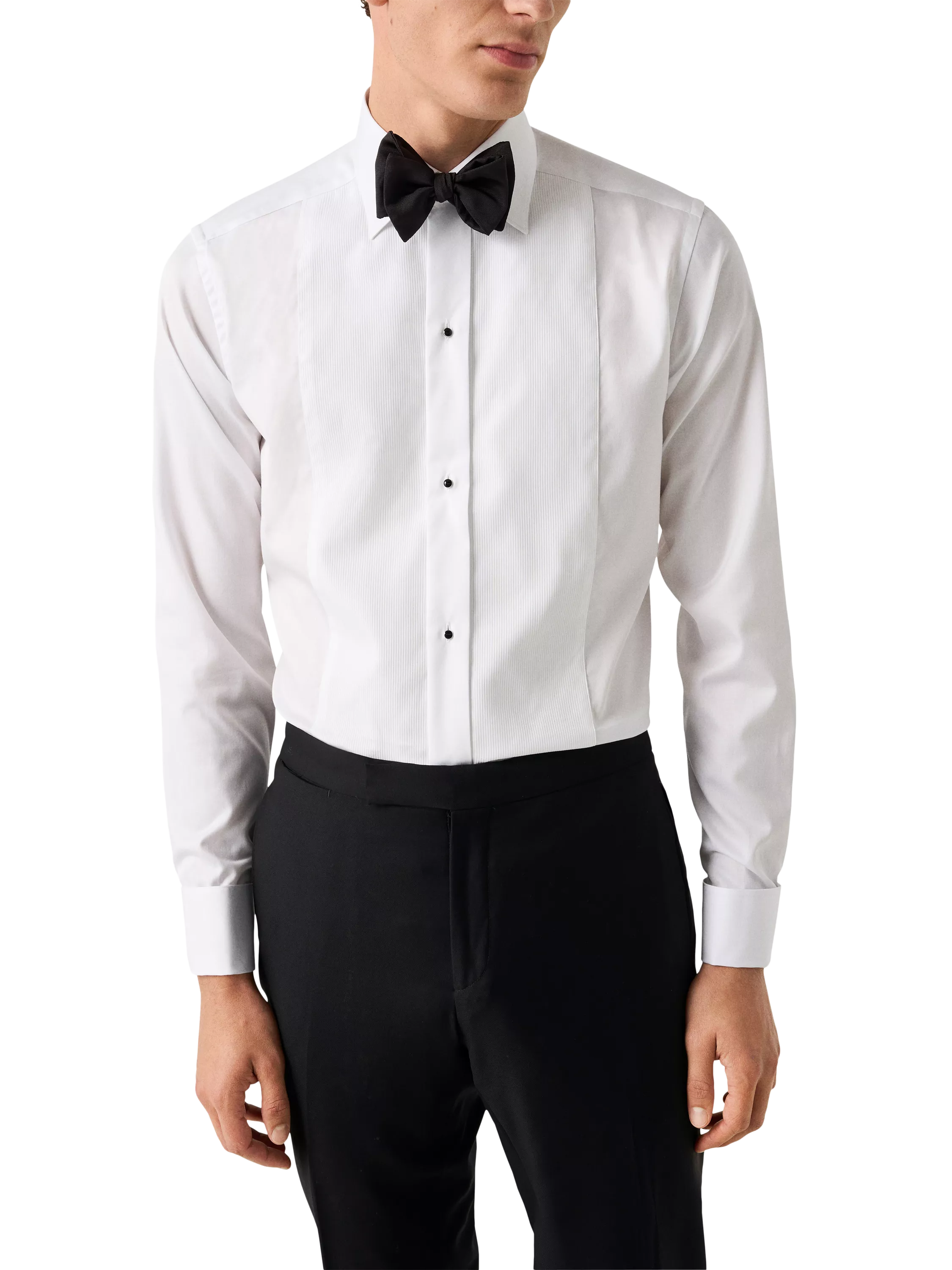 Elevate your evening attire with a modern yet timeless evening shirt in a fine stripe. A bib front is elevated by a fine pique fabric with subtle texture, while the fly front keeps buttoning discreet. Elegant stitching on the collar and cuffs gives a timeless touch your evening wear ensemble.