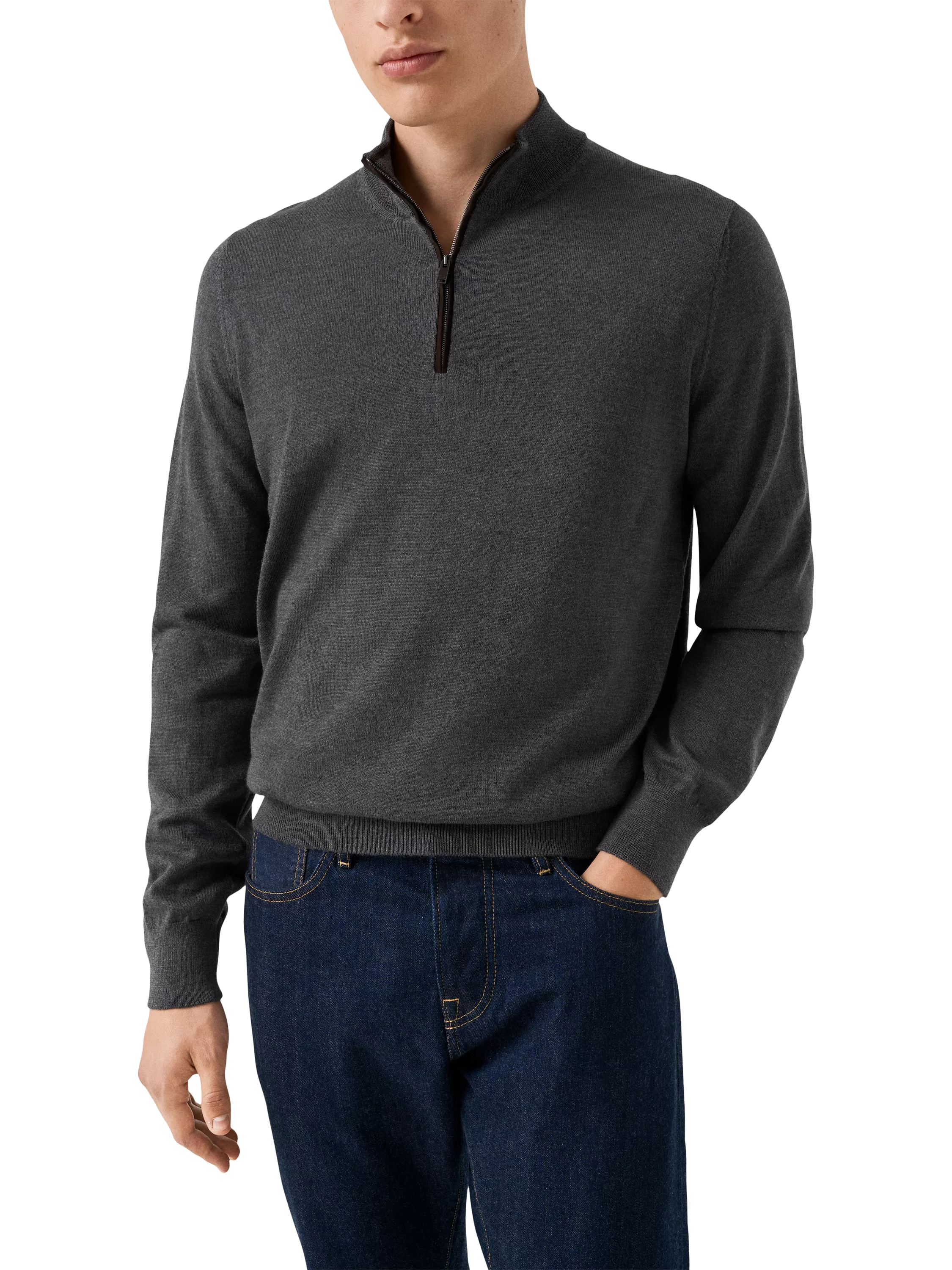 A versatile half-zip polo made from 12-gauge extra-fine Merino wool. Features leather trimmings along the zipper, a tightly knitted collar and cuffs. Crafted in Italy's Venice region.