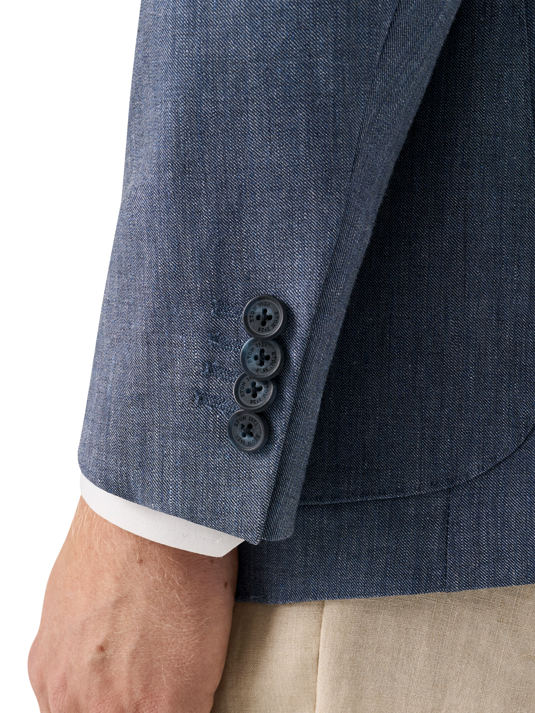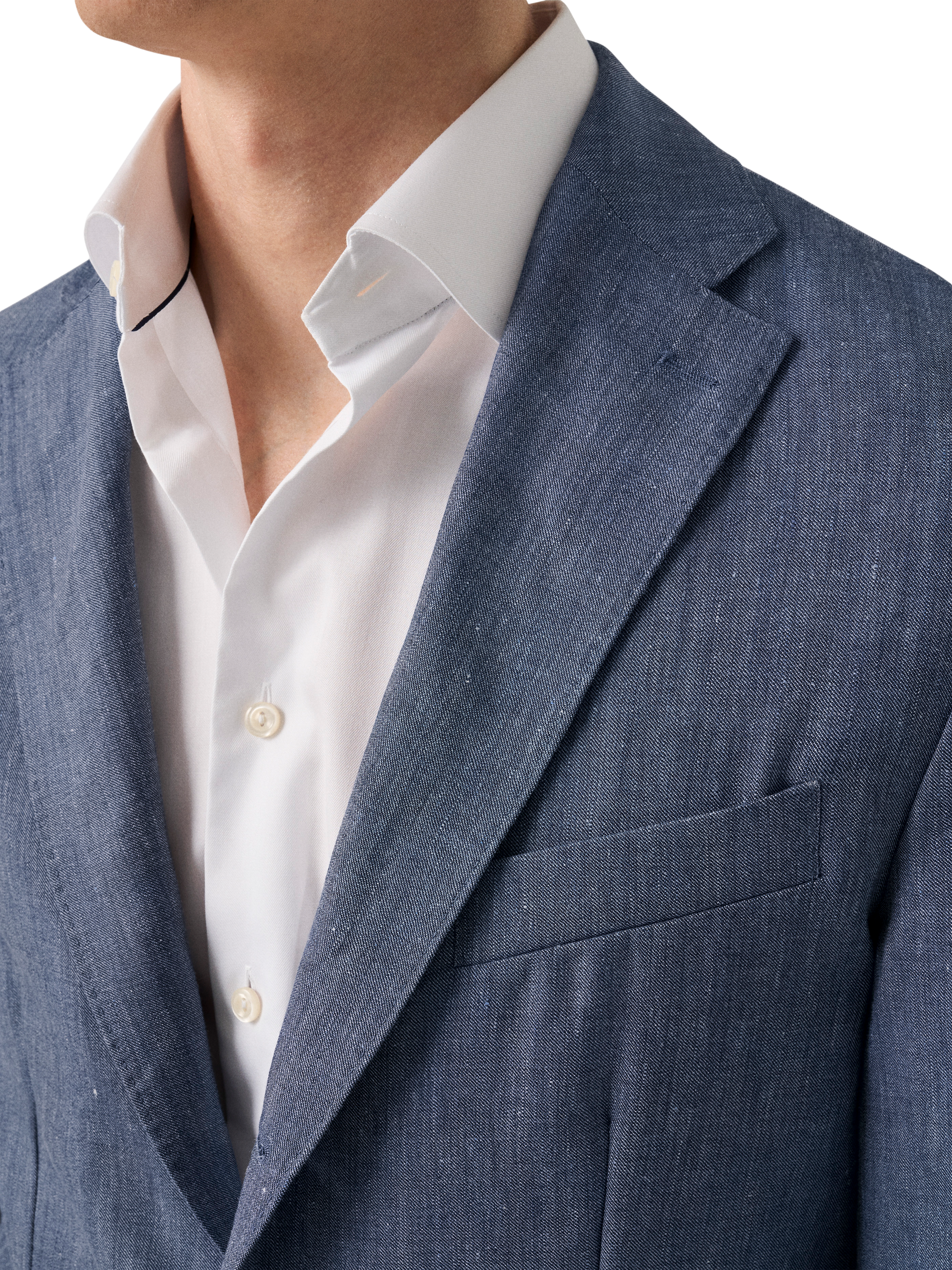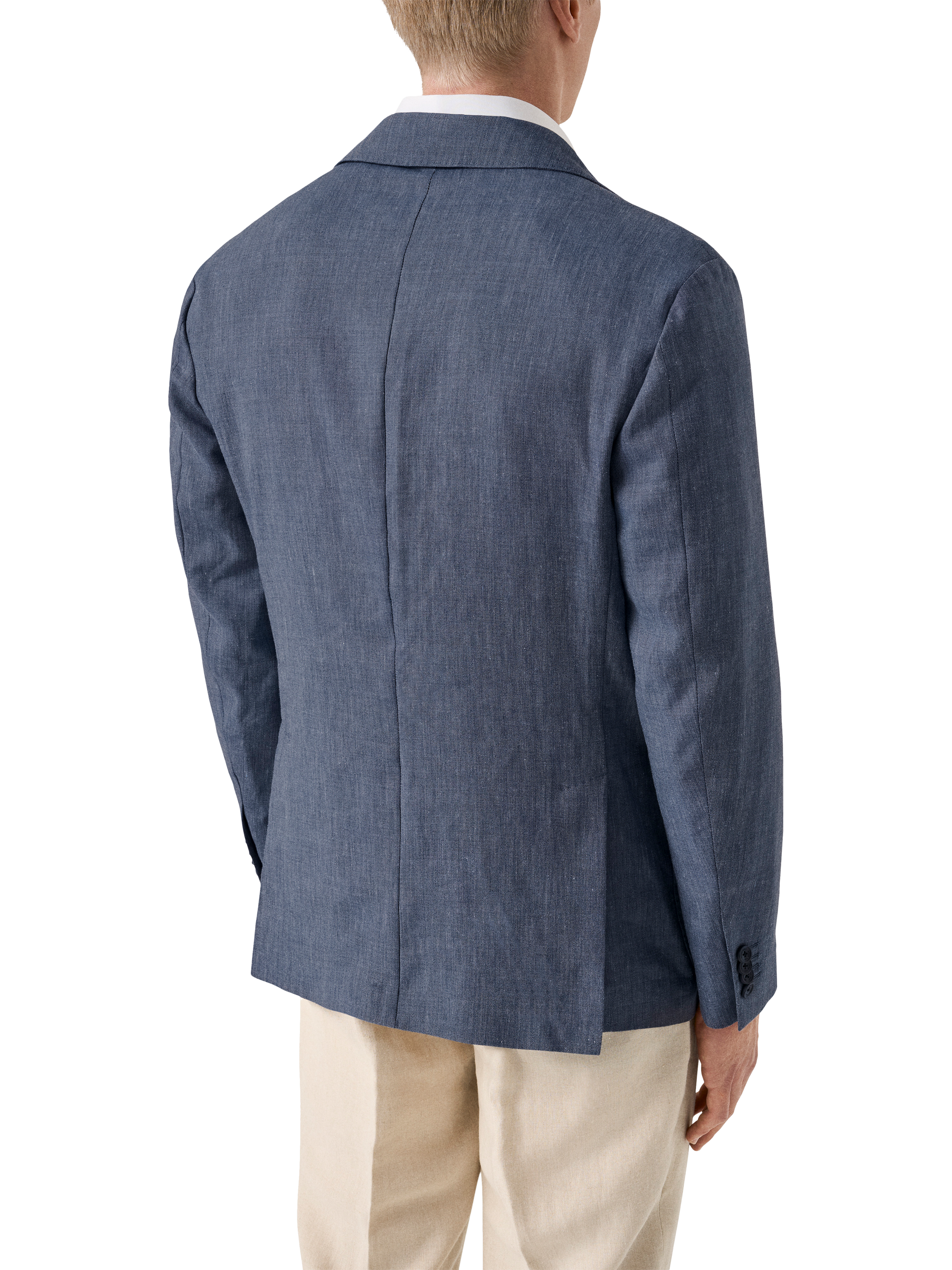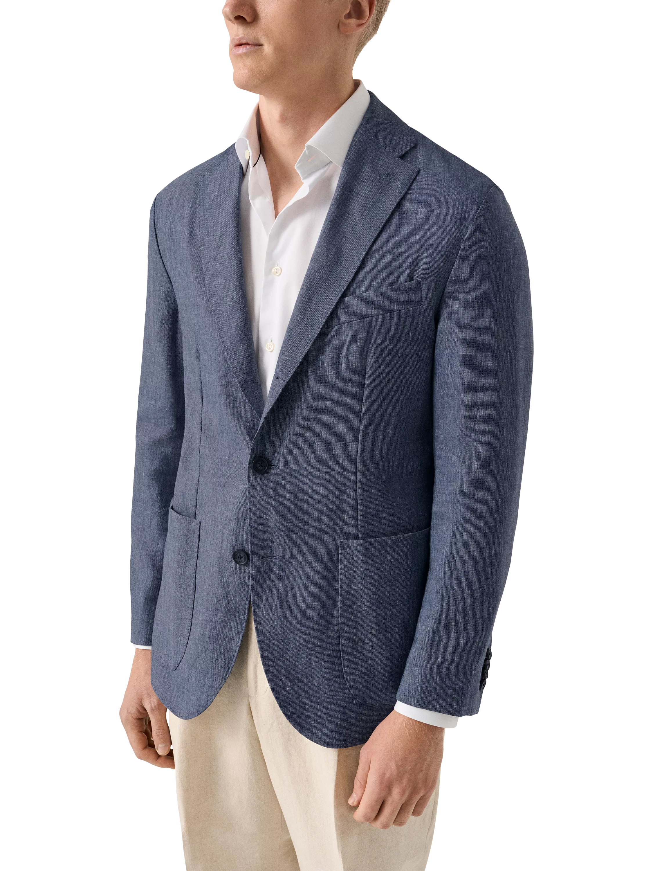 The three-roll-two button front allows the lapel to roll down when the top button is left undone, creating a relaxed yet refined look. Designed for a natural, elegant fit with soft shoulders and a slightly tapered waist, this jacket is perfect for smart-casual occasions.