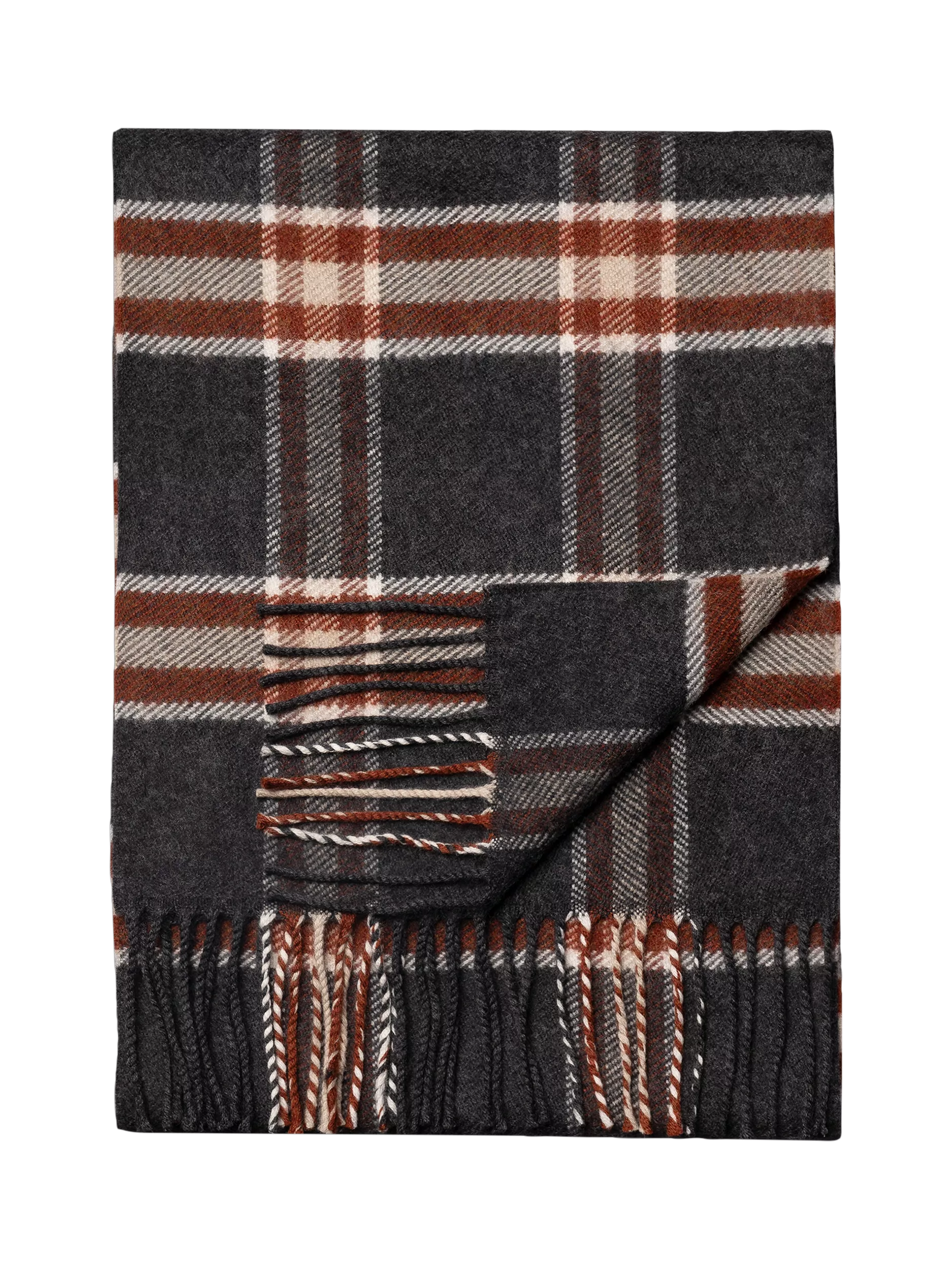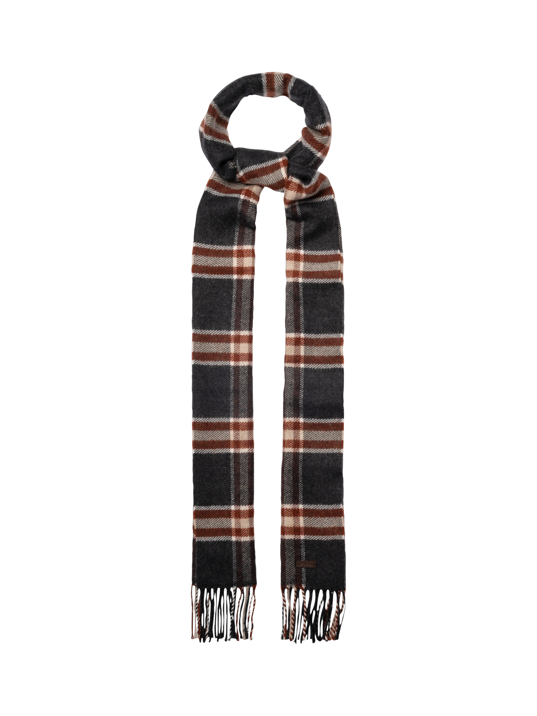 Woven from ultra-soft 100% Merino wool, this scarf features a timeless plaid check pattern. A small branded leather patch adds an elegant finishing touch. Made in Italy. Dimensions: 30 x 200 cm.