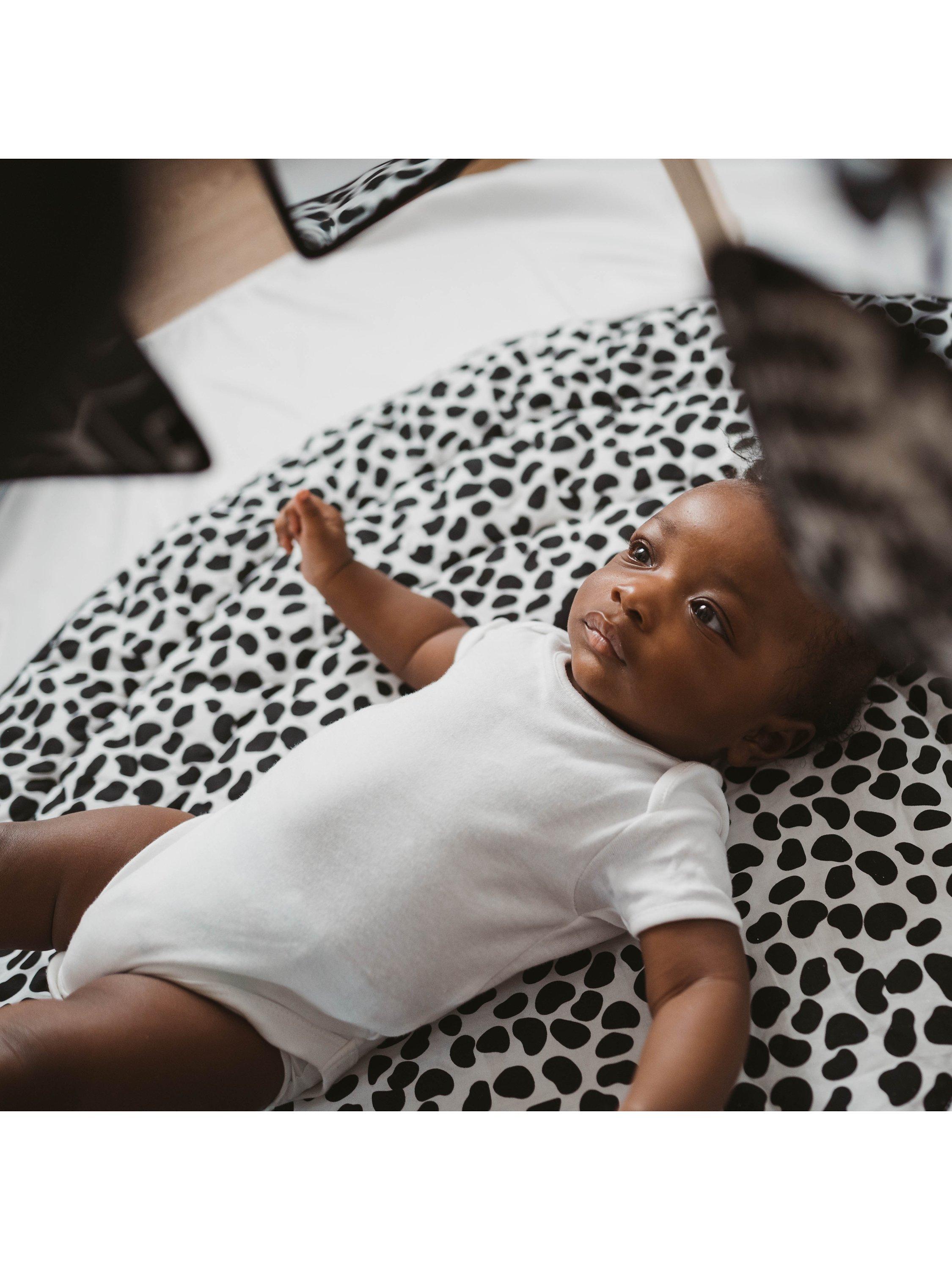 In soft cotton with a comfy padded fill one side has a monochrome dalmatian print (suitable for newborns to 4 months) and the other has a colourful leopard print (for 5+ months). It's been designed alongside experts in infant vision to support babies' visual and cognitive development throughout their first year and the patterns also encourage babies to use their back, neck and shoulder muscles (helping them prepare for rolling and crawling) as they'll want to push up to make more sense of the print designed for their visual ability.