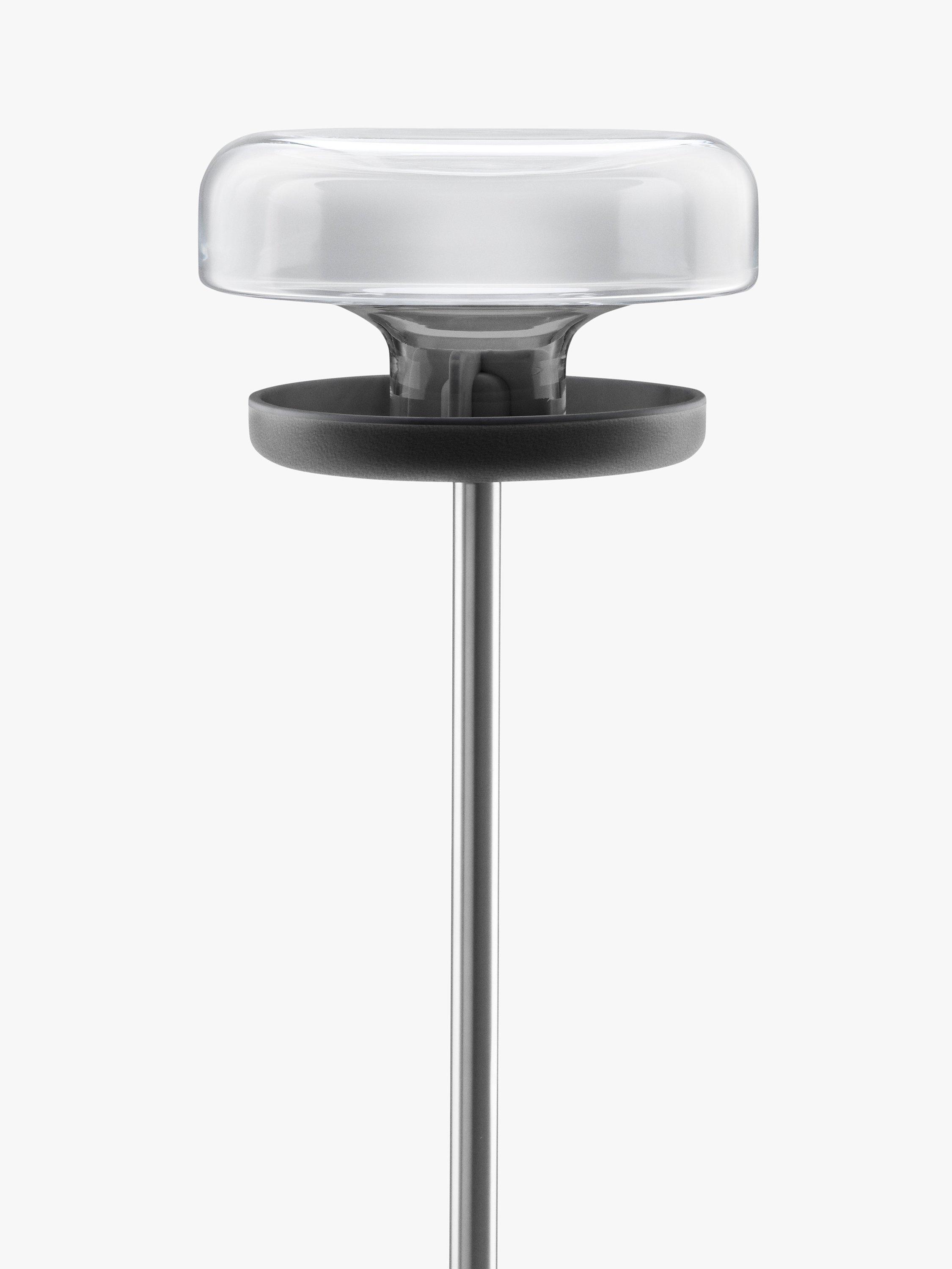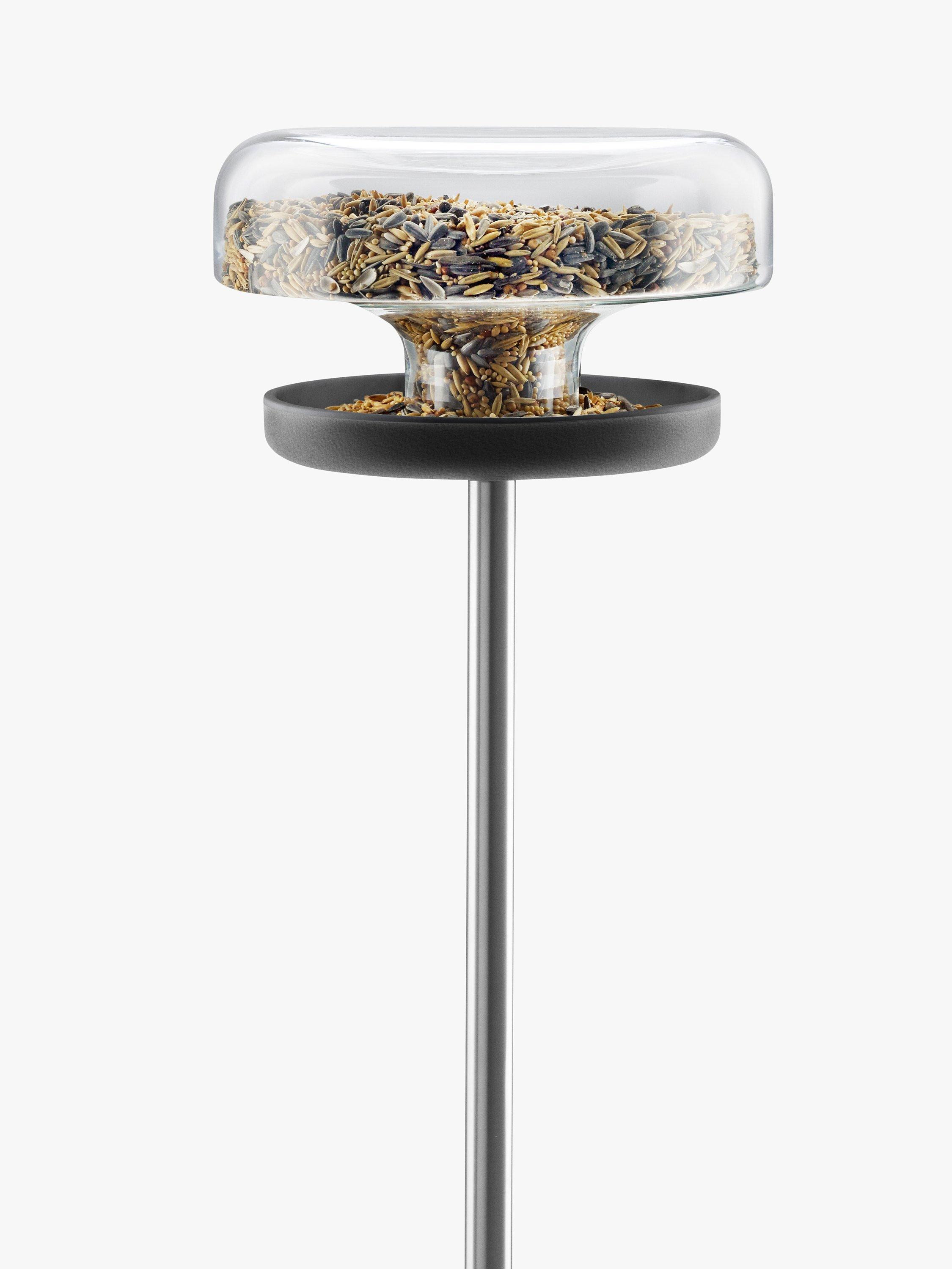 It's designed with two main parts. At the top is the glass dispenser which holds up to 2 litres of food and is easily detached when it's time for a refill. It's also dishwasher-safe and frost-proof for use all year round. Below the dispenser is a table that small birds can easily perch on to feed, but is too shallow for large birds.