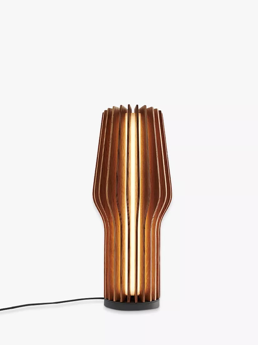 The lamp gives you four hours of illumination at full brightness on just one charge. Easy to charge, simply place the lamp on the accompanying base and charge via the USB socket. Sculptural and decorative, this LED table lamp is made of oak wood. It's ideal for atmospheric lighting with up to 33 hours of illumination without being returned to its base.