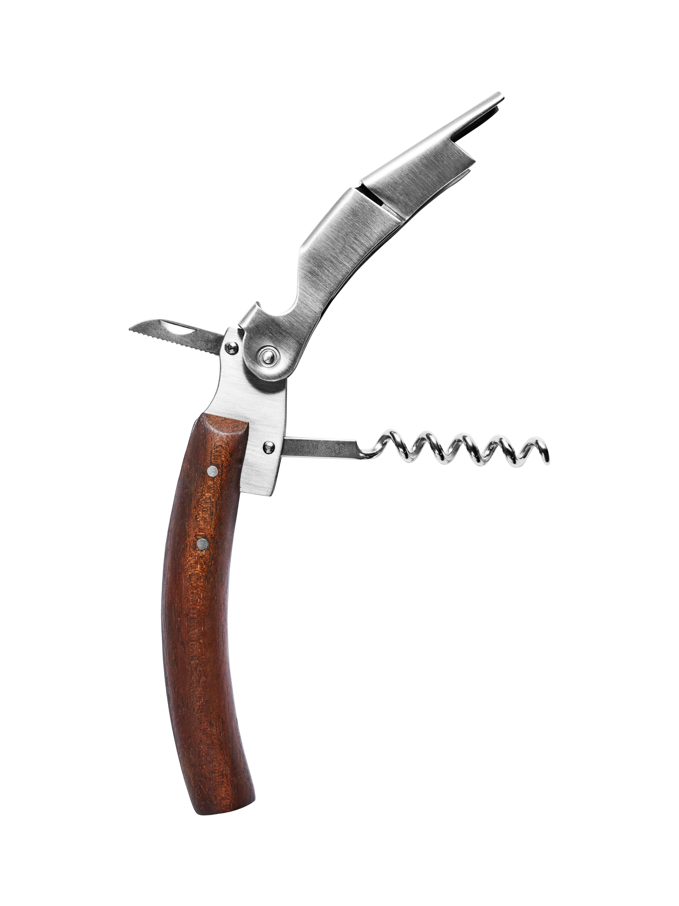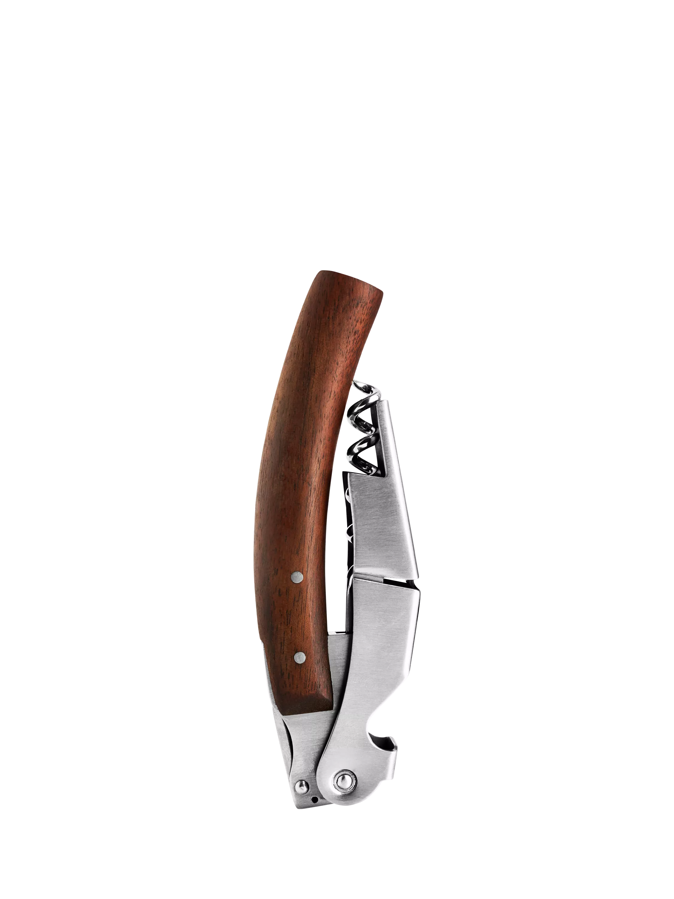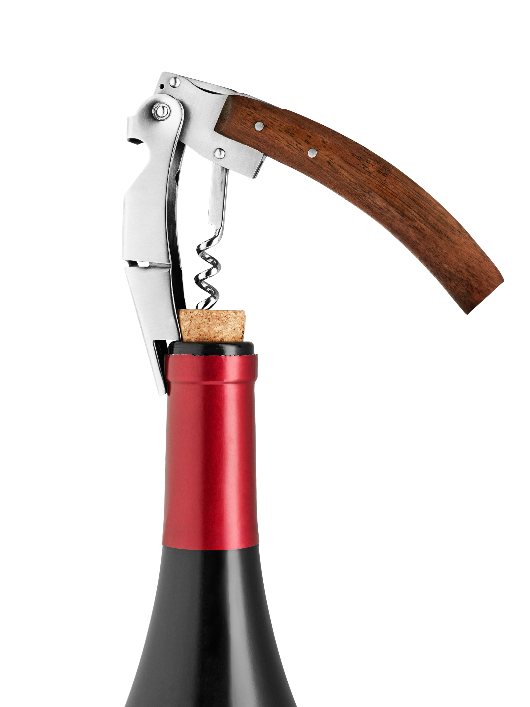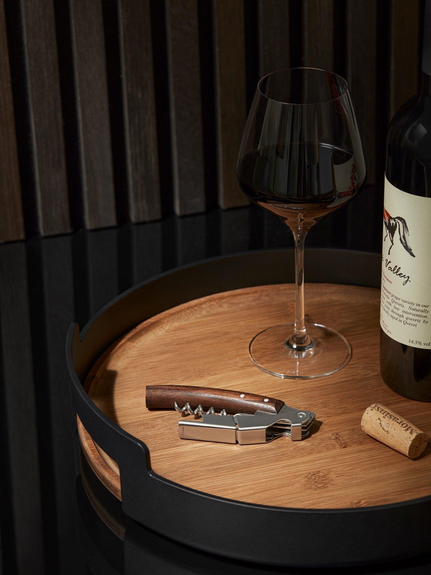 This corkscrew is an elegant, practical must-have for any wine-lover. It's equipped with a small knife for foil cutting, a bottle opener for removing caps and a worm, which, combined with the ingenious two-step system, ensures deft uncorking without the risk of cork breakage.