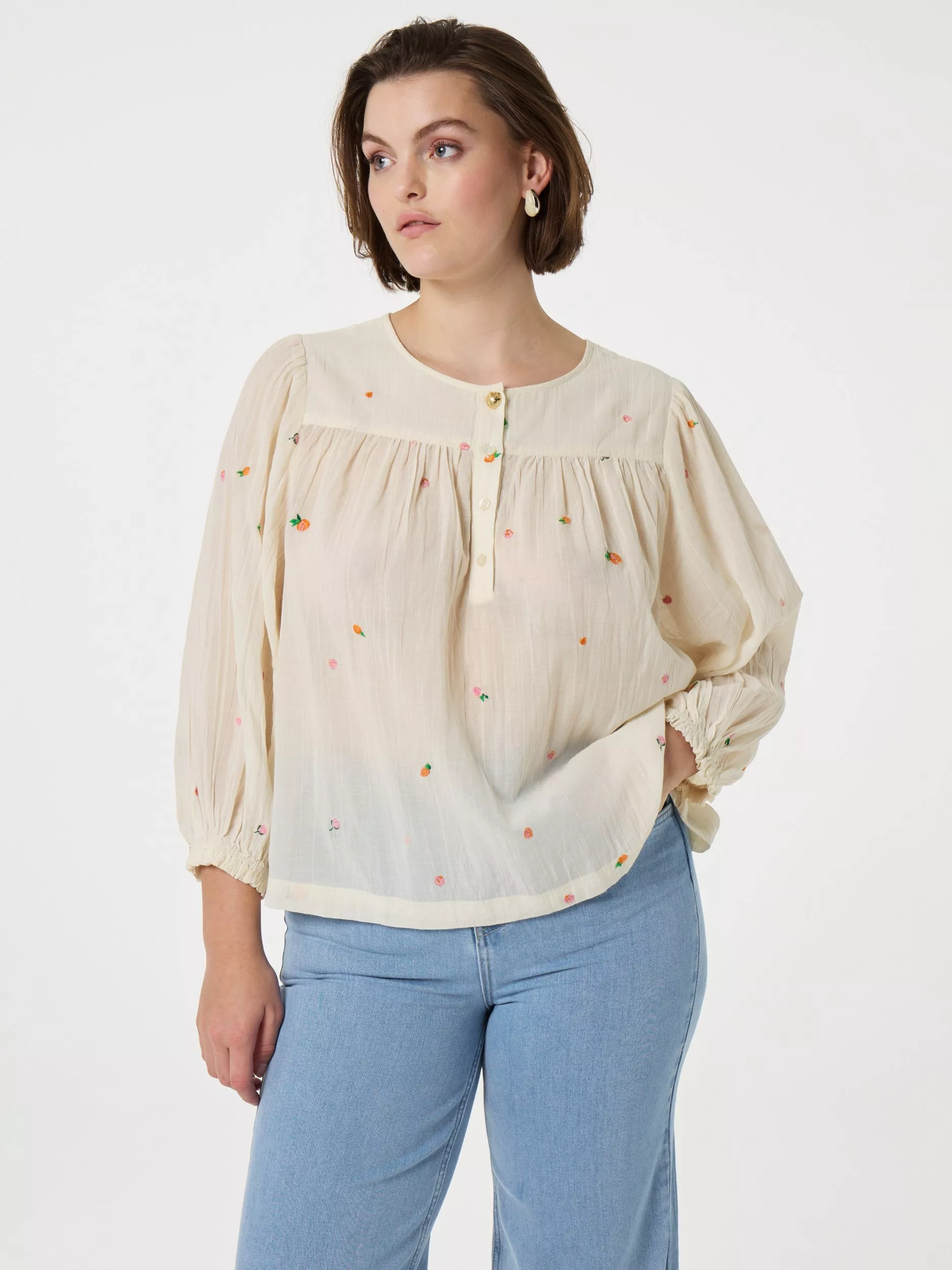 A cheesecloth embroidered 3/4 length sleeve blouse with elasticated cuffs.