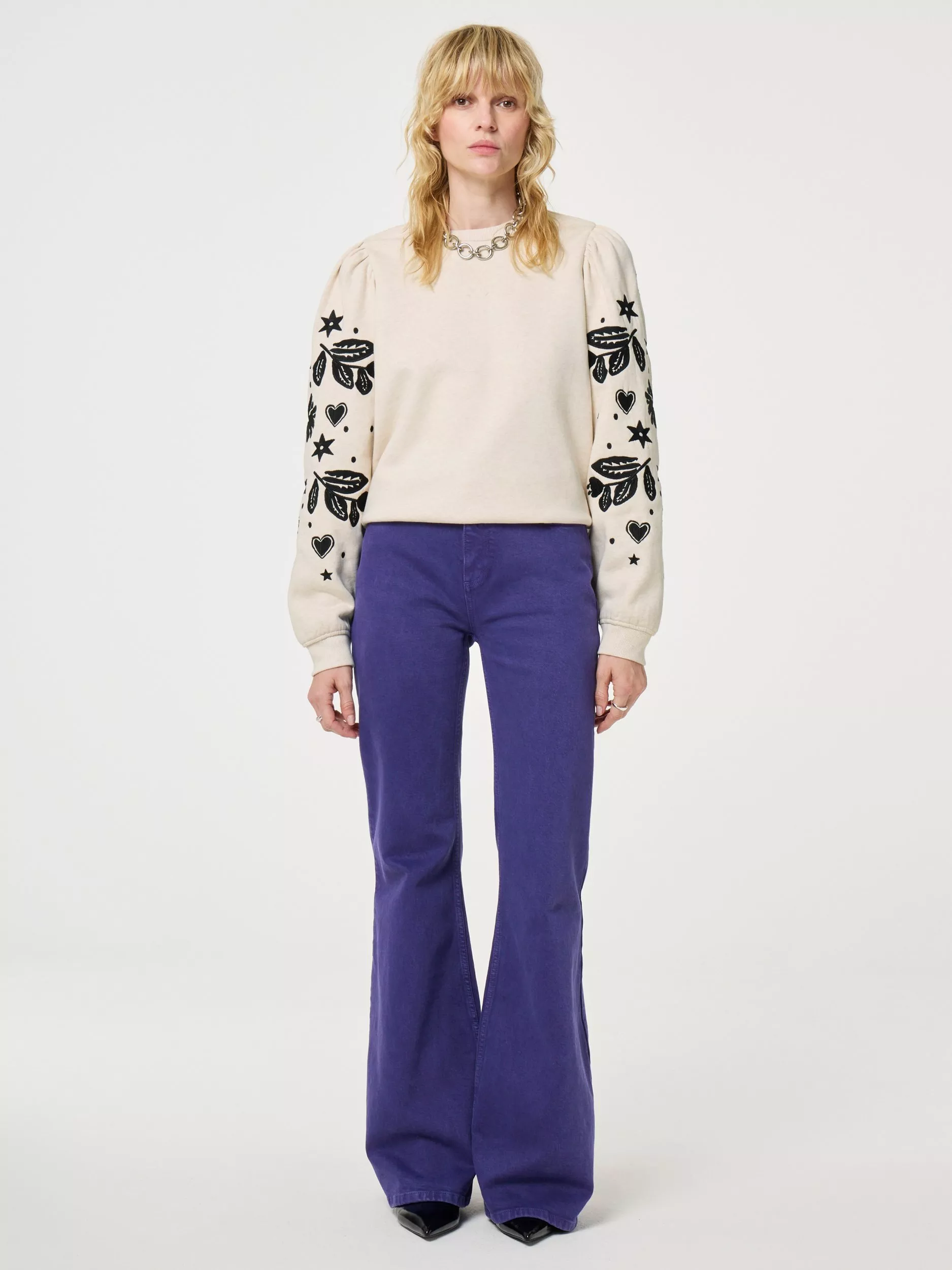 Formed using organic cotton, this crew neck jumper by Fabienne Chapot adds a pretty feel to your look with an embroidered design at the sleeves.