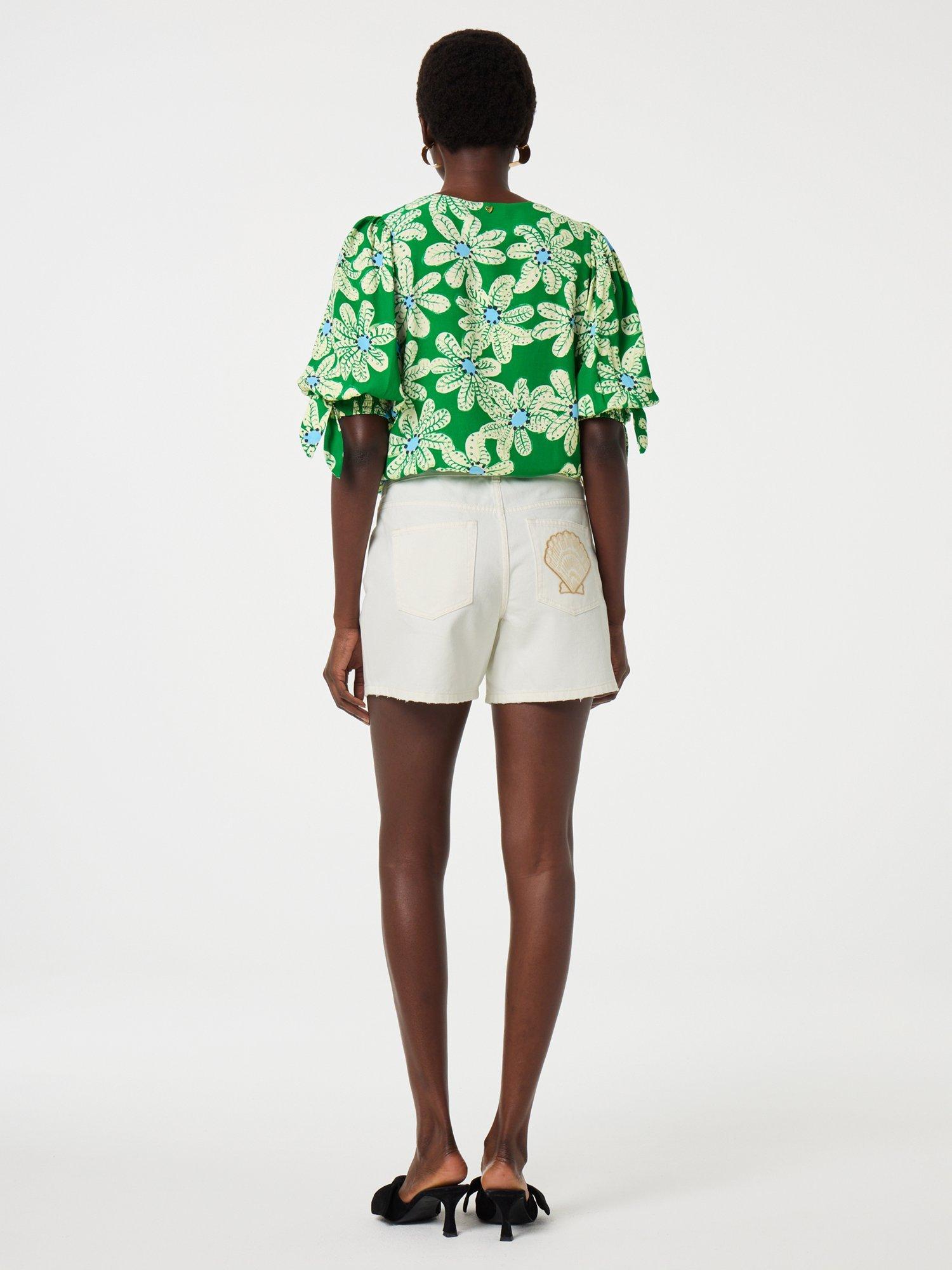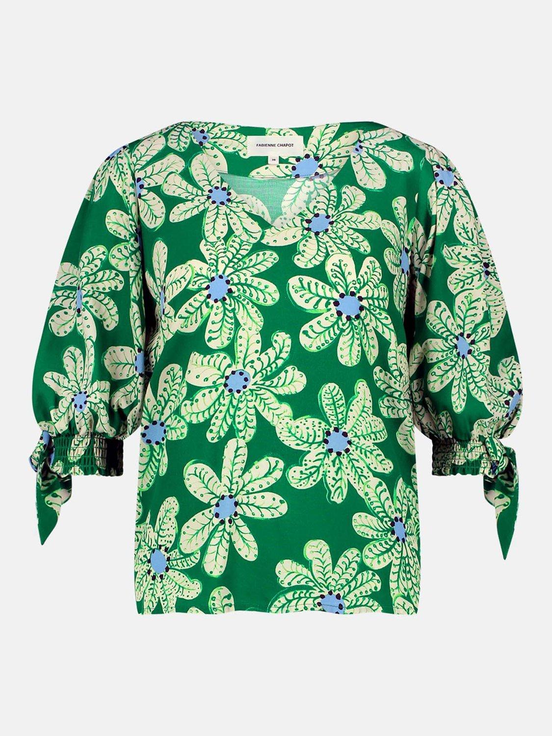 A regular fit V neck floral blouse with a 3/4 sleeve and tie cuff detail.