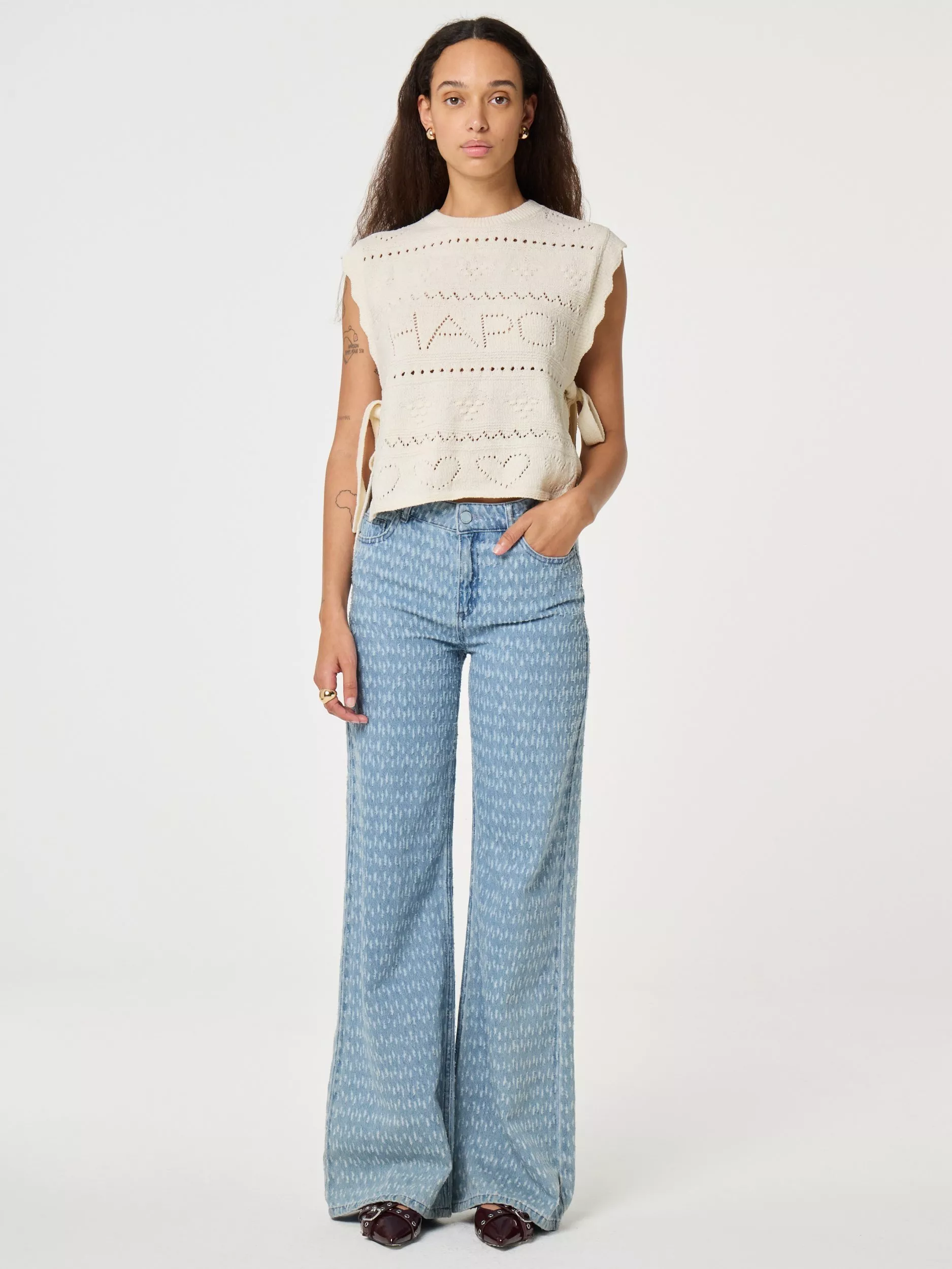 These light blue wide-leg jeans feature a subtle all-over print of white half circles. Made from 100% organic cotton, they offer comfort and a distinctive look – ideal for making a stylish everyday statement.