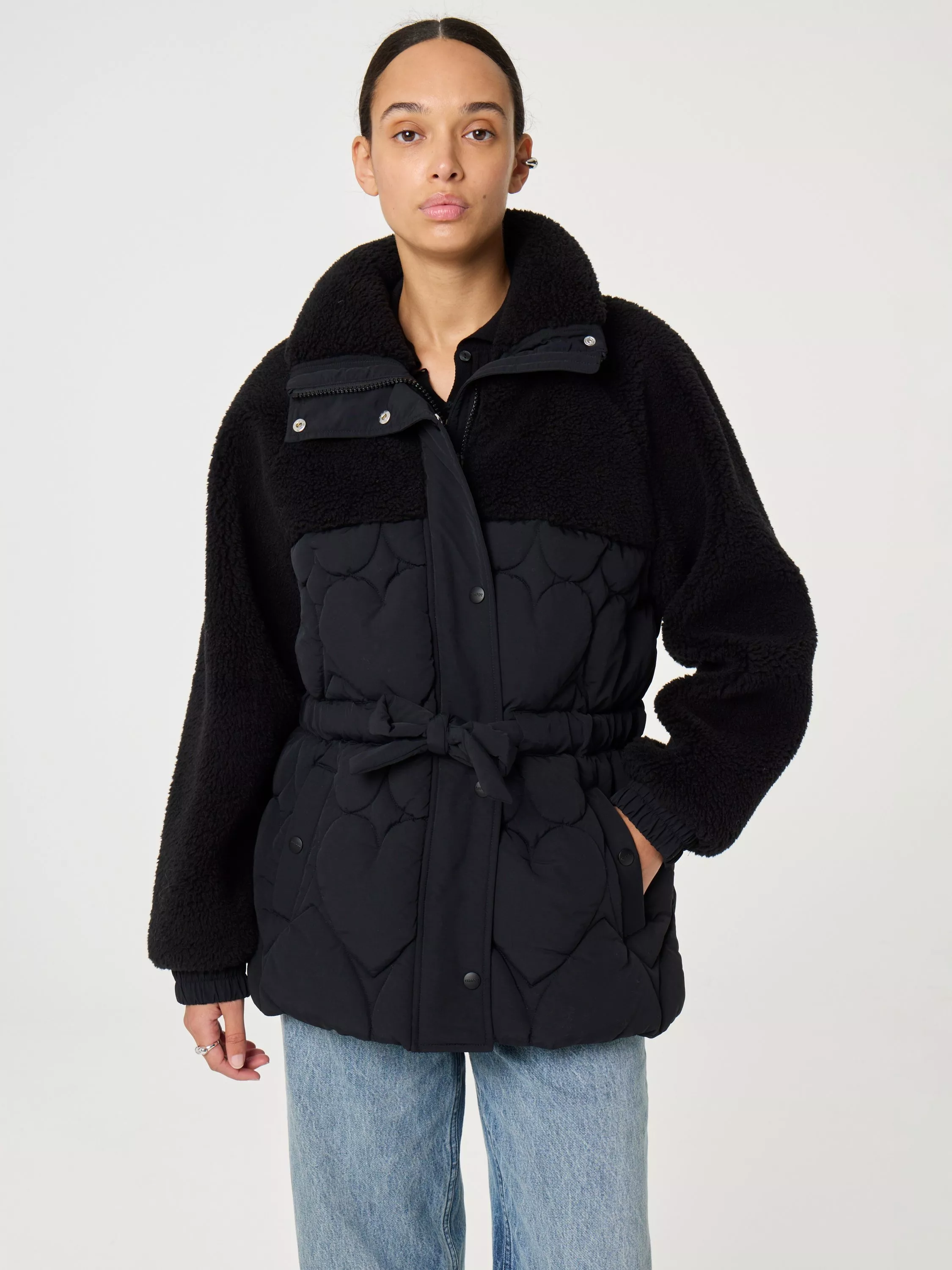 This puffer coat keeps you warm and comfortable, with a playful heart pattern and clever textured finish. The funnel neck and secure fastening help you face chilly days confidently, while its straight cut adds versatility to your daily wardrobe.