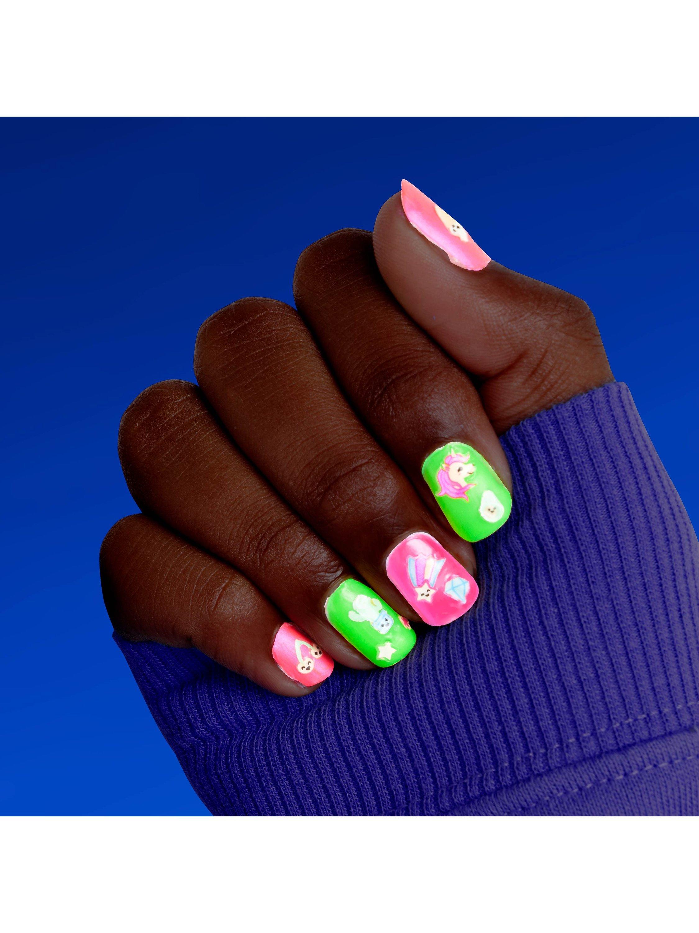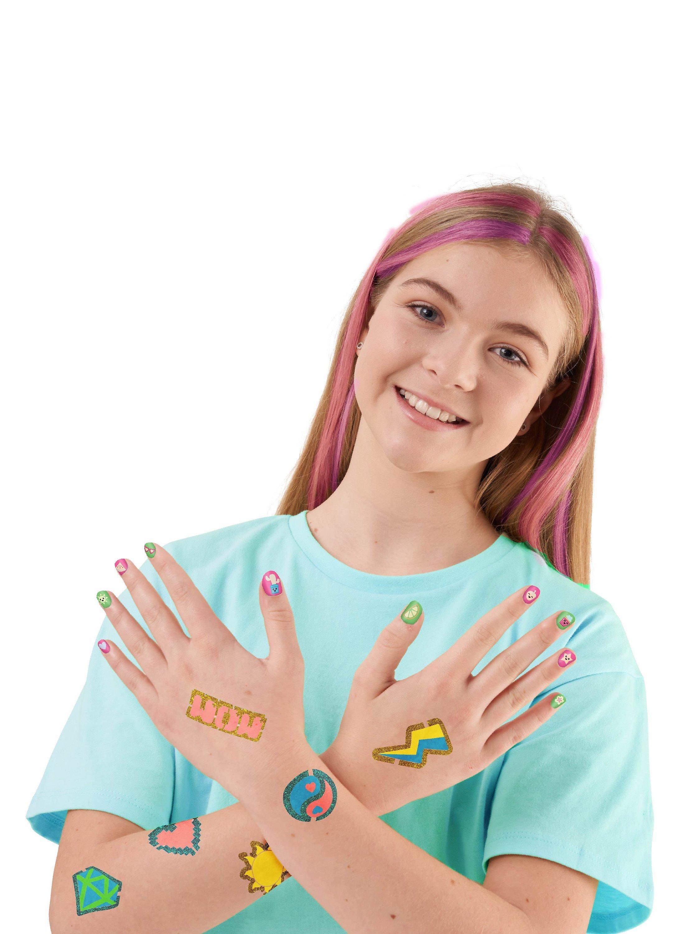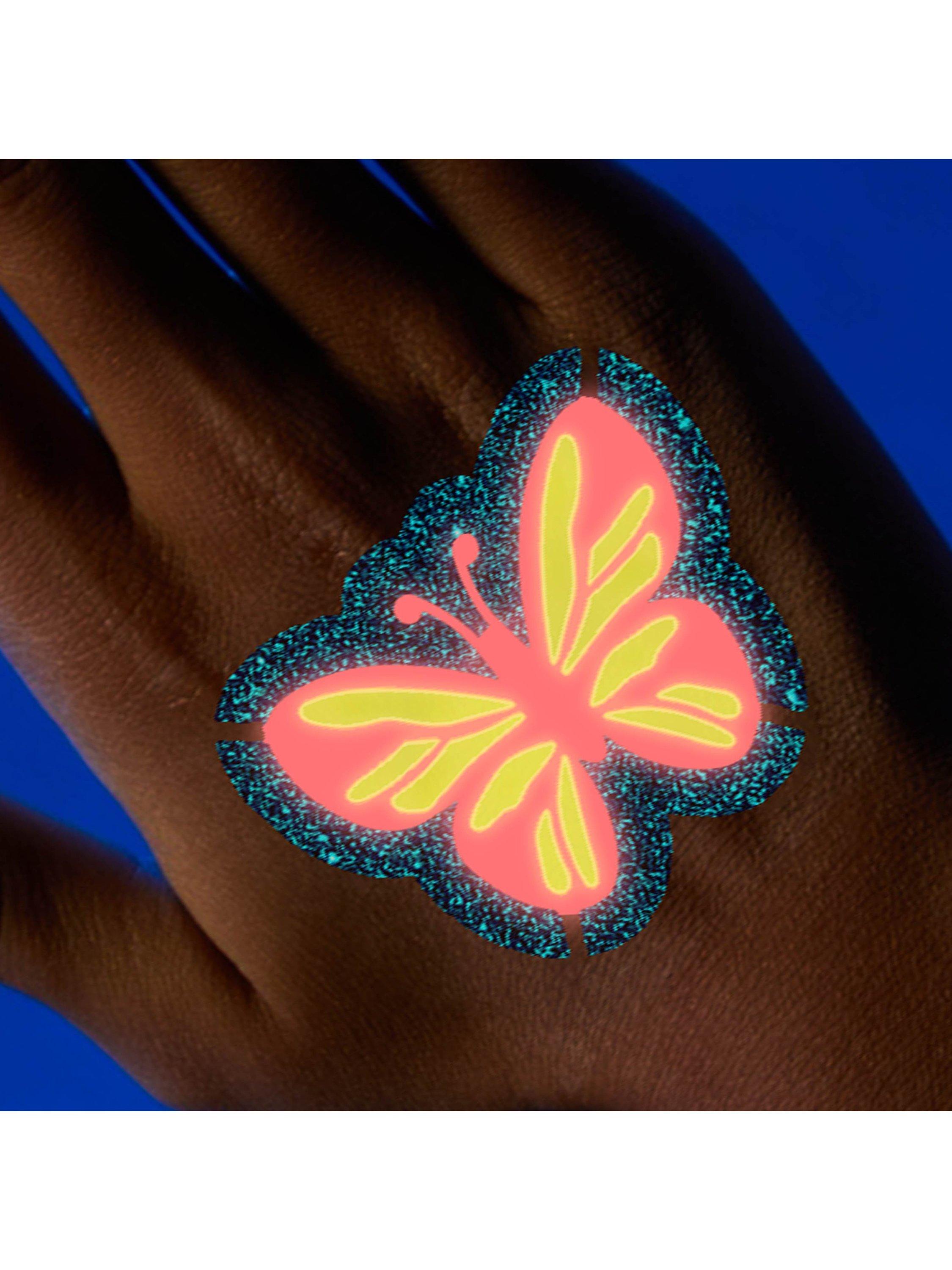 Create amazing, vibrant, glow in the dark and neon designs using hair chalks, glitter tattoos and nail polishes.